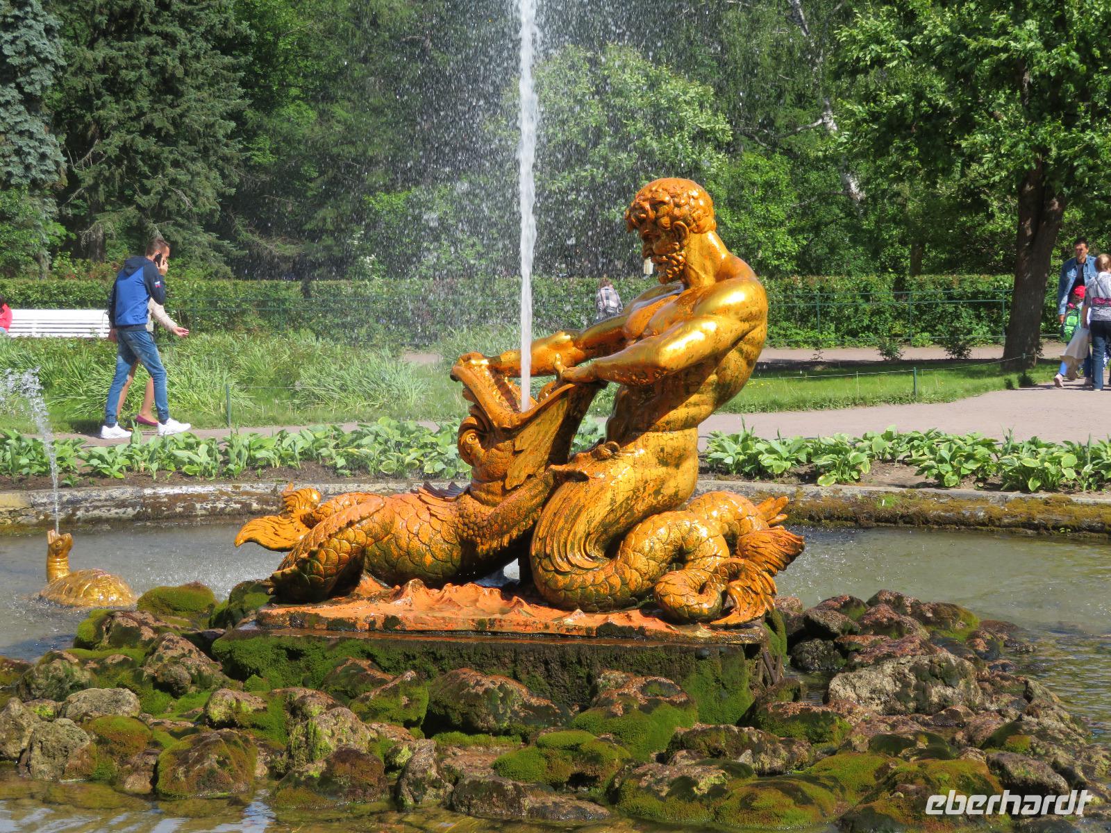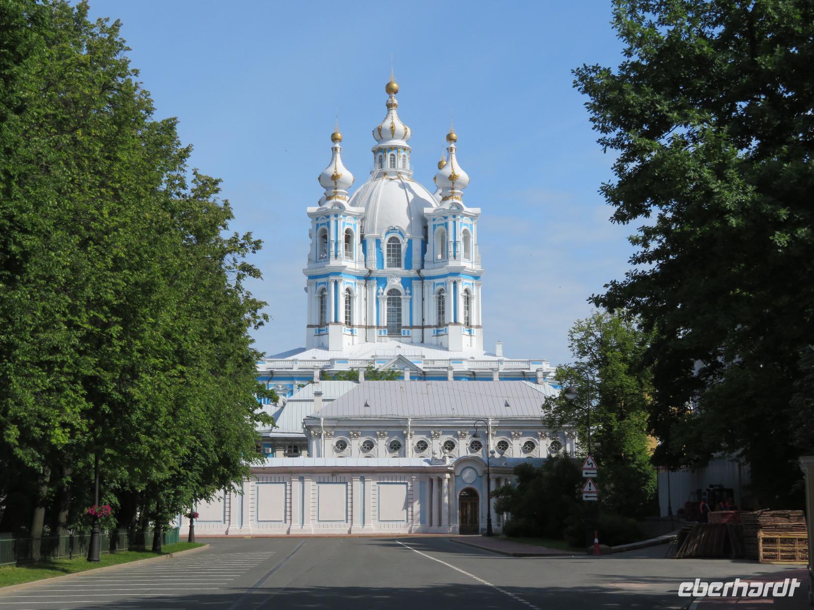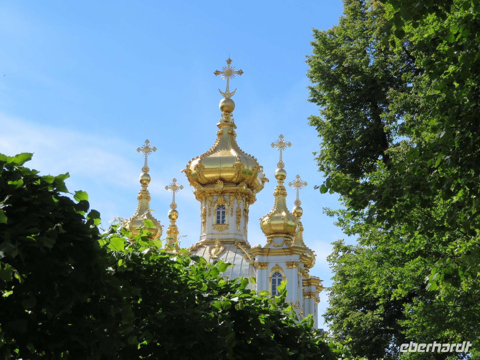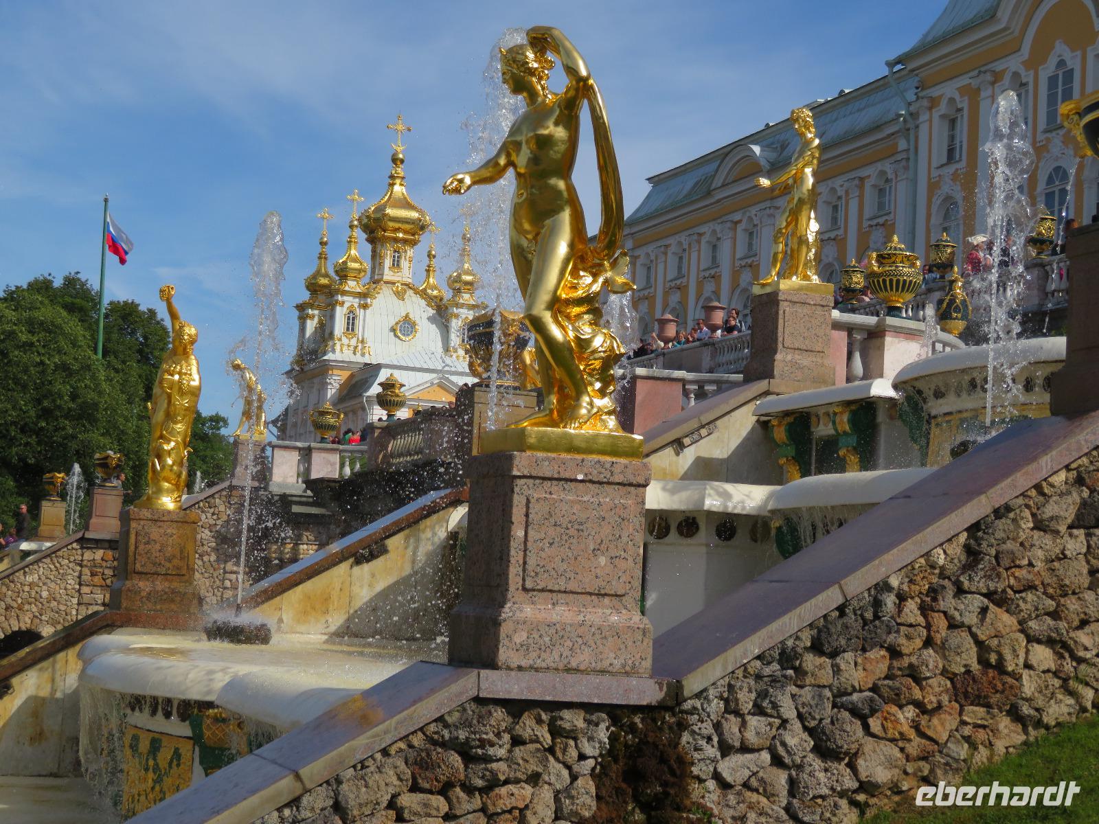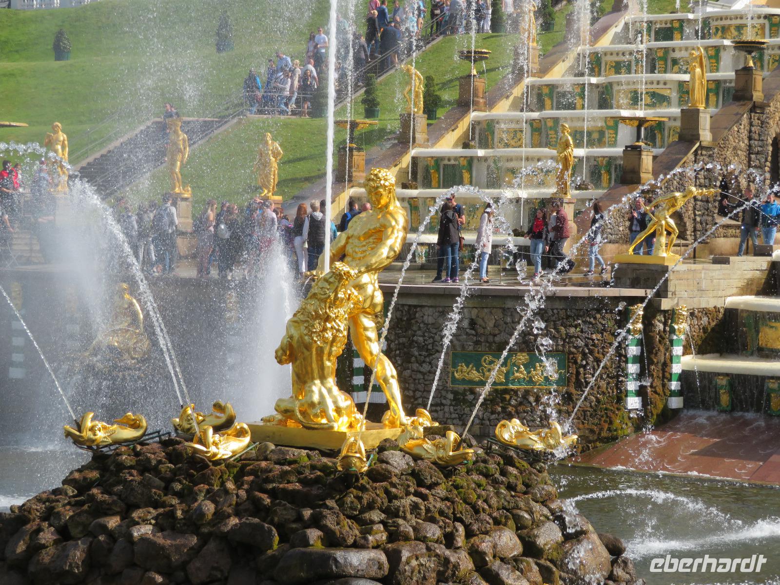 Der akkurat mit 10:37 Uhr zugewiesene Zugang zum Winterpalais ermöglichte uns einen Stopp am Smolny: Ort einer Teerkocherei, eines Mädchenklosters und für romantisierende Bolschewiki-Legenden. Im Strom der Touristen schwammen wir dann mehrere Kilometer durch die Ausstellungsräume eines Museums mit wohl sechzigtausend Ausstellungs- und einigen Millionen Depotgegenständen. In zwei Stunden kann man nur einen kleinen Ausschnitt bei straffer Führung von Timofei sehen: riesige Vasen und Becken aus Halbedelsteinen, Gemälde westeuropäischer Meister, die Galerie der Generäle der russischen Armee im Kampf gegen Napoleon, das von Touristen umlagerte Uhrenspiel oder einfach nur die Säle mit ihrem Goldschmuck. Treff und Fototermin dann an der Alexandersäule auf dem Palaisplatz und zügige Fahrt nach Petrodworez, wo sich mehrere Parkanagen der Zaren befinden, darunter der Peterhof. Bei strahlender Sonne bummelten wir durch den Park mit immer wieder wie neu erscheinenden Goldfiguren und den zahlreichen Fontänen. Am Zugang zur Ostsee mit Blick auf Petersburg mit dem Gazprom-Tower zur Rechten und auf ein Stück Kronstadt zur Linken. Am zeitigen Abend erreichten wir unser Hotel Moskwa und jeder konnte am Abend, wenige Tage vor der Sommersonnenwende, „Weiße Nächte" in St. Petersburg erleben.