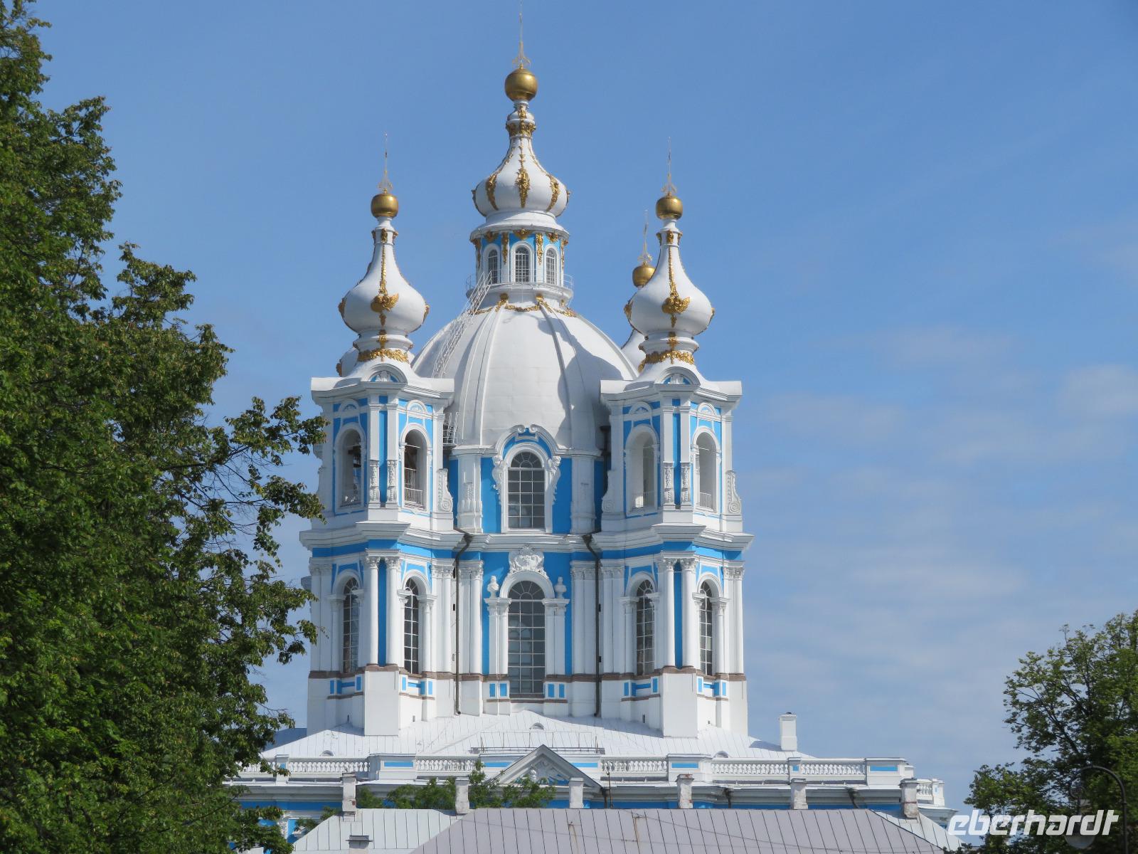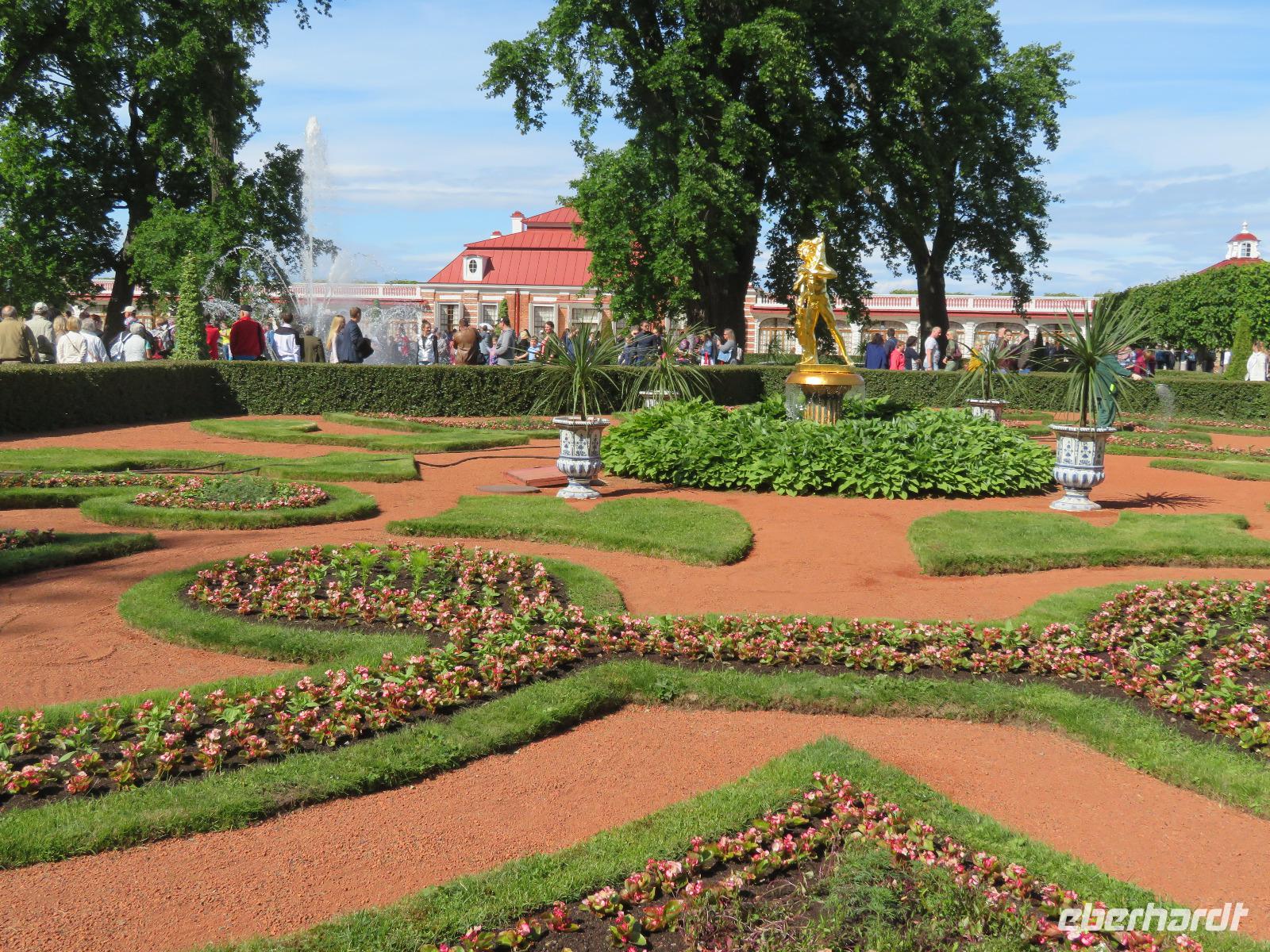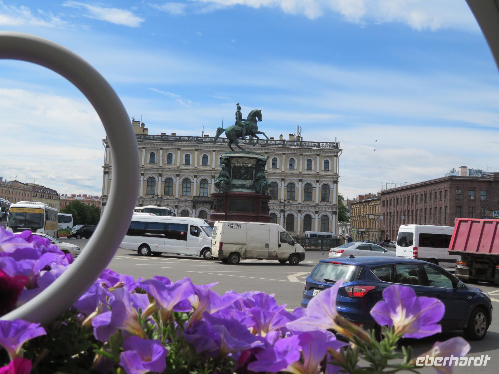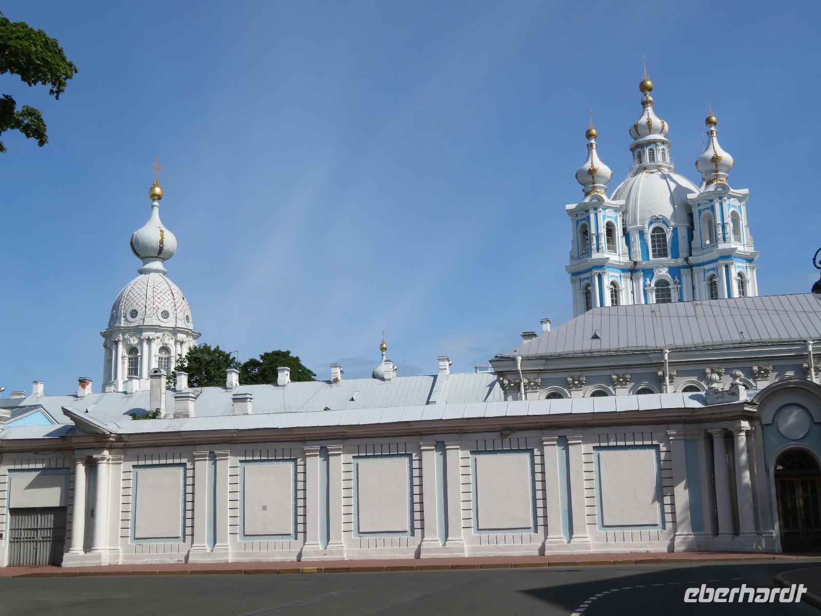 Der akkurat mit 10:37 Uhr zugewiesene Zugang zum Winterpalais ermöglichte uns einen Stopp am Smolny: Ort einer Teerkocherei, eines Mädchenklosters und für romantisierende Bolschewiki-Legenden. Im Strom der Touristen schwammen wir dann mehrere Kilometer durch die Ausstellungsräume eines Museums mit wohl sechzigtausend Ausstellungs- und einigen Millionen Depotgegenständen. In zwei Stunden kann man nur einen kleinen Ausschnitt bei straffer Führung von Timofei sehen: riesige Vasen und Becken aus Halbedelsteinen, Gemälde westeuropäischer Meister, die Galerie der Generäle der russischen Armee im Kampf gegen Napoleon, das von Touristen umlagerte Uhrenspiel oder einfach nur die Säle mit ihrem Goldschmuck. Treff und Fototermin dann an der Alexandersäule auf dem Palaisplatz und zügige Fahrt nach Petrodworez, wo sich mehrere Parkanagen der Zaren befinden, darunter der Peterhof. Bei strahlender Sonne bummelten wir durch den Park mit immer wieder wie neu erscheinenden Goldfiguren und den zahlreichen Fontänen. Am Zugang zur Ostsee mit Blick auf Petersburg mit dem Gazprom-Tower zur Rechten und auf ein Stück Kronstadt zur Linken. Am zeitigen Abend erreichten wir unser Hotel Moskwa und jeder konnte am Abend, wenige Tage vor der Sommersonnenwende, „Weiße Nächte" in St. Petersburg erleben.