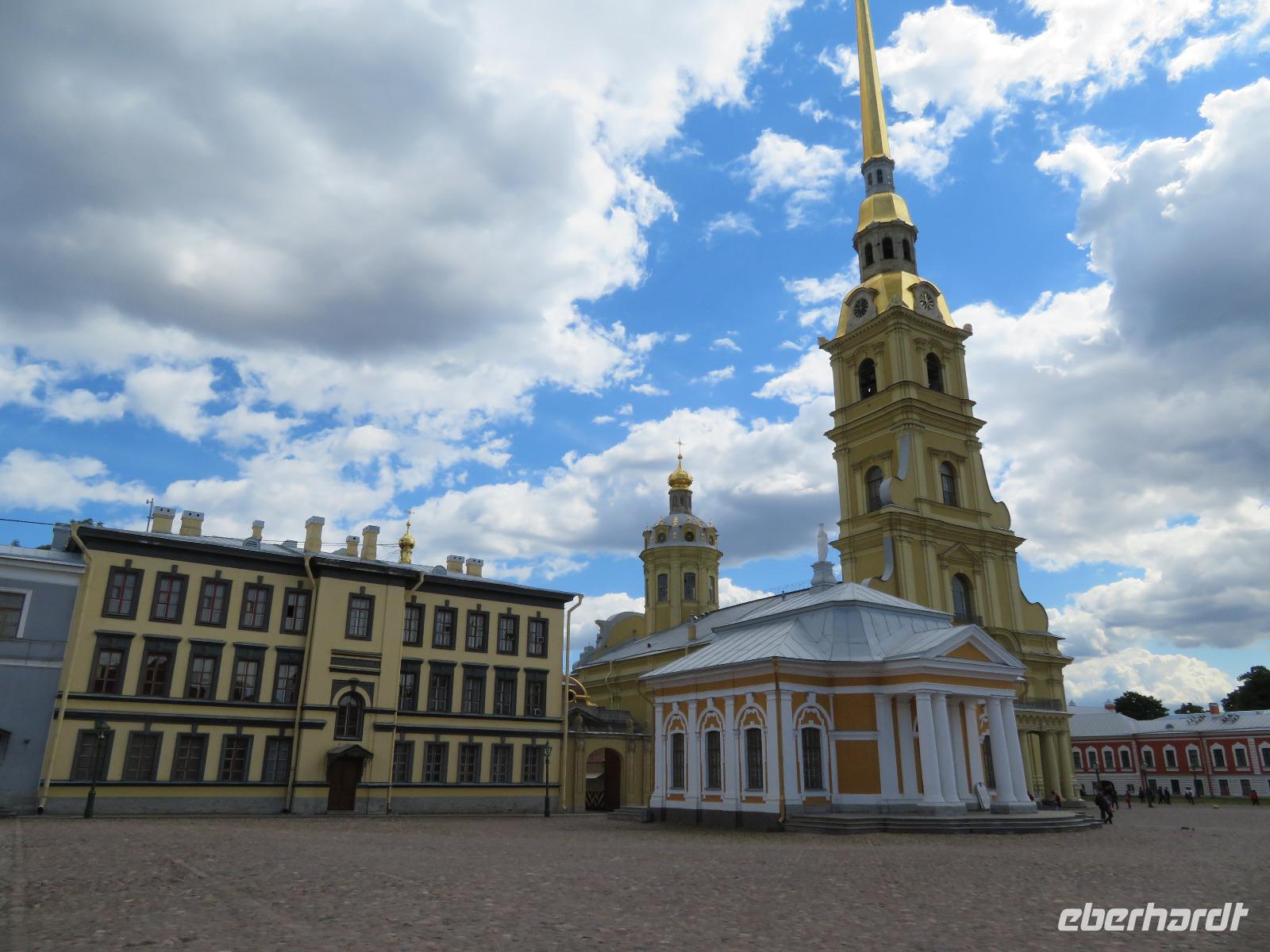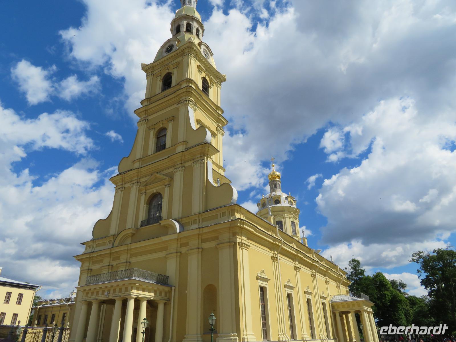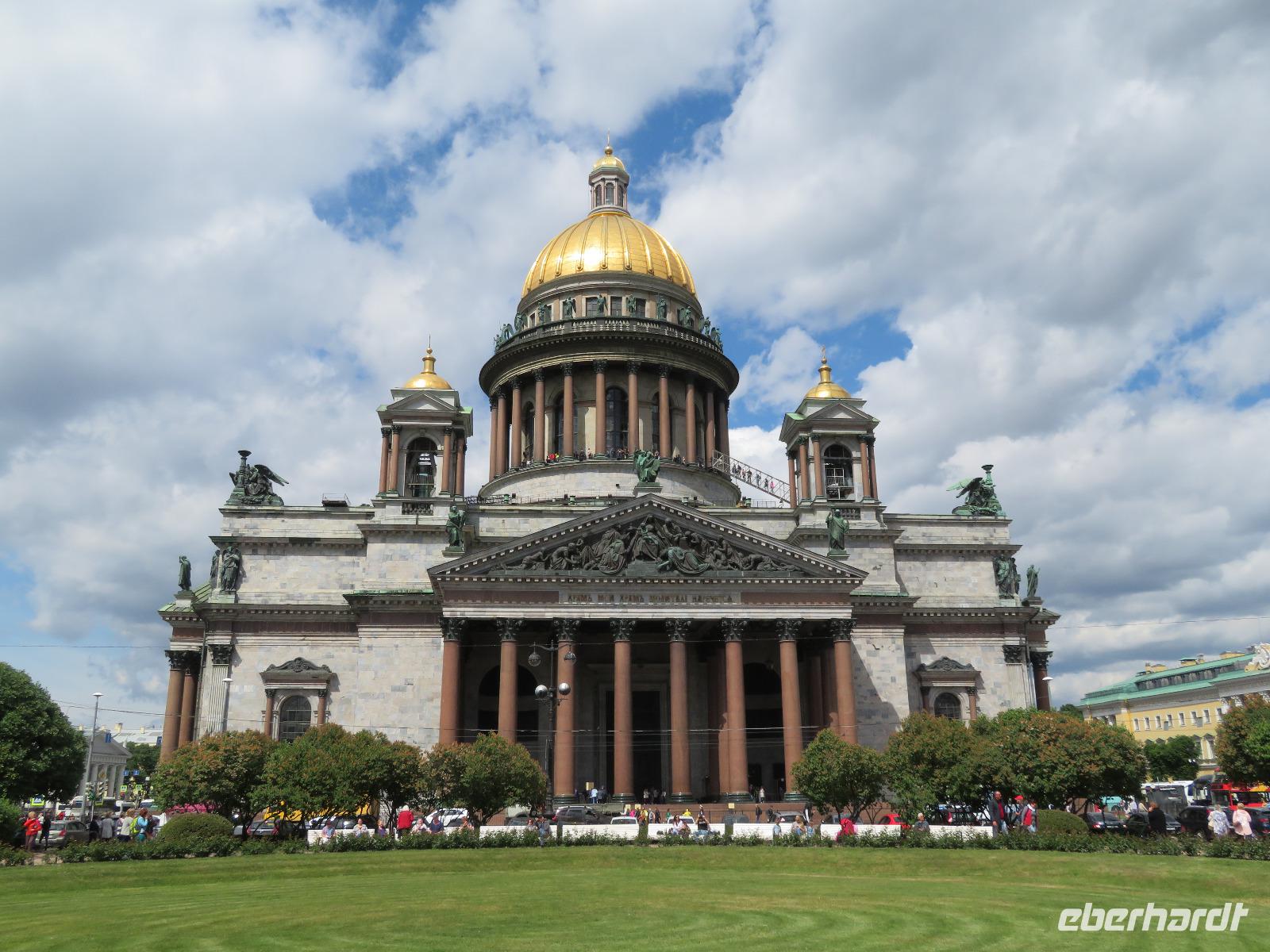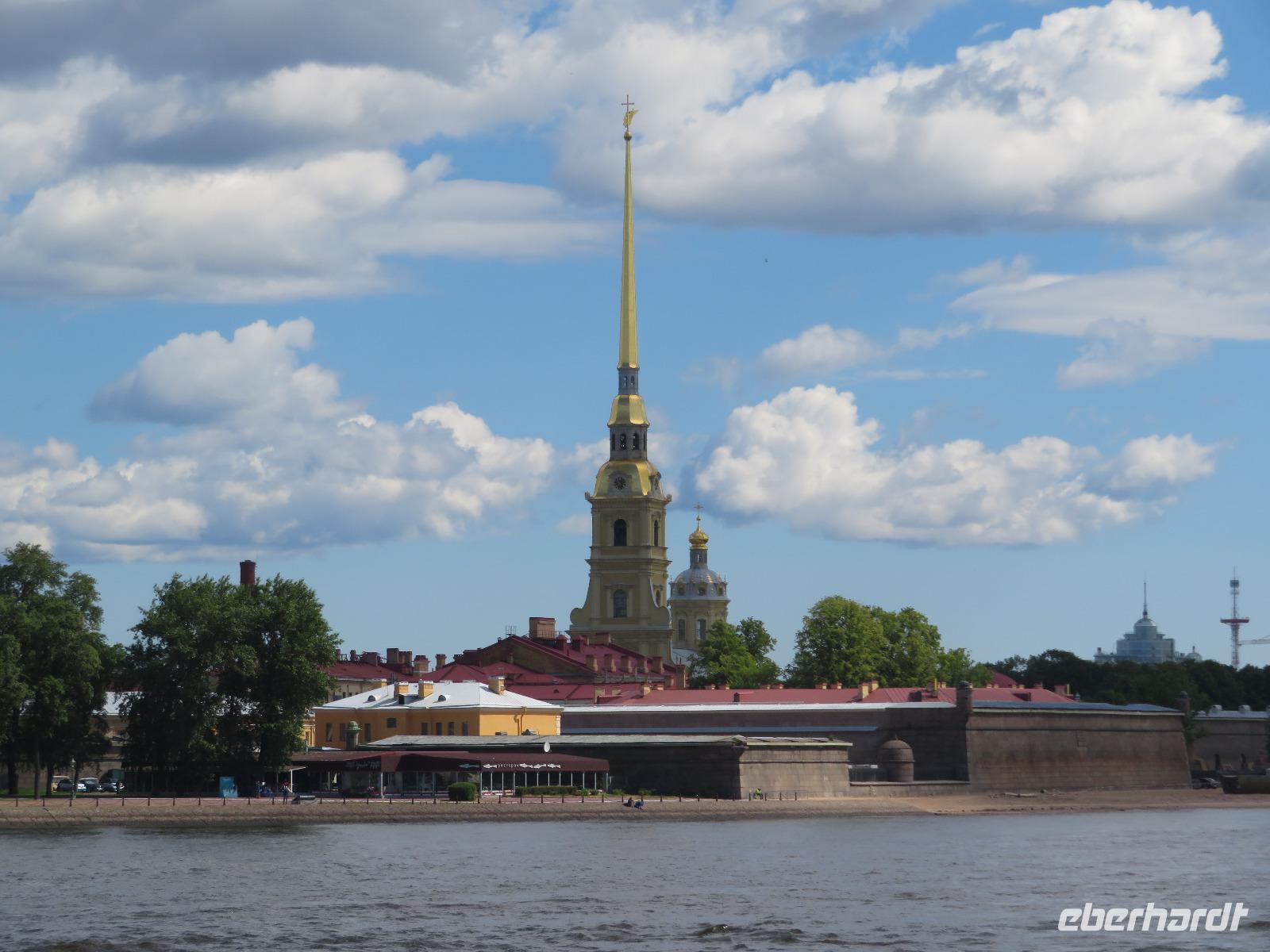 Die Lage des Hotels „Moskwa" am östlichen Ende des Newski-prospektes ermöglchte es uns, über den Newski-Prospekt Richtung Palais-Platz zu fahren, diesen rechts liegen zu lassen und die Kirche „Auf dem Blute" anzusteuern - ein erster Fotostopp. Ein zweiter erfolgte an der „Aurora" - Otsdeutschen aus dem Geschichtsunterricht allbekannt.... Der dritte Stopp dann an der Strelka, Landzunge mit den Leuchttürmen zum alten Hafen voller Schiffsbugs. Unsere erste Besichtigung galt der Peter und Pauls Festung mit jener Kirche, in der die Särge der Romanows aufgebahrt sind. Von dieser Kirche hinüber zur Isaac-Kethedrale, einer der drei Lawras der orthodoxen Kirche. Einst eher durch da Faucoultsche Pendel bekannt, erstrahlt sie nun in religiösem Glanz.