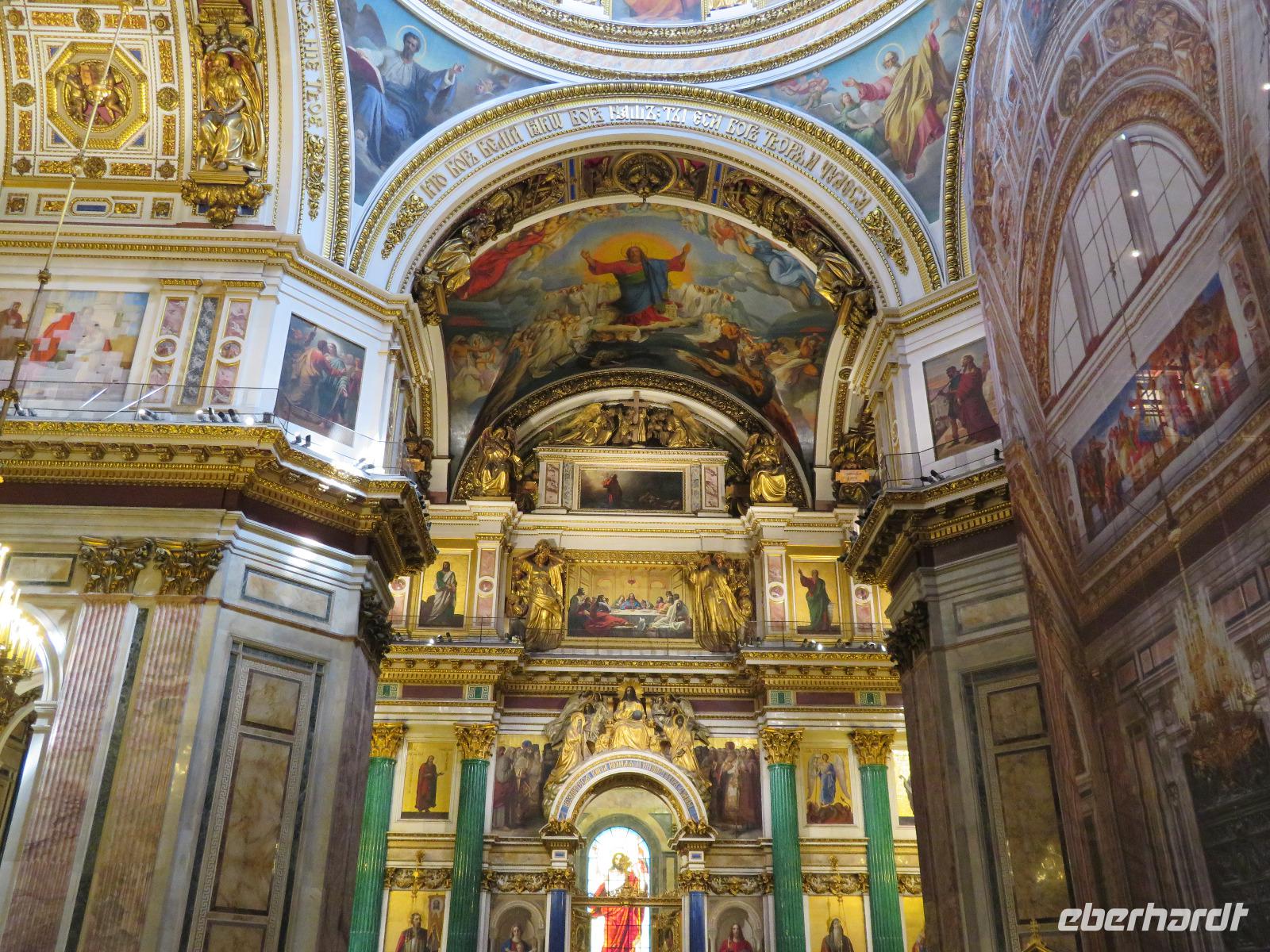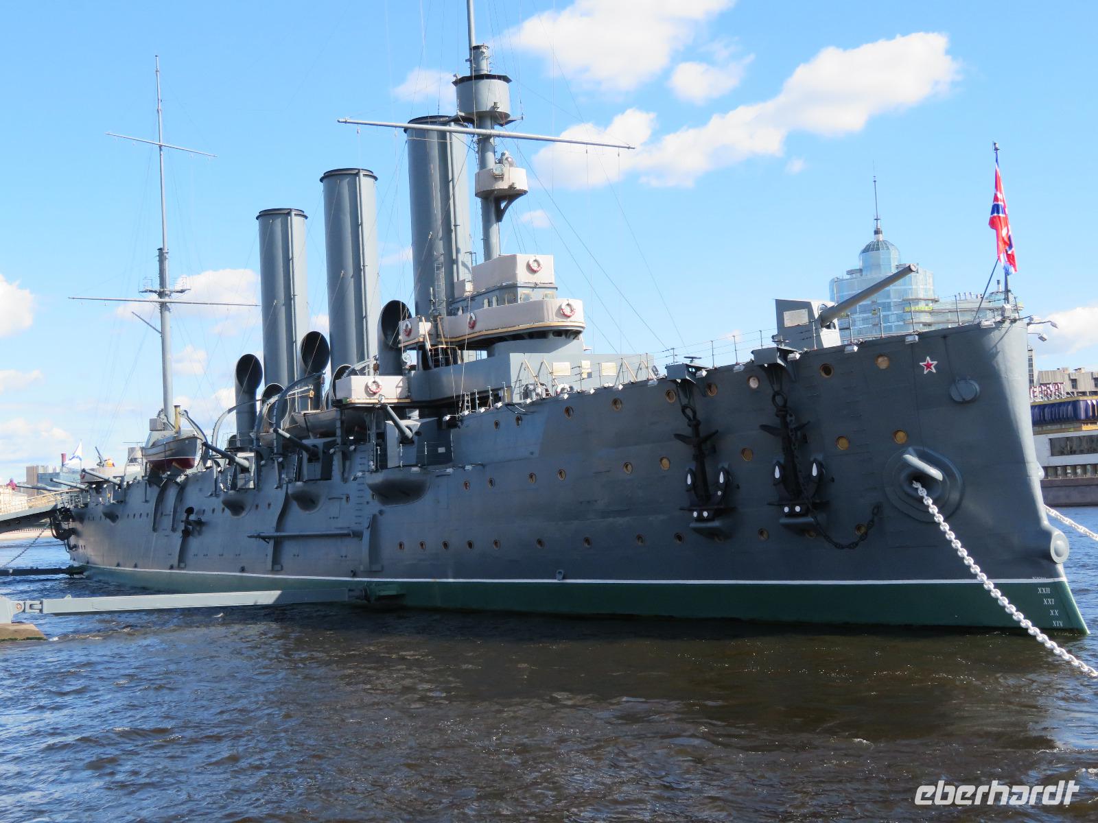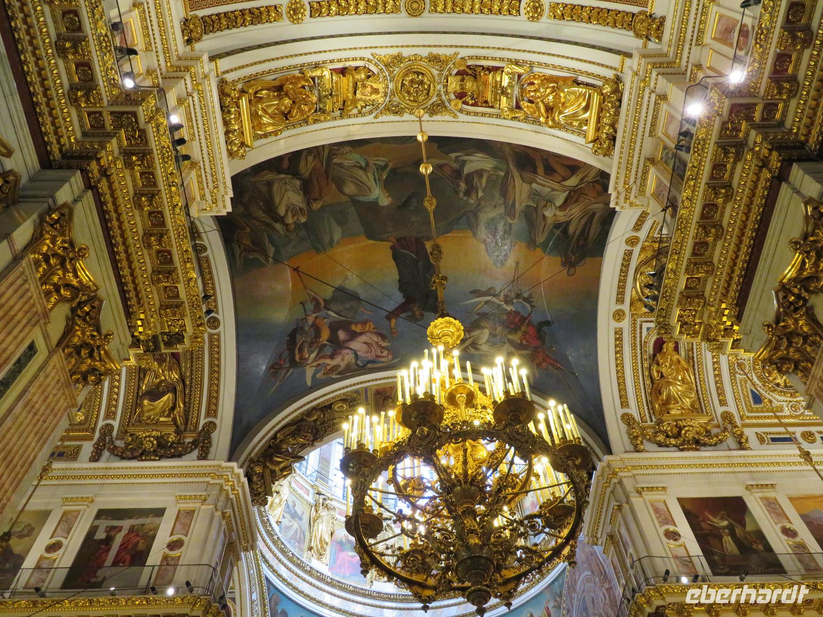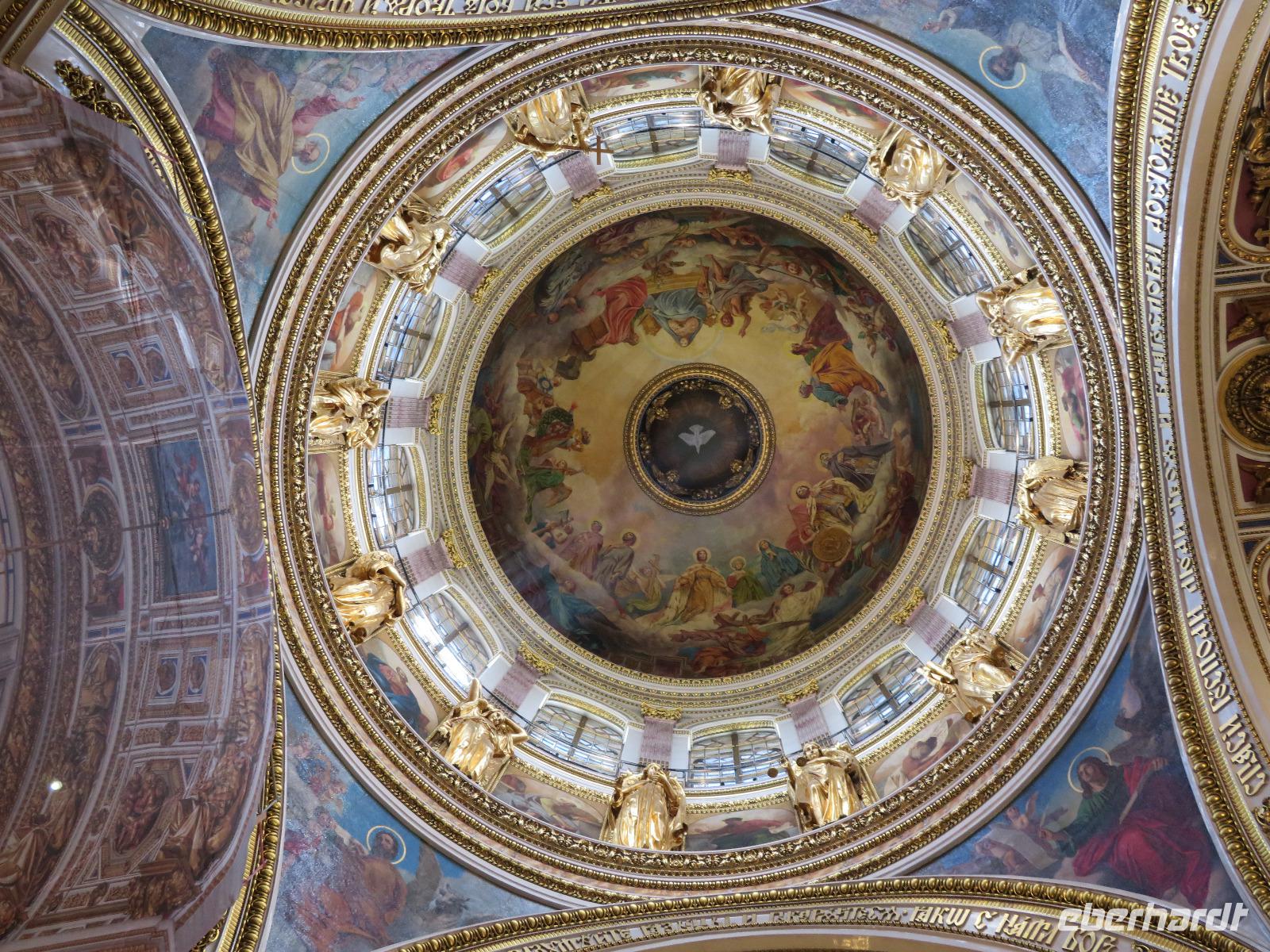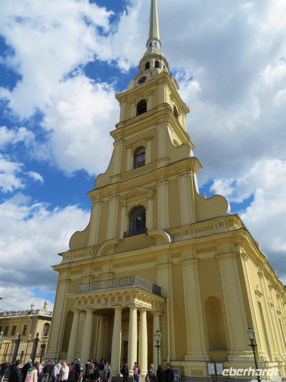 Die Lage des Hotels „Moskwa" am östlichen Ende des Newski-prospektes ermöglchte es uns, über den Newski-Prospekt Richtung Palais-Platz zu fahren, diesen rechts liegen zu lassen und die Kirche „Auf dem Blute" anzusteuern - ein erster Fotostopp. Ein zweiter erfolgte an der „Aurora" - Otsdeutschen aus dem Geschichtsunterricht allbekannt.... Der dritte Stopp dann an der Strelka, Landzunge mit den Leuchttürmen zum alten Hafen voller Schiffsbugs. Unsere erste Besichtigung galt der Peter und Pauls Festung mit jener Kirche, in der die Särge der Romanows aufgebahrt sind. Von dieser Kirche hinüber zur Isaac-Kethedrale, einer der drei Lawras der orthodoxen Kirche. Einst eher durch da Faucoultsche Pendel bekannt, erstrahlt sie nun in religiösem Glanz.