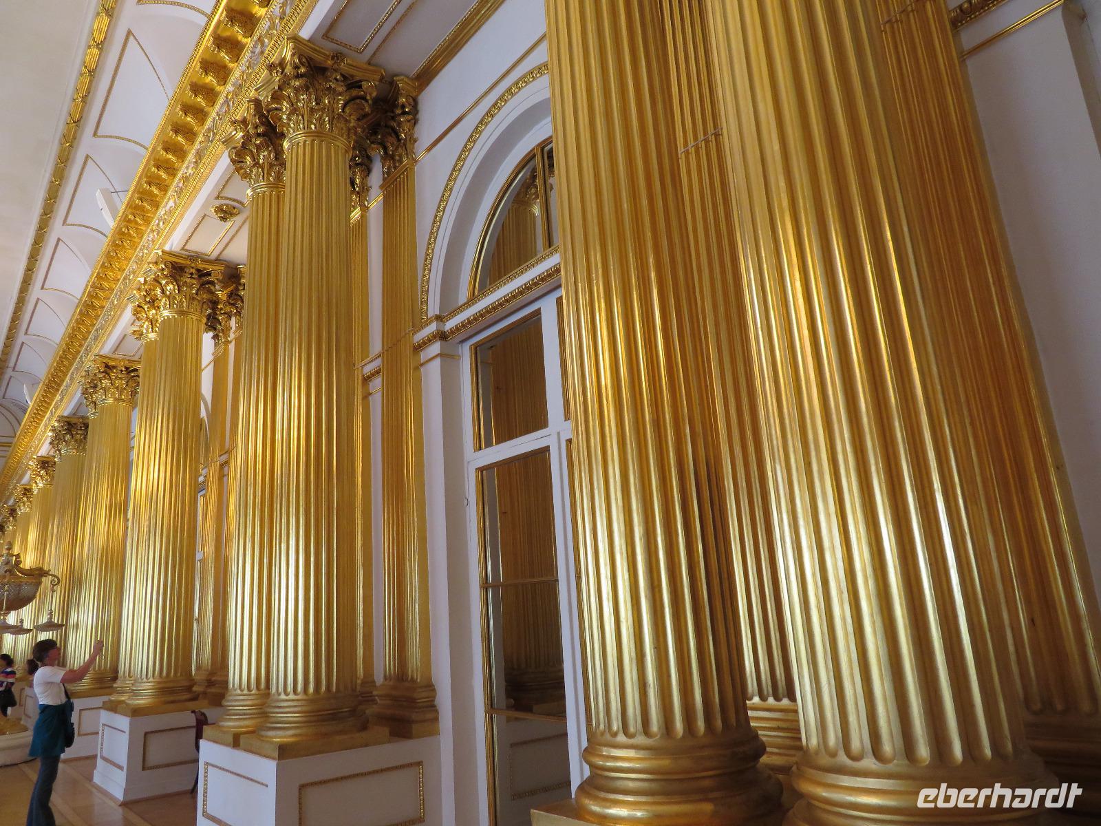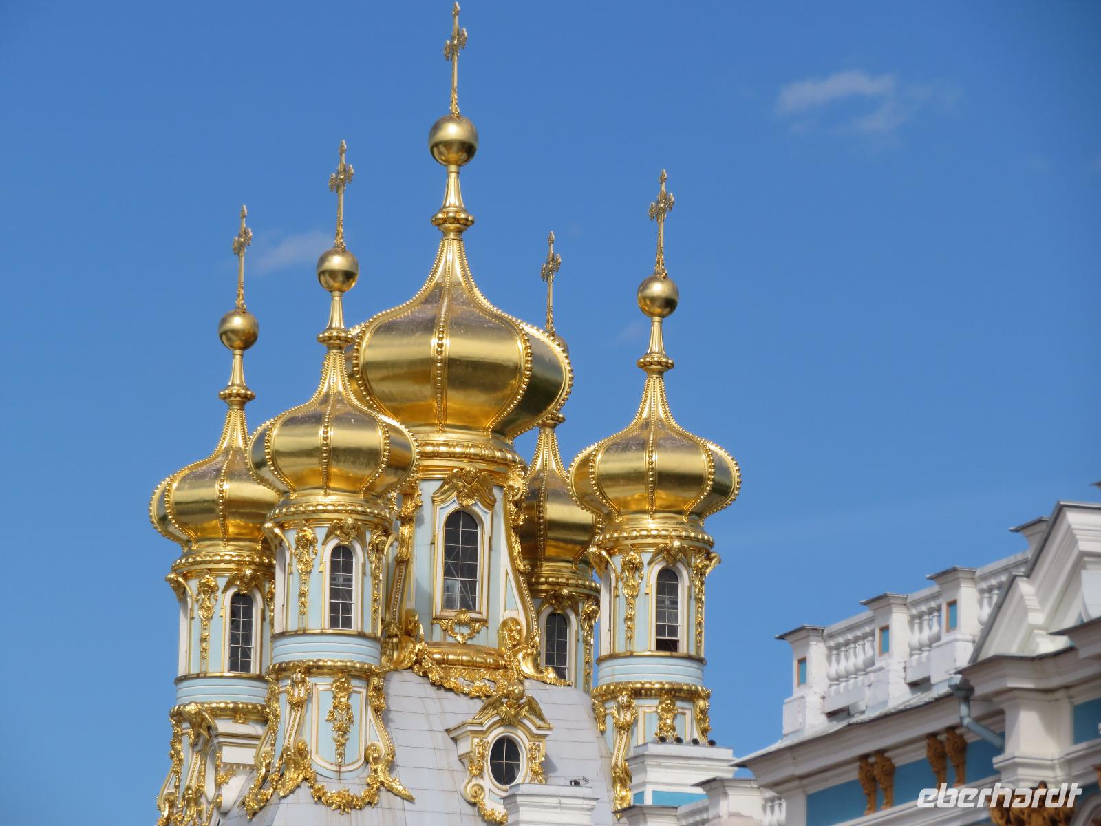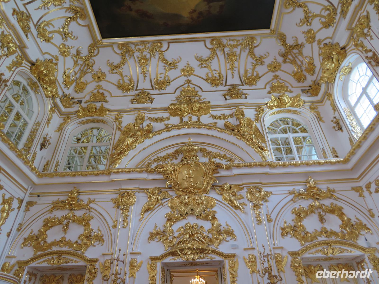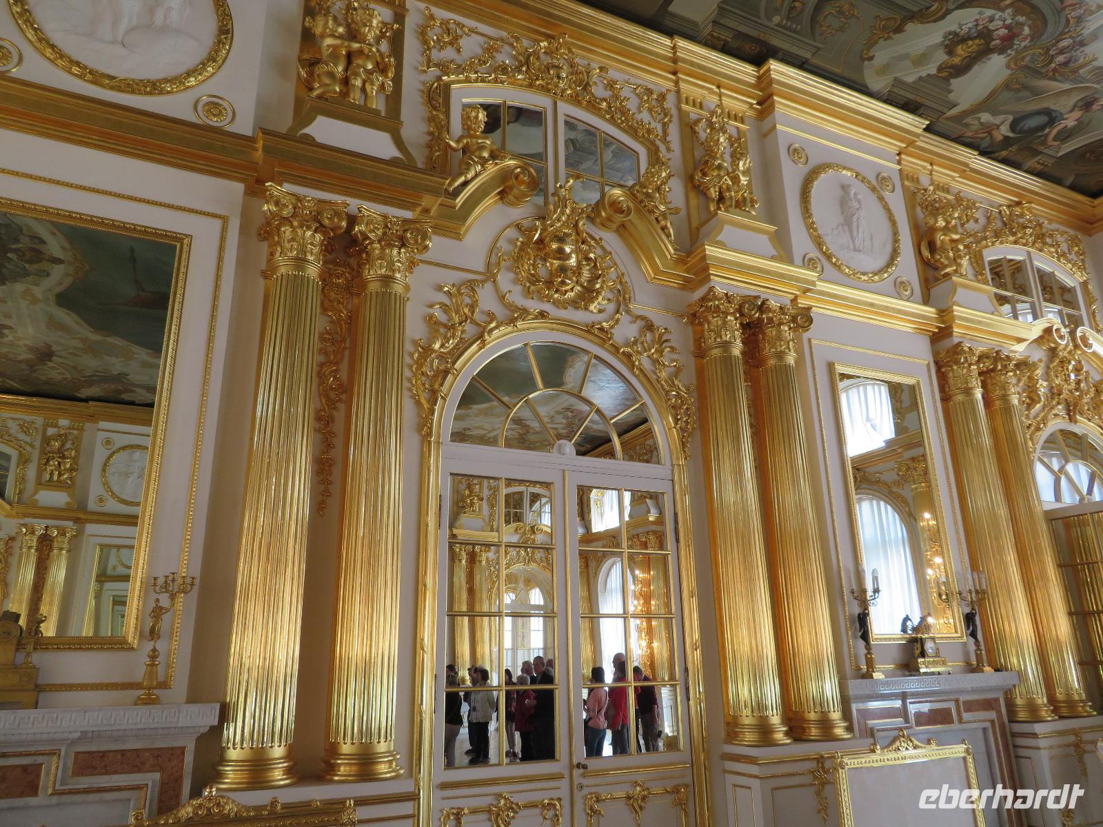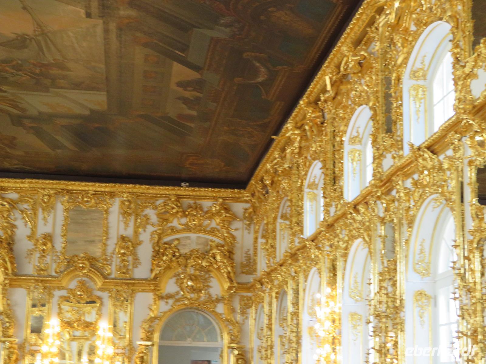 Eine fakultative Bootstour führte über Moika, Newa, Fontanka und Kanal vorbei an all den Adelspalästen, die russische Geschichte schrieben. In zügiger Fahrt erreichten wir über eine neue Stadtautobahn, ab Pulkowo ein wenig im Stau der Datschenausflügler, Puschkin. Das Katharinenschloss im einstigen Zarskoje Selo, gehört sicher zu den eindrucksvollsten Palästen des Barock. Das Bernsteinzimmer als einstiges Geschenk des Preußenkönigs an den russischen Zaren - ein Beispiel gutnachbarlicher Diplomatie ...