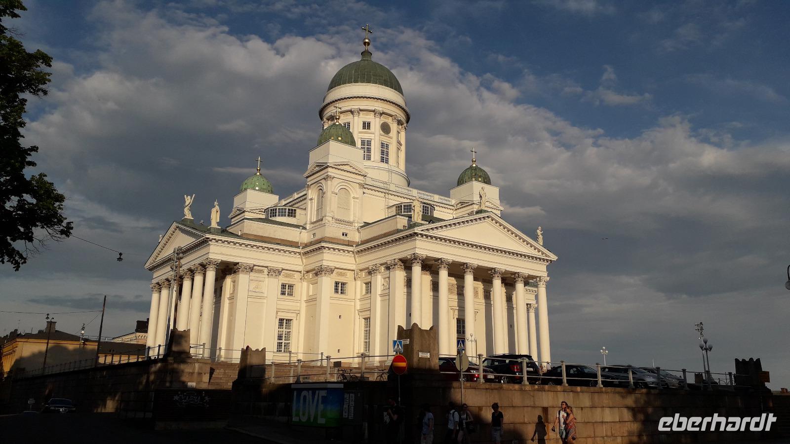 Um halbneun fuhren wir entlang des Finnischen Meerbusens Richtung Helsinki. Aus der Stadt hinaus begleitete uns Lisa, die hübsche Cousine unseres Reiseführers Timo, den wir am Vorabend verabschiedet hatten. An der russischen Grenze erwartete uns ein korrekt und zügig arbeitender Beamtenapparat. Leider fehlte uns ein Papier, das wohl bei der Einreise einbehalten worden war und so dauerte die Prozedur über vier Stunden. Wir haben aber das Mittag im Bus bereitet und behielten einfach die Ruhe. Erst gegen halbsieben erreichten wir in Helsinki das zentral im alten Hafen gelegene Hotel Grand Marina, wo wir sofort einchecken und zu Abend essen konnten. Danach konnten viele Gäste bei schönster Abendsonne auf einem Spaziergang mit dem Reiseleiter die Innenstadt erkunden. Erst um halbzehn trudelten wir wieder im Hotel ein.