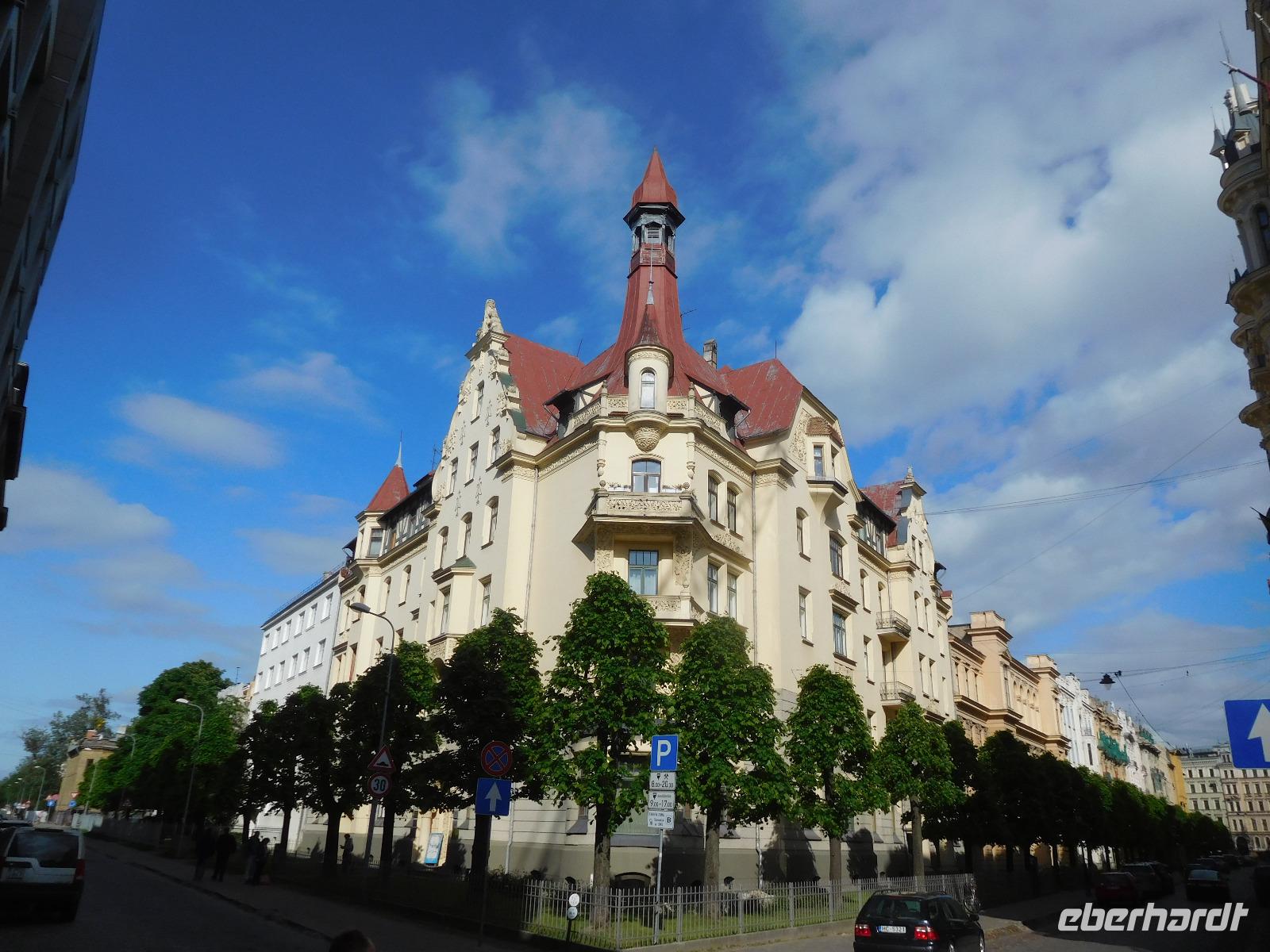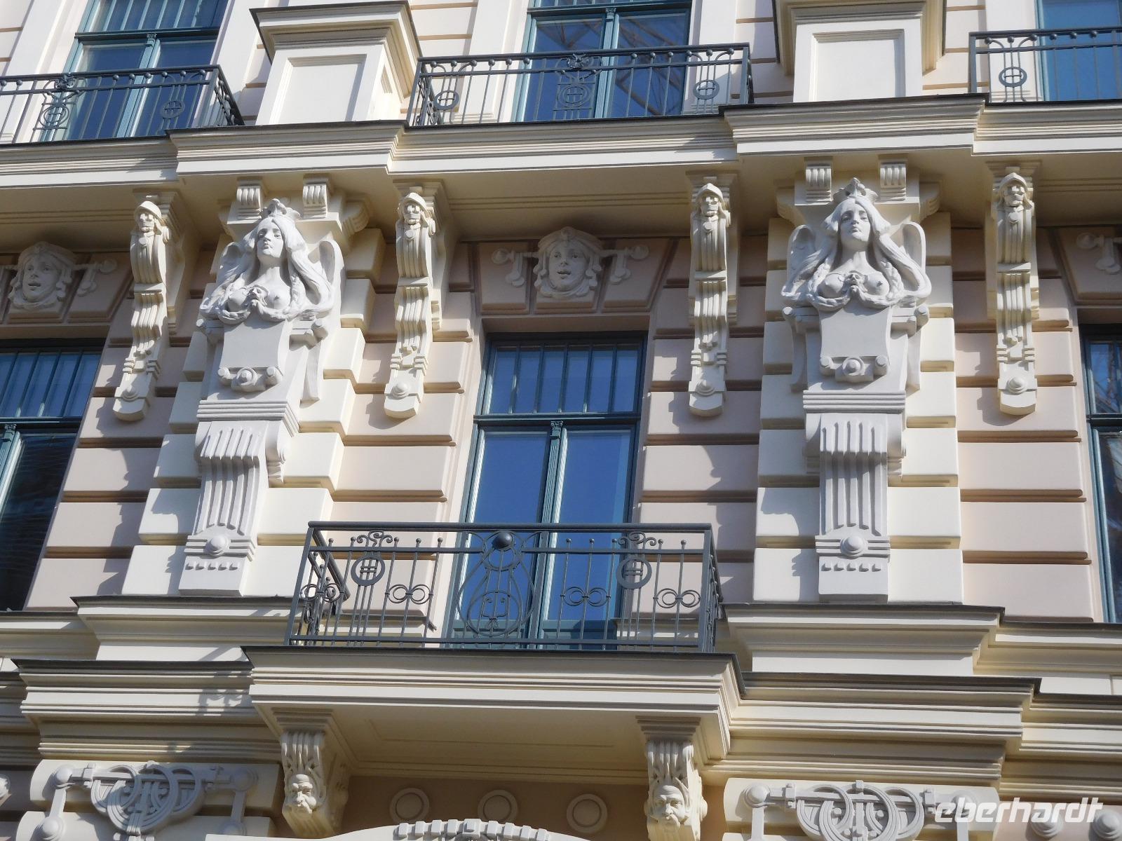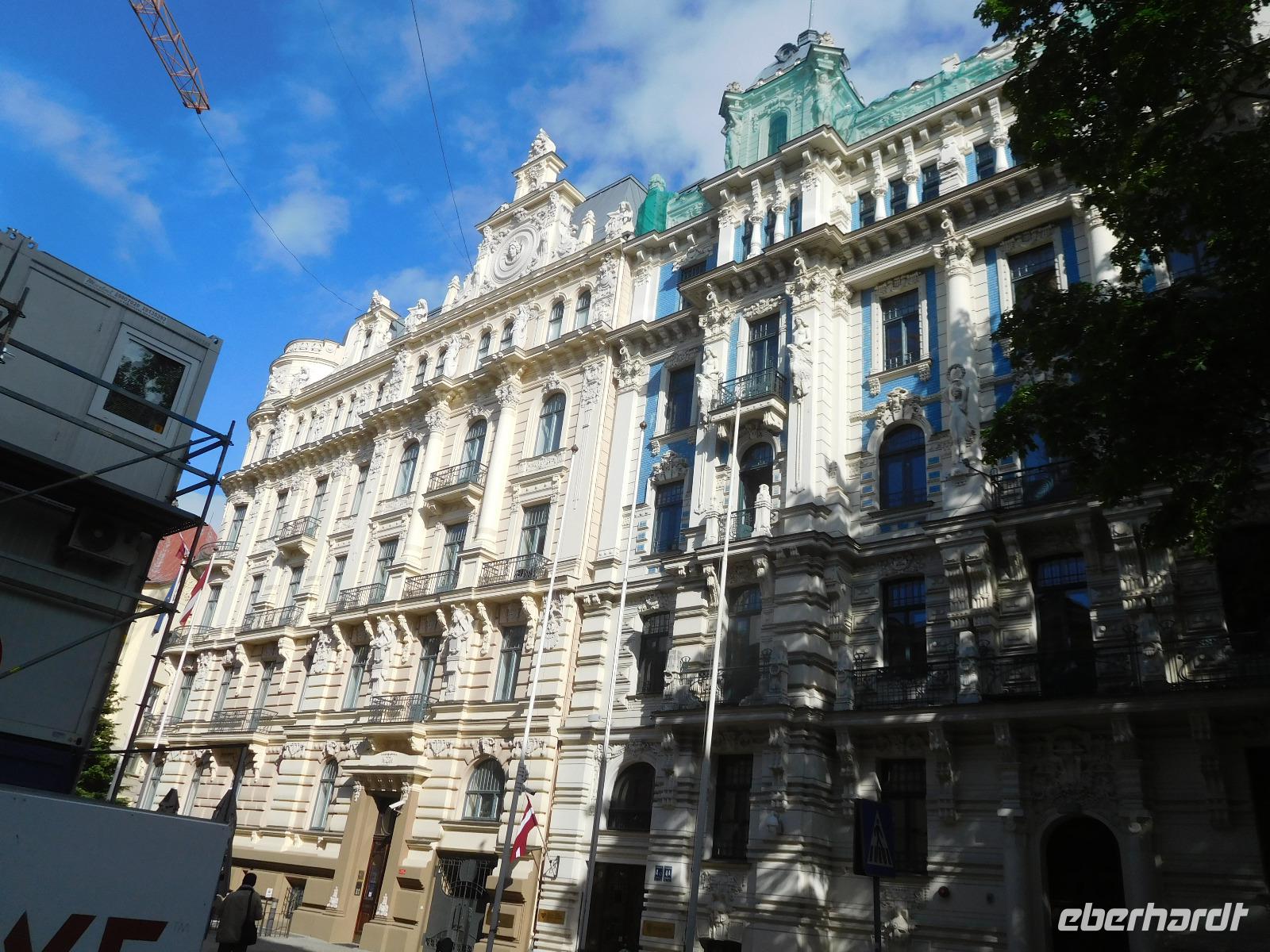 Nach einem weiteren Wegstück besichtigten wir Rundale, den wohl bedeutendsten adligen Landsitz in den drei baltischen Republiken. Graf Biron, Geliebter und Günstling zweier Zarinnen, hatte ihn für seine Gattin Dorothea von Kurland gebaut, die als schönste und geistreichste Frau ihrer Zeit galt. Jeder Raum ein Unikat, bildet das Schloss ein selten erhaltenes spätbarockes Ensemble. Unter der Regierung von Zarin Elisabeth war Biron in Ungnade gefallen und musste in Festungshaft. Der Besitz ging an Prinz Carl, den Sohn des polnischen Königs aus dem Haus Wettin, August III., also an einen Enkel des starken August. Der verlor wieder alles unter Katharina der Großen, die ihrem Geliebten Suchanow das Anwesen überschrieb. Letztendlich ging wieder alles an die Bironschen Erben zurück, die dann alles verloren, als Lettland eine Sowjetrepublik wurde. Noch heute führt ein in München lebender Familienzweig den Titel eines Herzogs von Kurland. Gegen 17 Uhr waren wir in Riga und fuhren gleich mit dem Bus ins berühmte Jugendstilviertel. Wir schlenderten durch die Elisabeth- und die Albert-, sowie die Schützenstraße, wo die schönsten und mittlerweile gut sanierten Bauten zu finden sind. Die markantesten stammen von Michael Eisenstein und seinem als Filmregisseur weltbekannten Sohn Sergej.