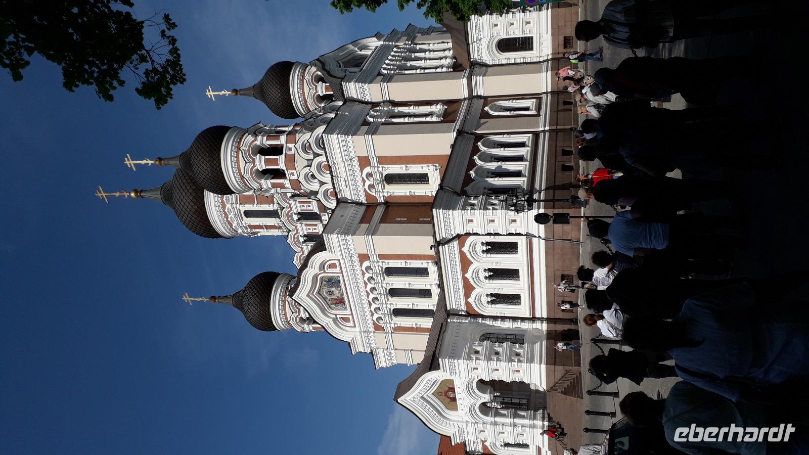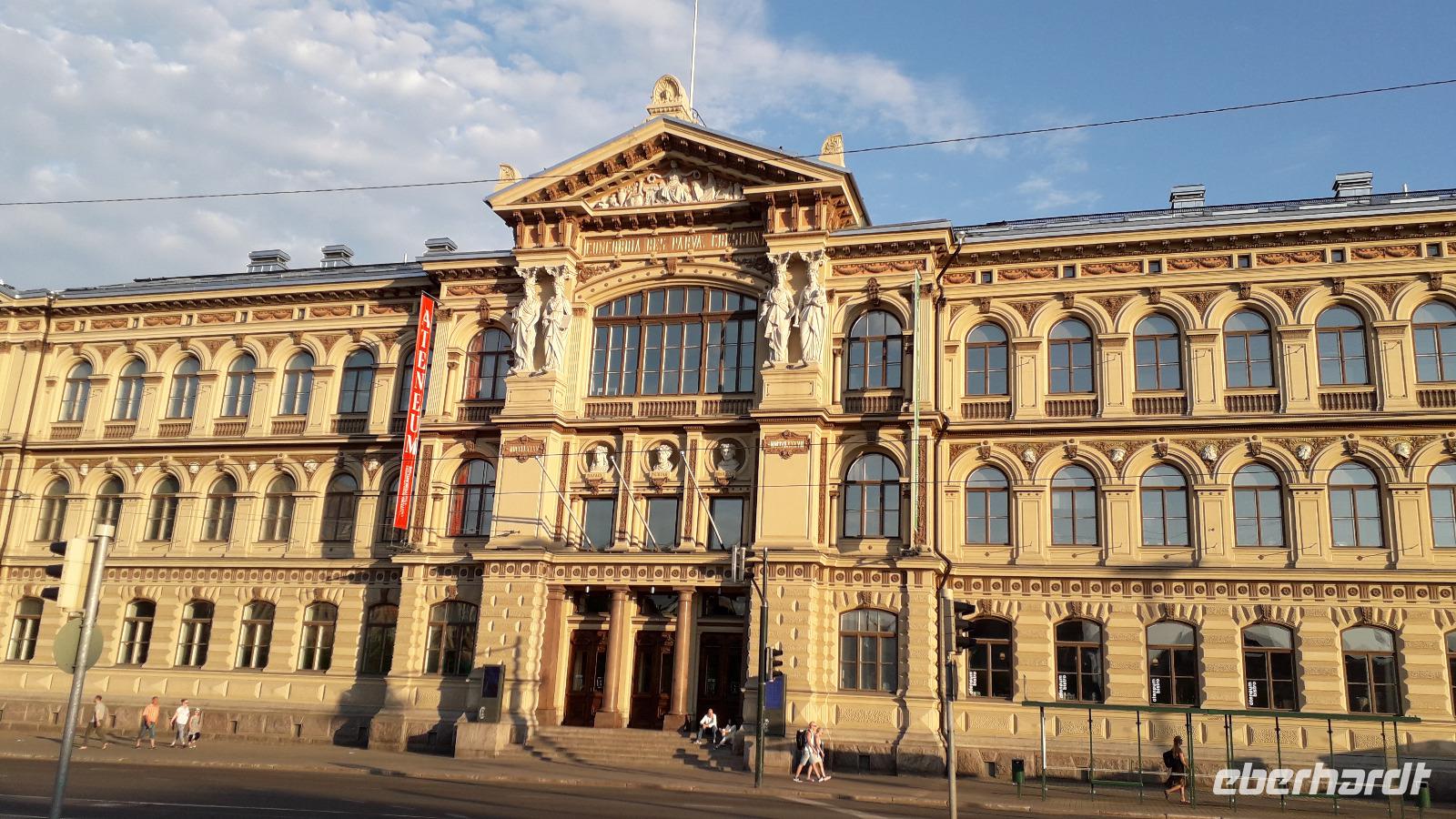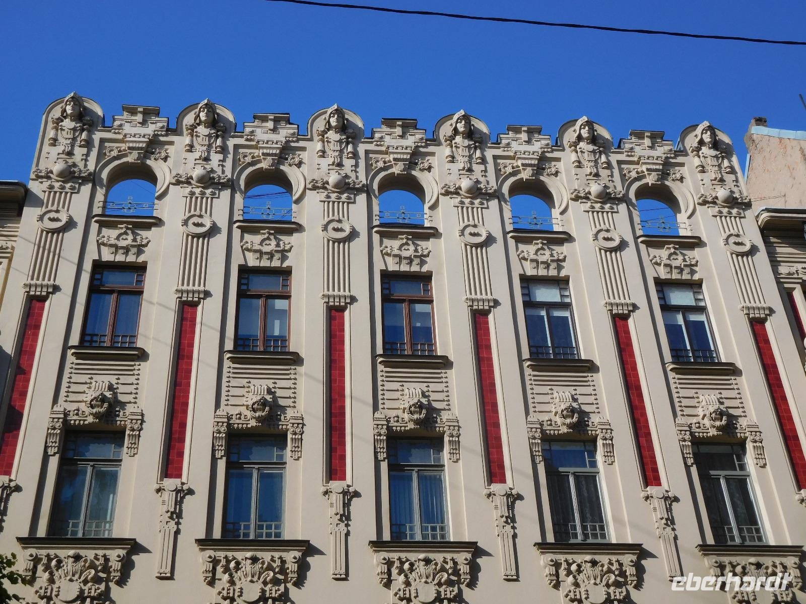 Nach einem weiteren Wegstück besichtigten wir Rundale, den wohl bedeutendsten adligen Landsitz in den drei baltischen Republiken. Graf Biron, Geliebter und Günstling zweier Zarinnen, hatte ihn für seine Gattin Dorothea von Kurland gebaut, die als schönste und geistreichste Frau ihrer Zeit galt. Jeder Raum ein Unikat, bildet das Schloss ein selten erhaltenes spätbarockes Ensemble. Unter der Regierung von Zarin Elisabeth war Biron in Ungnade gefallen und musste in Festungshaft. Der Besitz ging an Prinz Carl, den Sohn des polnischen Königs aus dem Haus Wettin, August III., also an einen Enkel des starken August. Der verlor wieder alles unter Katharina der Großen, die ihrem Geliebten Suchanow das Anwesen überschrieb. Letztendlich ging wieder alles an die Bironschen Erben zurück, die dann alles verloren, als Lettland eine Sowjetrepublik wurde. Noch heute führt ein in München lebender Familienzweig den Titel eines Herzogs von Kurland. Gegen 17 Uhr waren wir in Riga und fuhren gleich mit dem Bus ins berühmte Jugendstilviertel. Wir schlenderten durch die Elisabeth- und die Albert-, sowie die Schützenstraße, wo die schönsten und mittlerweile gut sanierten Bauten zu finden sind. Die markantesten stammen von Michael Eisenstein und seinem als Filmregisseur weltbekannten Sohn Sergej.