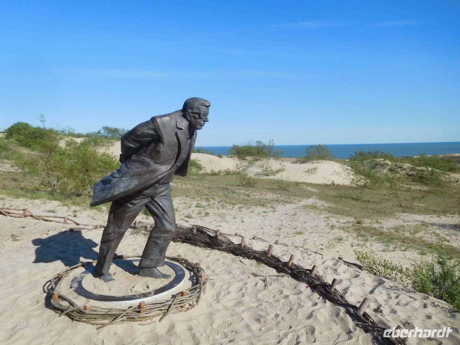 Auf der litauischen Seite wartete schon unsere baltische Führerin Wanda und mit ihr fuhren wir sofort zur hohen Düne mit einer von Ethnologen errichteten Sonnenuhr und dem Denkmal von Jean Paul Sartre. Dann ging es zum Hotel, wo es das Abendessen gab. Das Hotel, das Ende des 19. Jahrhunderts von dem bekannten Mäzen Hermann Blode, dem Begründer der Künstlerkolonie in Nidden, erbaut wurde, hat ein ganz besonderes Flair. Nach dem leckeren Abendessen hatte der Reiseleiter noch eine Bootsfahrt auf dem spiegelglatten Wasser des kurischen Haffs organisiert. Das Boot fuhr bis an die höchste Düne, die im Grenzgebiet ist und vom Land nicht betreten werden darf. Stimmungsvoll wirkte das Haff in den letzten Sonnenstrahlen und ein guter litauischer Kräuterschnaps ließ wohlige Stimmung aufkommen.