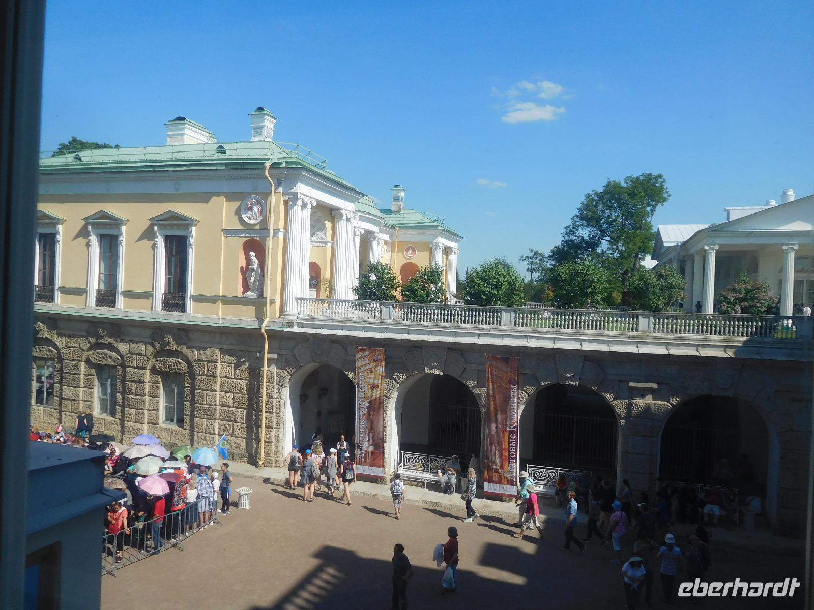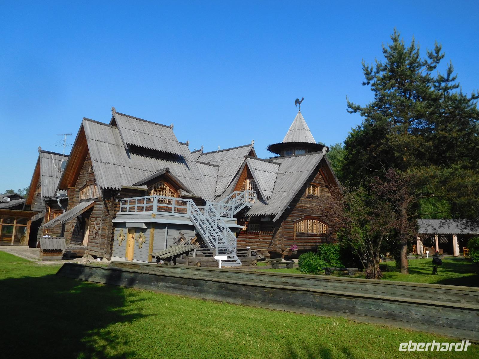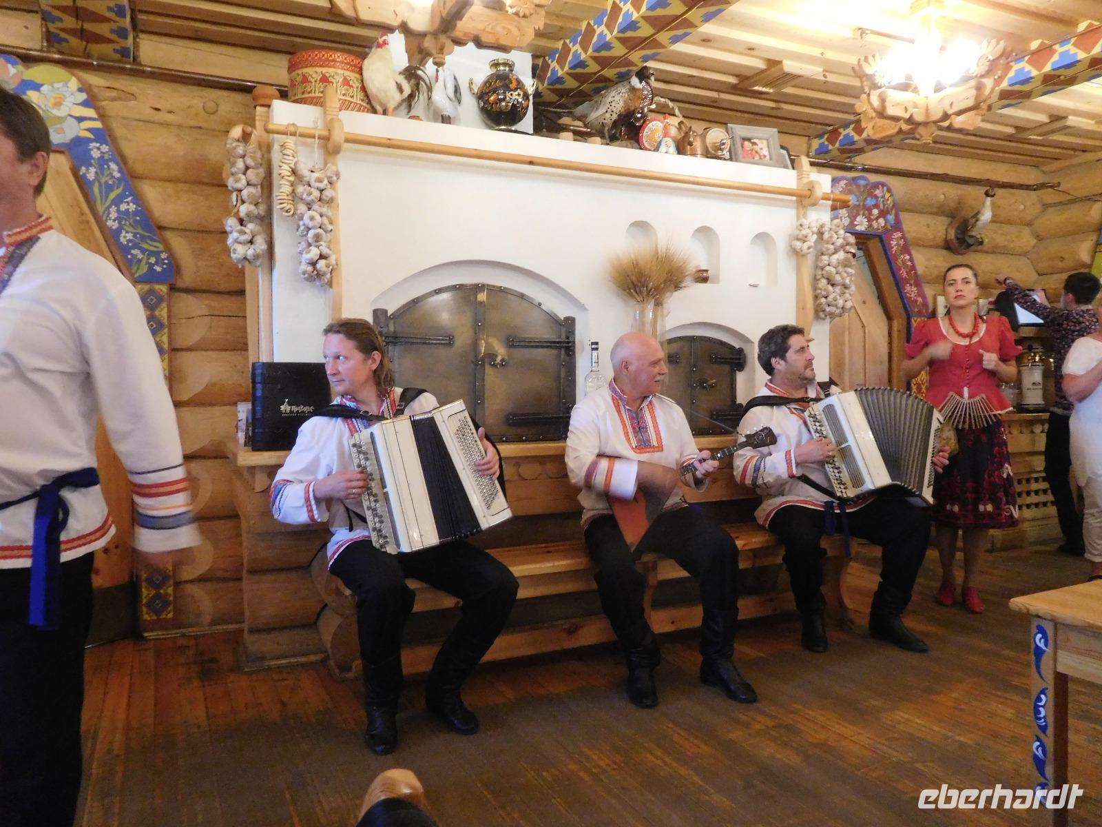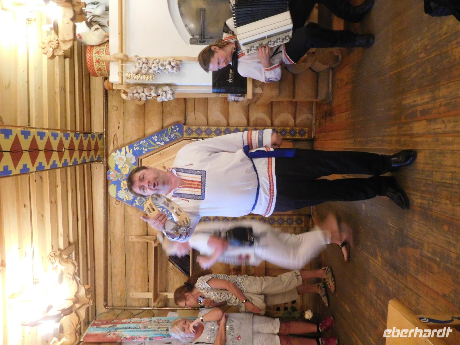 Am Nachmittag fuhren wir nach Zarskoe Selo, heute Puschkin, um den Katharinenpalast mit dem legendenumwobenen Bernsteinzimmer anzusehen. Das grandiose Ensemble belohnte die Fahrt überreichlich. Bei der Führung durch schier endlose Gänge verloren sich die Massen auch wieder, nur im Bernsteinzimmer ballte sich das Publikum, allerdings war zügiger Durchlauf organisiert. Danach fuhren wir nach Pawlowsk zum nahe gelegenen Restaurant „Pod Vorie", gebaut als altrussischer Bauernhof mit Blockhäusern aus gewaltigen Holzstämmen. Hier erwartete uns ein echt russisches Mahl. Ein guter Wodka und Wein aus dem Kubangebiet schafften Platz im Magen und beförderte die allgemeine Kommunikation, die von einem folkloristischen Programm aufgelockert wurde. Traditionell gekleidete Sänger und Instrumentalisten sangen volkstümliche Lieder. Heiter gestimmt brachte uns der Bus anschließend zum Hotel.