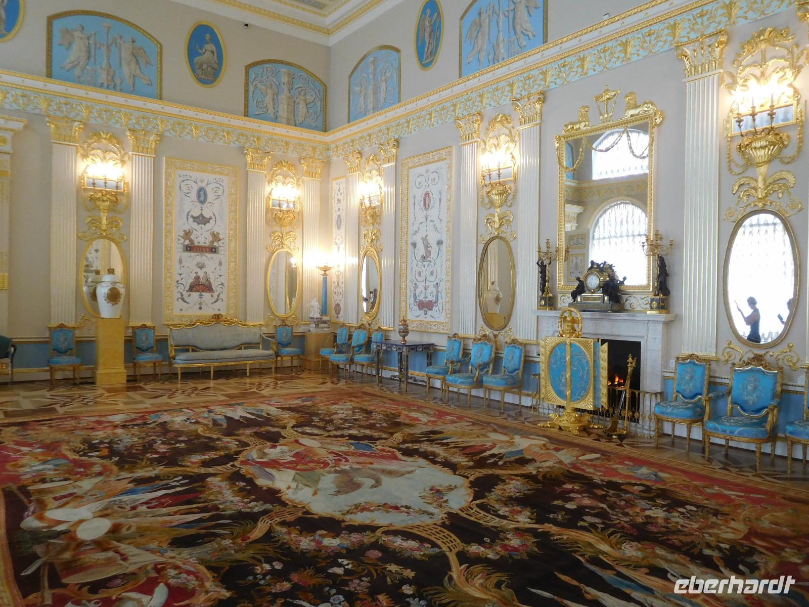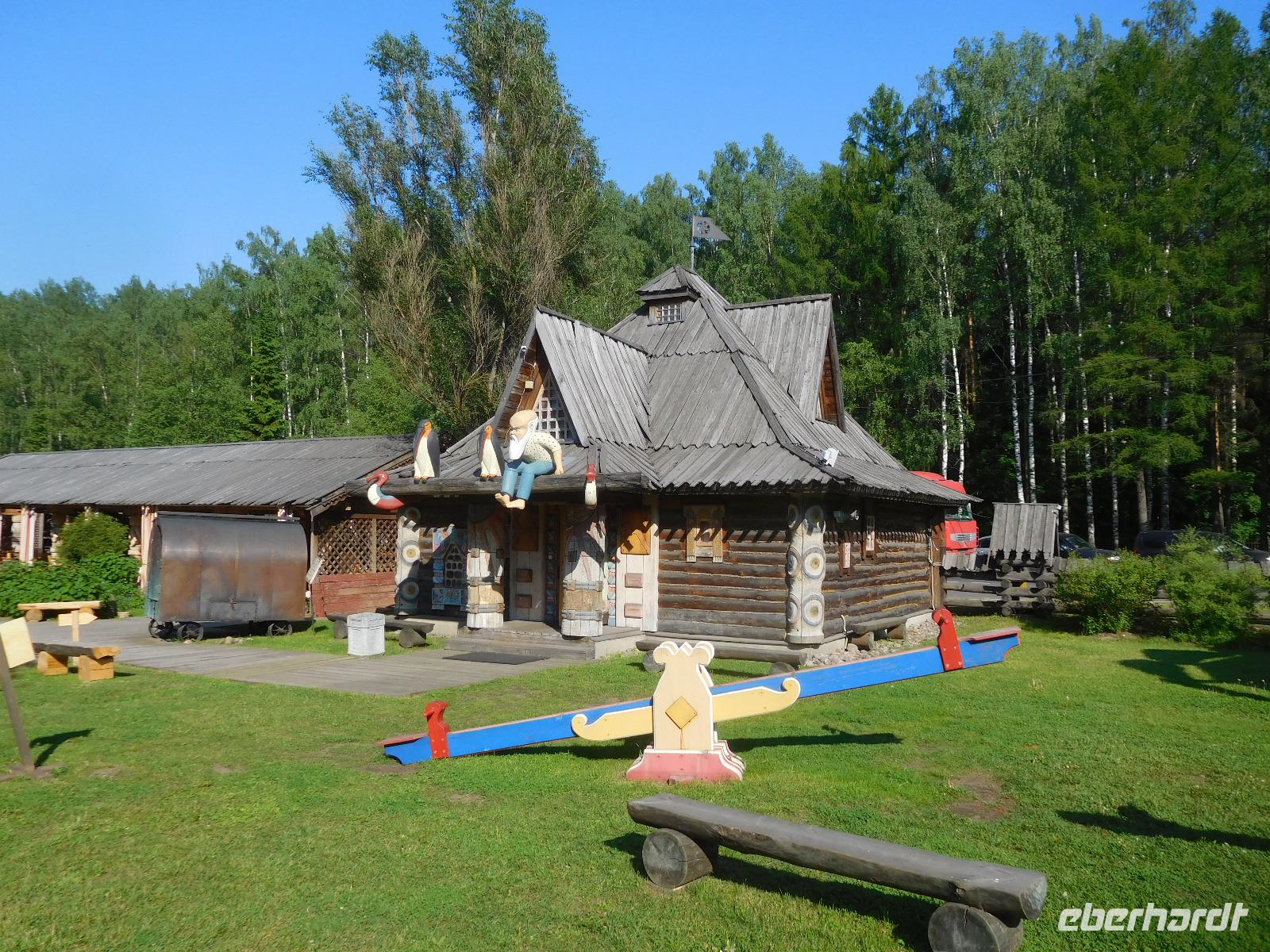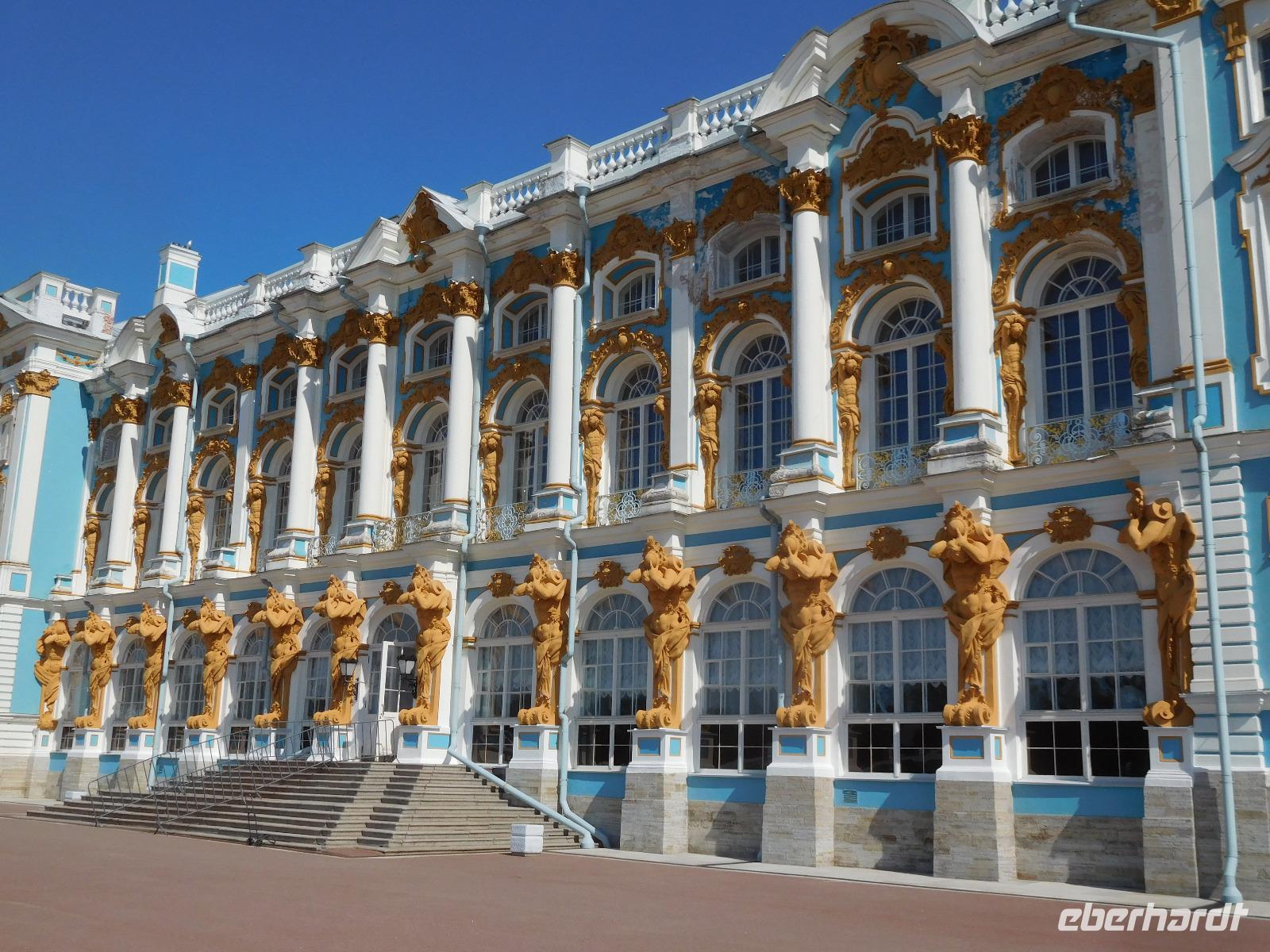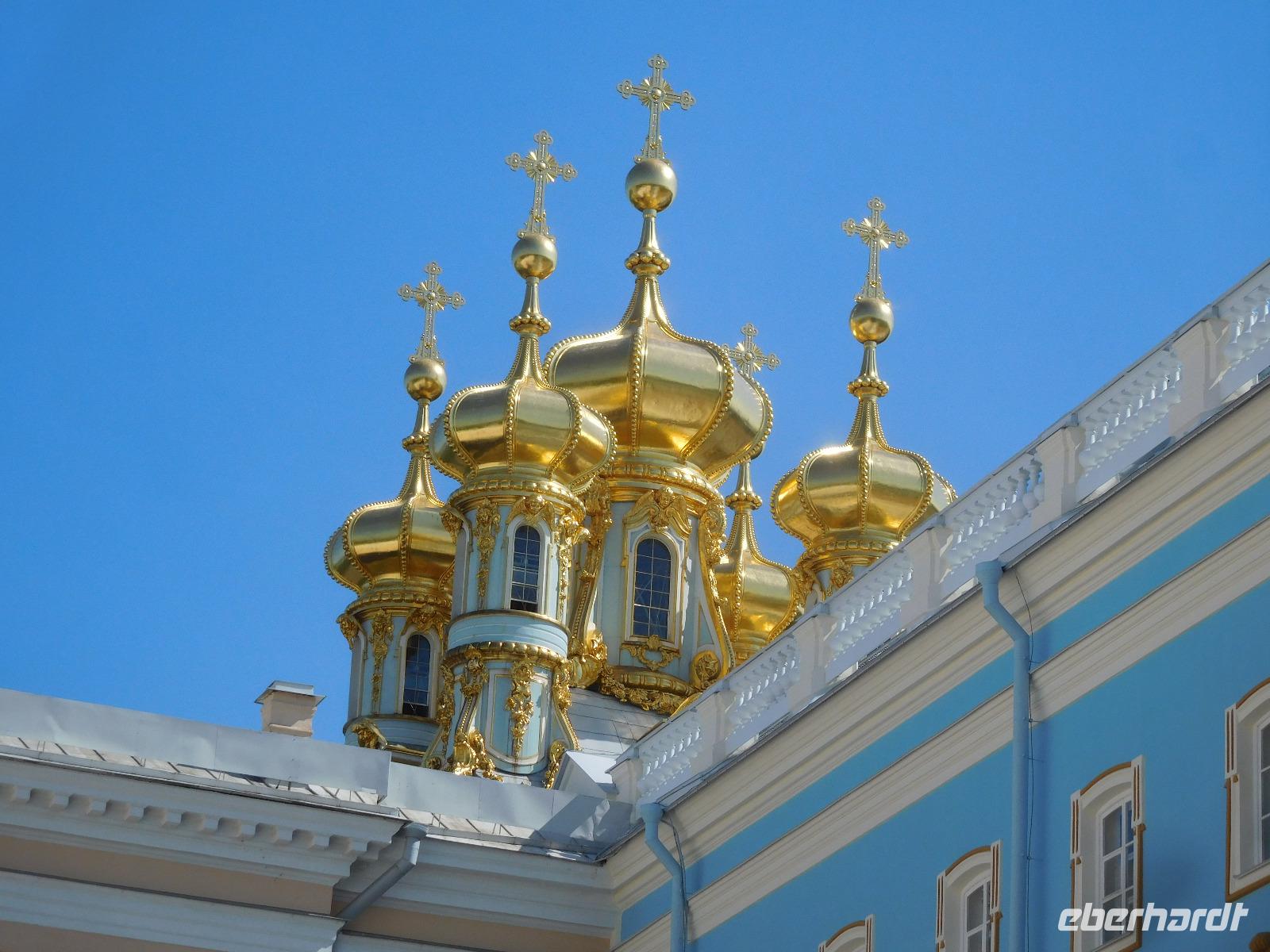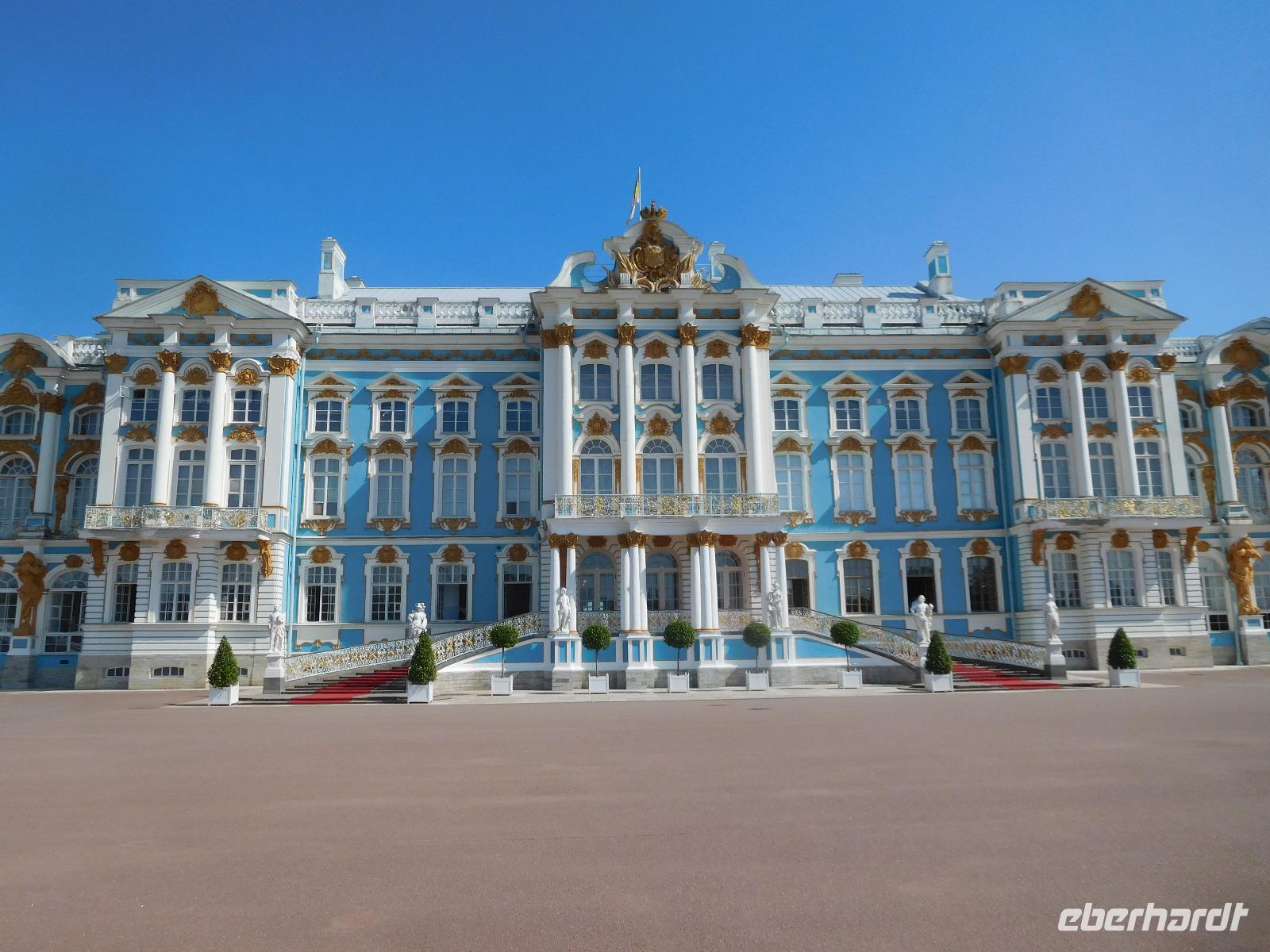 Am Nachmittag fuhren wir nach Zarskoe Selo, heute Puschkin, um den Katharinenpalast mit dem legendenumwobenen Bernsteinzimmer anzusehen. Das grandiose Ensemble belohnte die Fahrt überreichlich. Bei der Führung durch schier endlose Gänge verloren sich die Massen auch wieder, nur im Bernsteinzimmer ballte sich das Publikum, allerdings war zügiger Durchlauf organisiert. Danach fuhren wir nach Pawlowsk zum nahe gelegenen Restaurant „Pod Vorie", gebaut als altrussischer Bauernhof mit Blockhäusern aus gewaltigen Holzstämmen. Hier erwartete uns ein echt russisches Mahl. Ein guter Wodka und Wein aus dem Kubangebiet schafften Platz im Magen und beförderte die allgemeine Kommunikation, die von einem folkloristischen Programm aufgelockert wurde. Traditionell gekleidete Sänger und Instrumentalisten sangen volkstümliche Lieder. Heiter gestimmt brachte uns der Bus anschließend zum Hotel.