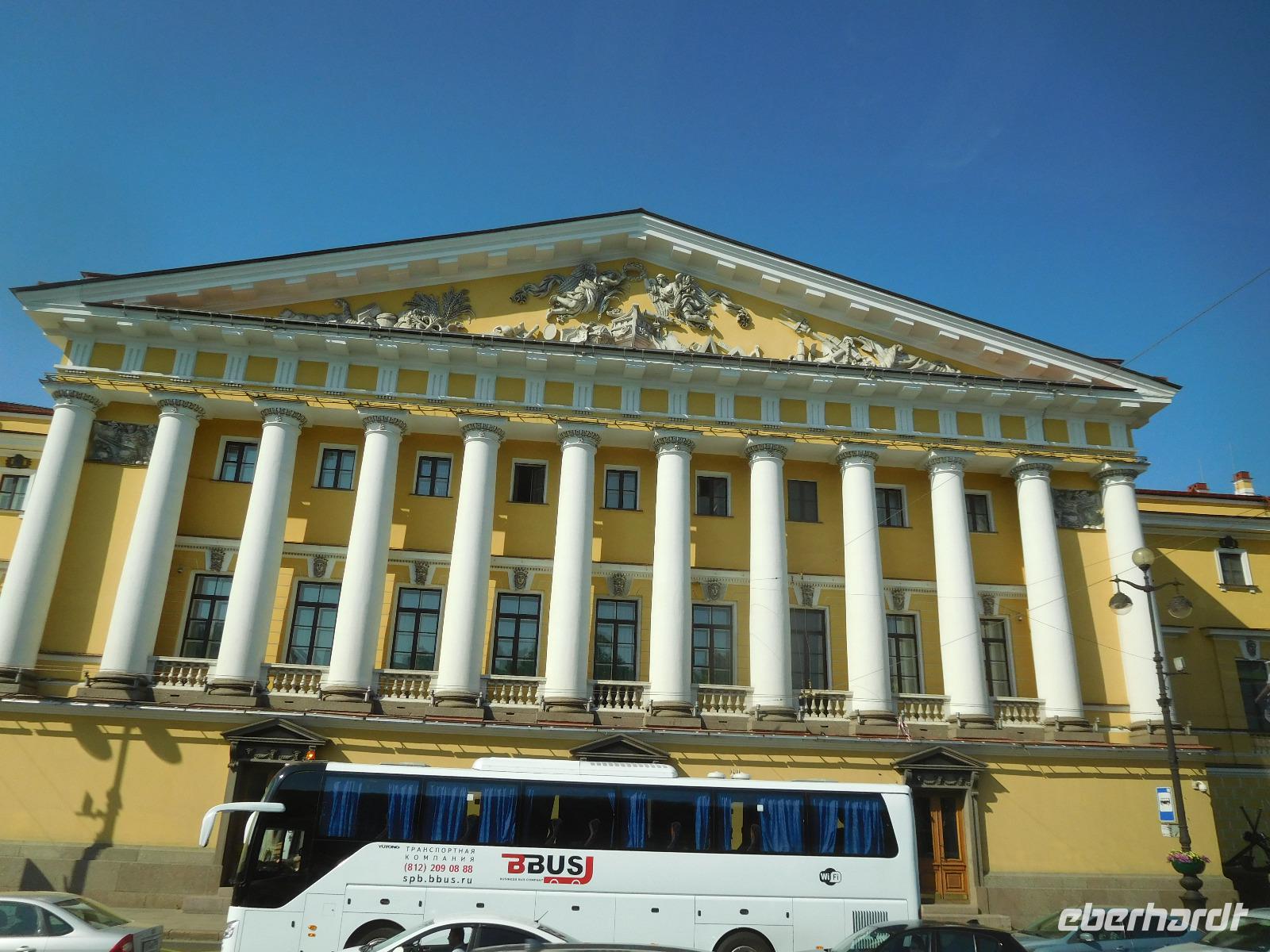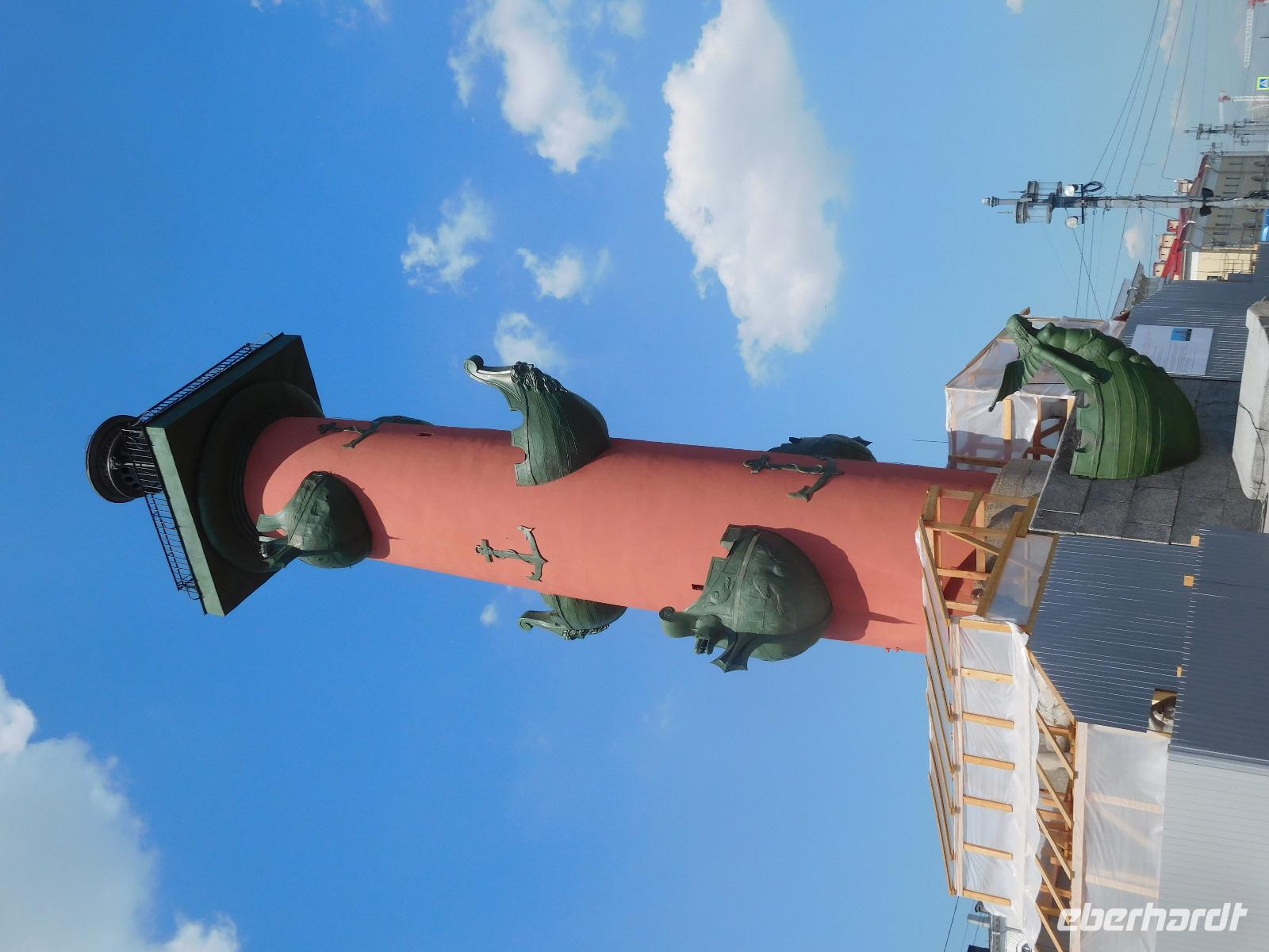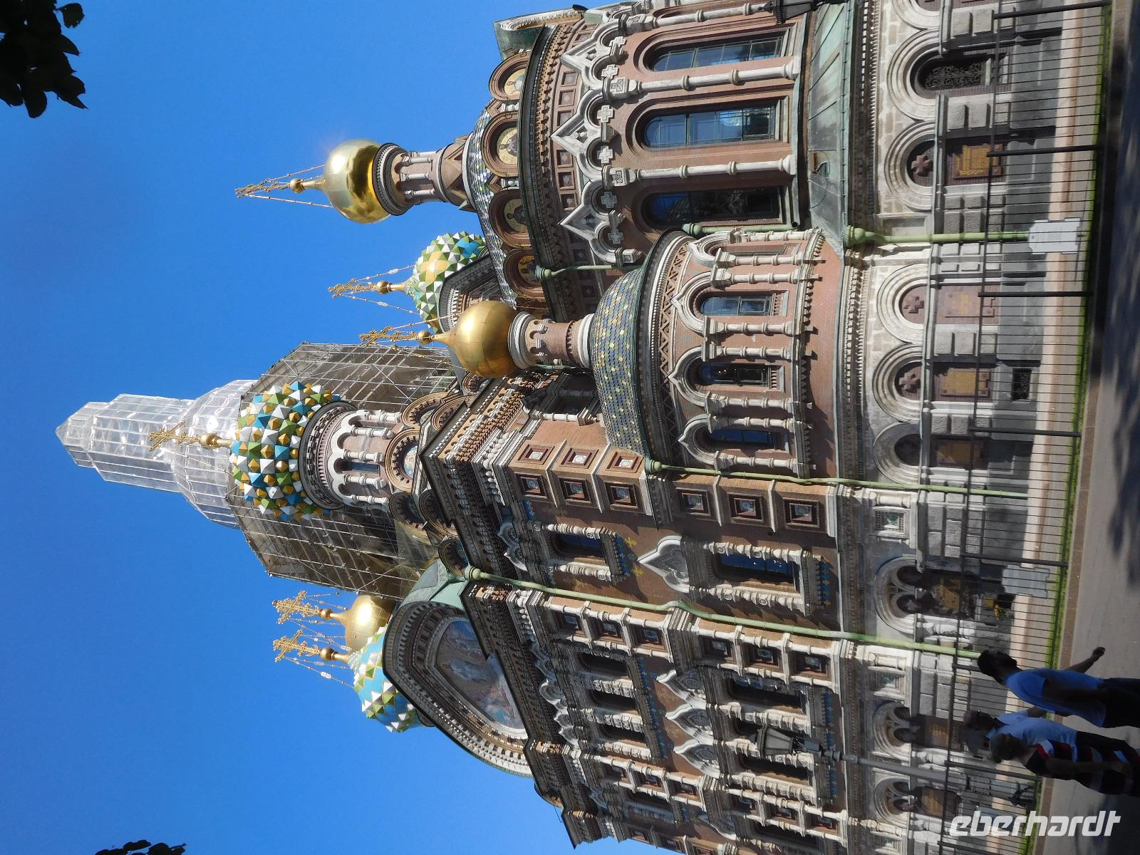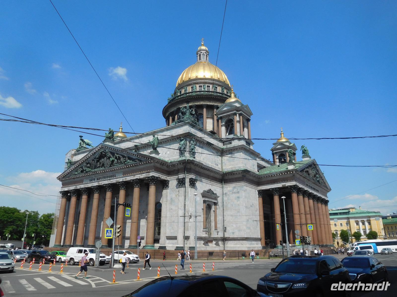 Nach dem Frühstück traf sich die Gruppe um halbneun Uhr am Bus zur Stadtbesichtigung. Gleich zu Beginn ging es zum Liegeplatz des Panzerkreuzers Aurora, dann auf die Insel mit der Peter- und Paul- Festung. Dort besichtigten die gleichnamige Kathedrale mit den Gräbern der wichtigsten einst in Petersburg residierenden Zaren aus der Romanow- Dynastie, einschließlich der Familie Nikolaus II., die von den Bolschewiki ermordet und deren Leichen erst in den Neunzigern umgebettet wurden. Den langen Newskiprospekt entlang, vorbei an der Kasaner Kathedrale, pausierten wir hinter der Rostrabrücke unweit der Börse, um dann die russisch- orthodoxe Hauptkirche, die Isaakkathedrale zu besichtigen, die sich wie die Kasaner Kathedrale architektonisch an den Petersdom in Rom anlehnt.