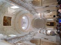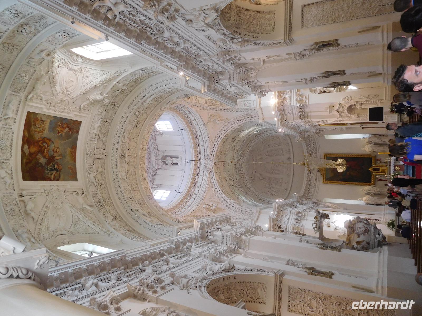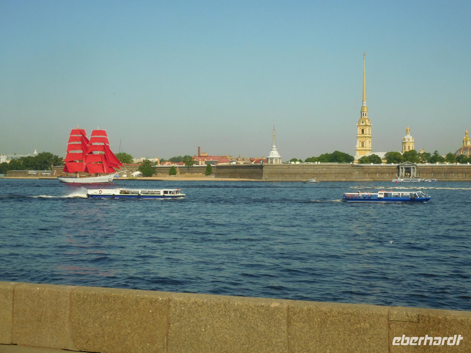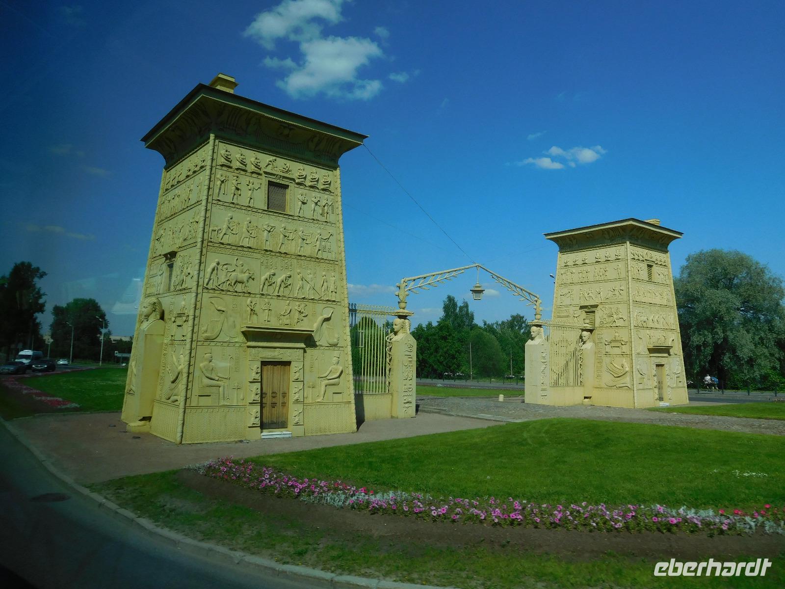 Nach dem Frühstück traf sich die Gruppe um halbneun Uhr am Bus zur Stadtbesichtigung. Gleich zu Beginn ging es zum Liegeplatz des Panzerkreuzers Aurora, dann auf die Insel mit der Peter- und Paul- Festung. Dort besichtigten die gleichnamige Kathedrale mit den Gräbern der wichtigsten einst in Petersburg residierenden Zaren aus der Romanow- Dynastie, einschließlich der Familie Nikolaus II., die von den Bolschewiki ermordet und deren Leichen erst in den Neunzigern umgebettet wurden. Den langen Newskiprospekt entlang, vorbei an der Kasaner Kathedrale, pausierten wir hinter der Rostrabrücke unweit der Börse, um dann die russisch- orthodoxe Hauptkirche, die Isaakkathedrale zu besichtigen, die sich wie die Kasaner Kathedrale architektonisch an den Petersdom in Rom anlehnt.