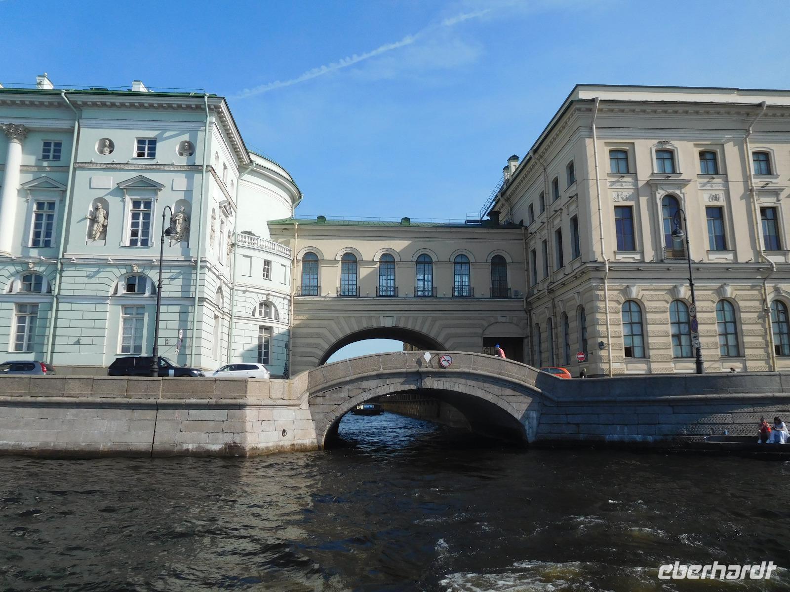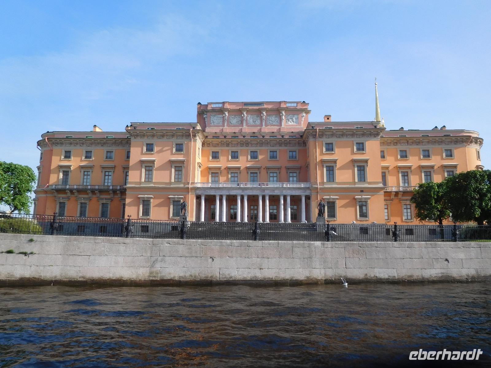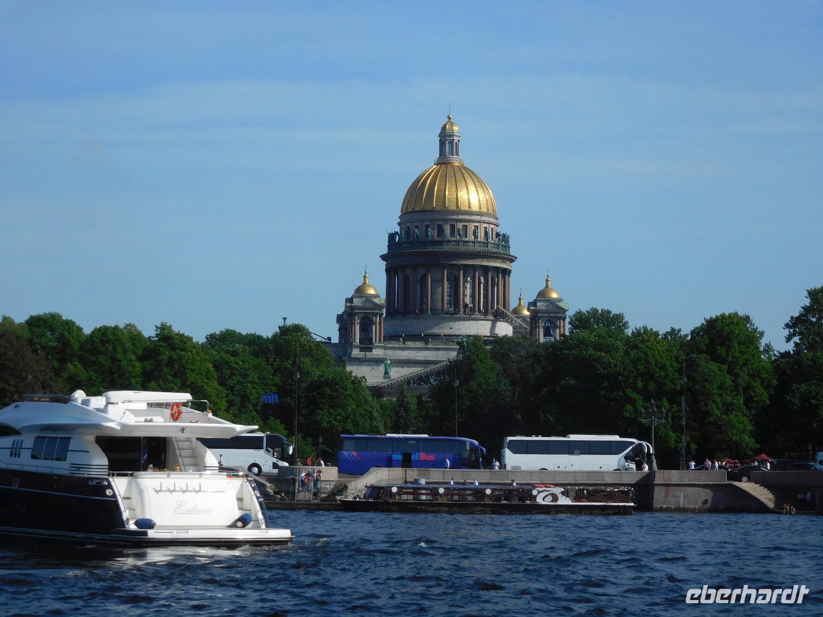 Nach dem Frühstück traten wir wegen des anspruchsvollen Tagesprogramms mit Einreise nach Russland zeitig die Weiterreise an. Schweren Herzens verabschiedeten wir die so engagierte wie kompetente Reiseleiterin Wanda, die allen ans Herz gewachsen war. Den russischen Reiseführer Timofej, abgekürzt Tim, nahmen wir gleich nach der Grenze auf und fuhren nach Petersburg. Auf den Vorschlag unseres engagierten Stadtführers Timo hin entschieden sich alle Gäste auch im Hinblick auf das heiße Sommerwetter für eine Bootsfahrt. Durch einen freundlichen Zuschuß von Eberhardt-Travel hielten sich die Selbstkosten in Grenzen. Die Tour zeigte uns zunächst viele Villen und Paläste am Gribojedowkanal, der Moika und der Fontanka, bevor wir herrliche Ansichten auf der Newa genießen konnten. Wir hatten die denkbar besten Blicke auf den Marmorpalast des Fürsten Orlow, sowie diverse andere Paläste und Kirchen. Anschließend ging es zum Hotel, wo wir sofort einchecken und zum Abendessen gehen konnten.