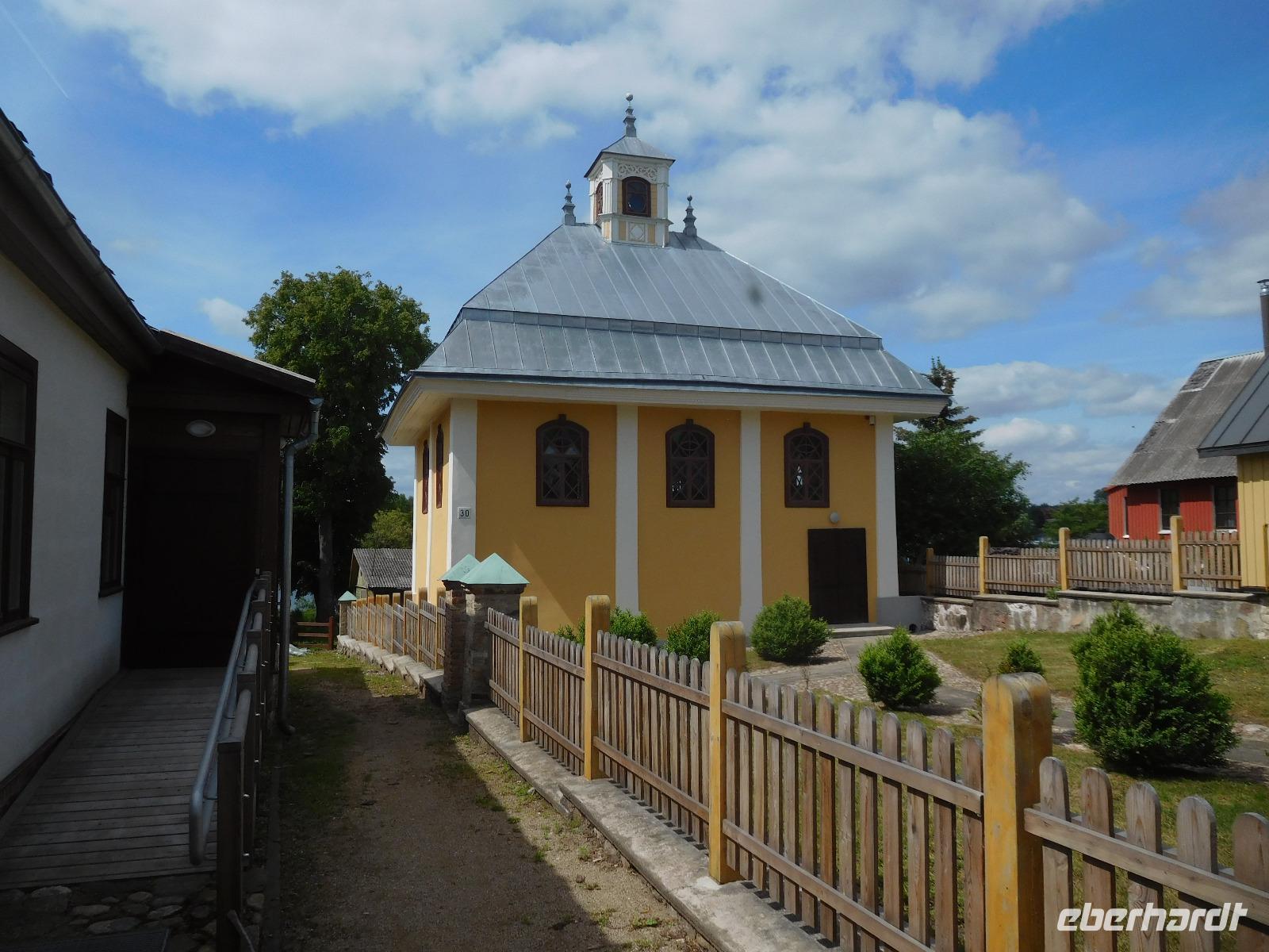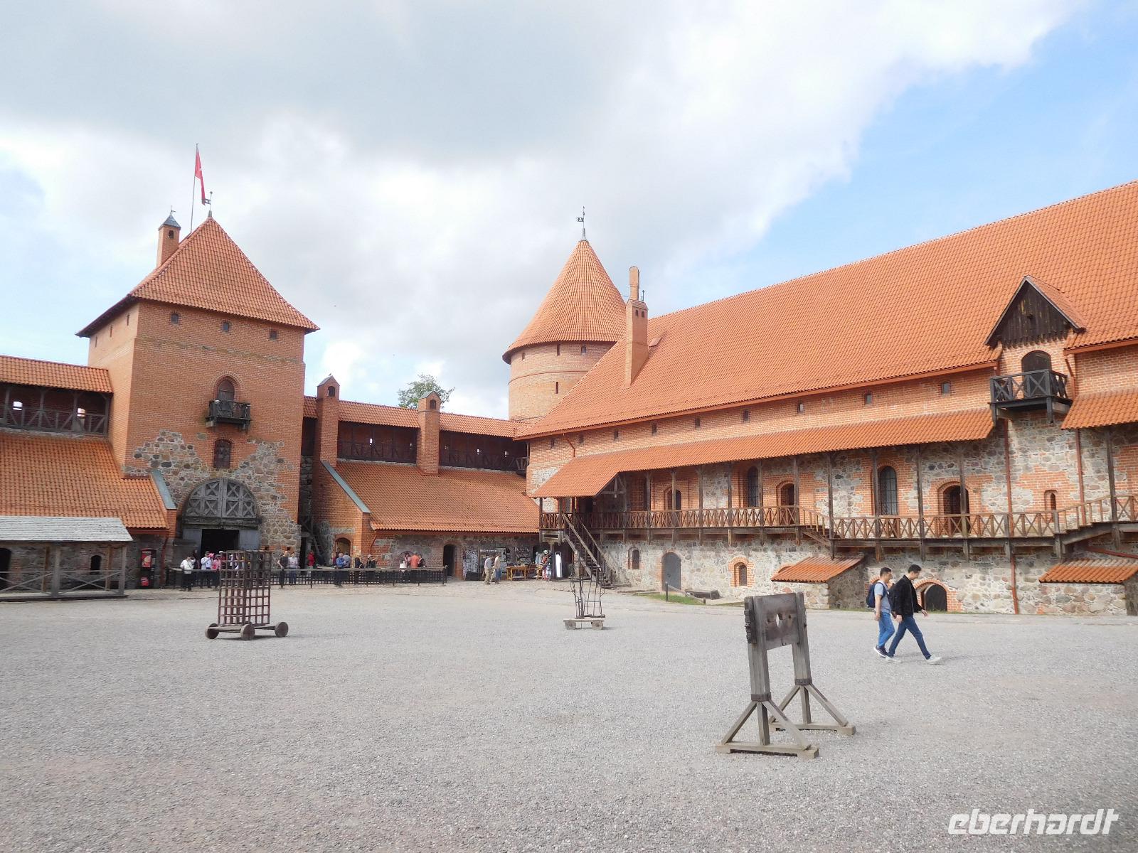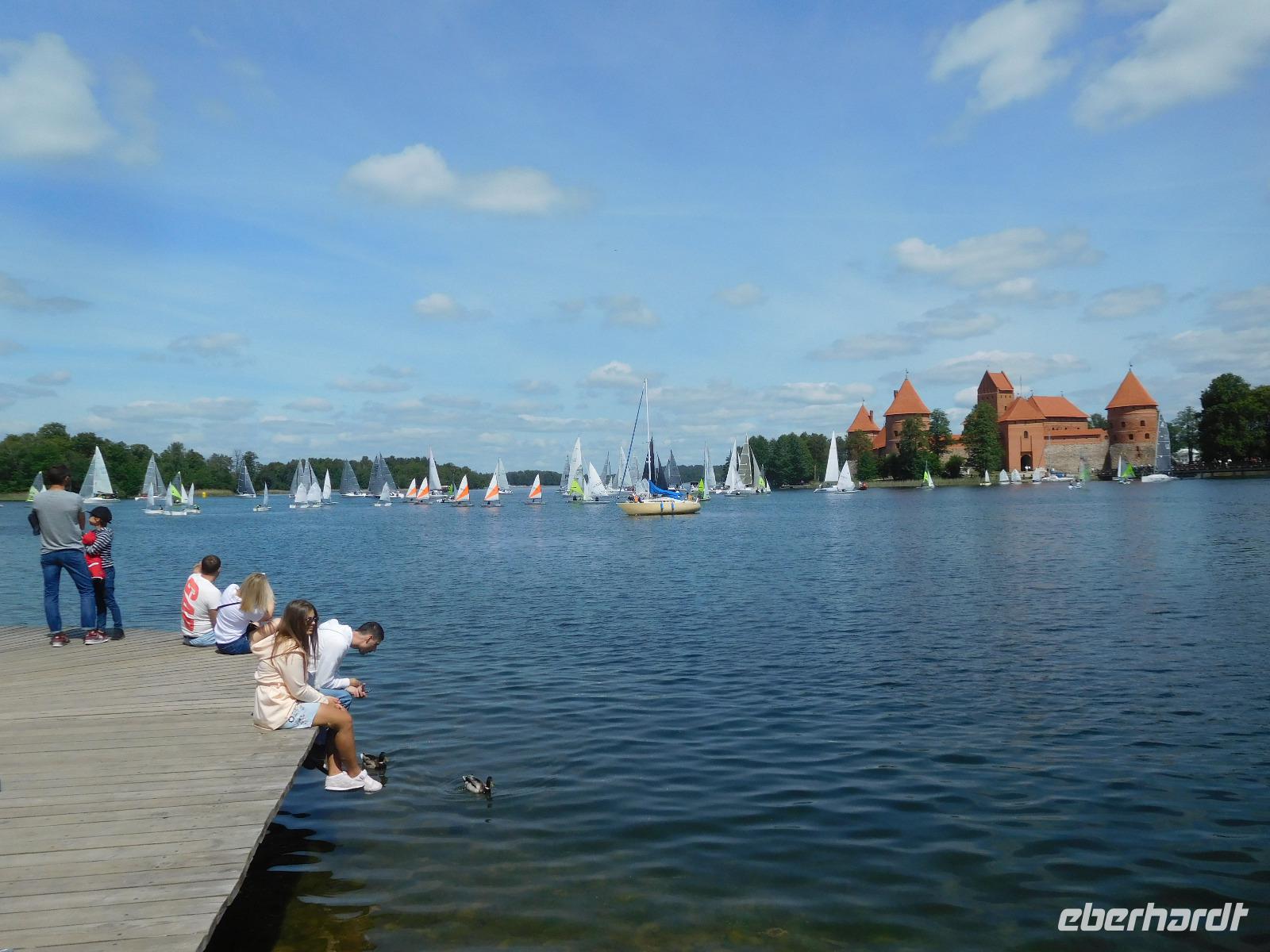 Nach dem Frühstück fuhren wir zur Wasserburg von Trakai, der einzigen dieser Art im Baltikum. Sie ist das Wahrzeichen des unabhängigen Litauen und ein Höhepunkt der Reise. Die nur über einen Steg erreichbare Burg wurde der Legende nach schon von Fürst Gediminas als Holzfestung errichtet, die mehrfach abbrannte. Ende des 14. Jahrhunderts errichtete Vytautas der Große die steinerne Burg mit diversen Anleihen beim Deutschen Orden in Stil und Fortifikation, so dass man sich in einer kleinen Ausgabe der Marienburg wähnt. Von hier regierten die Großfürsten ein Land, das von der Ostsee bis zum Schwarzen Meer reichte. Der durch leidvolle Erfahrungen misstrauisch gewordene Vytautas rekrutierte sich von der Krim, denn so weit ging sein Herrschaftsbereich, etwa 400 Familien der Karäer, ein Turkvolk, das im 7. Jahrhundert eine jüdische Sekte gebildet hatte, die sich zwar an der Thora, nicht aber an den Folgeschriften orientierte. Ganz nach dem Vorbild Kaiser Friedrich II. von Hohenstauffen, dessen Leibgarde aus sizilianischen Bergmuselmanen bestand, stellten diese Karäer die Leibwache für Vytautas. Auf dem festländischen Ortsteil sieht man noch ihre giebelständigen Holzhäuser mit den drei Fenstern: eins für Vater im Himmel, eins für den auf Erden und eines für Vytautas. Auch die Kerene, wie ihre Synagoge genannt wird, steht noch. In Trakai war an diesem Wochenende ein großes Stadtfest, zu dem auch ein Segelwettbewerb gehörte. Der Anblick der vielen Segler vor der Kulisse der Wasserburg war unvergesslich.