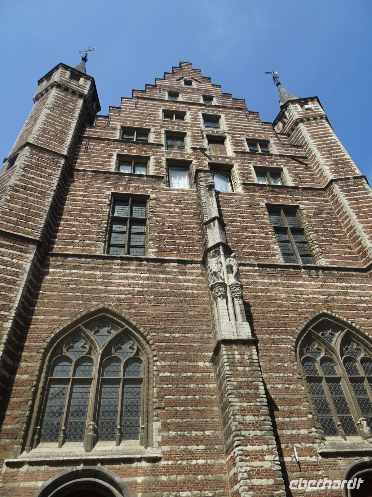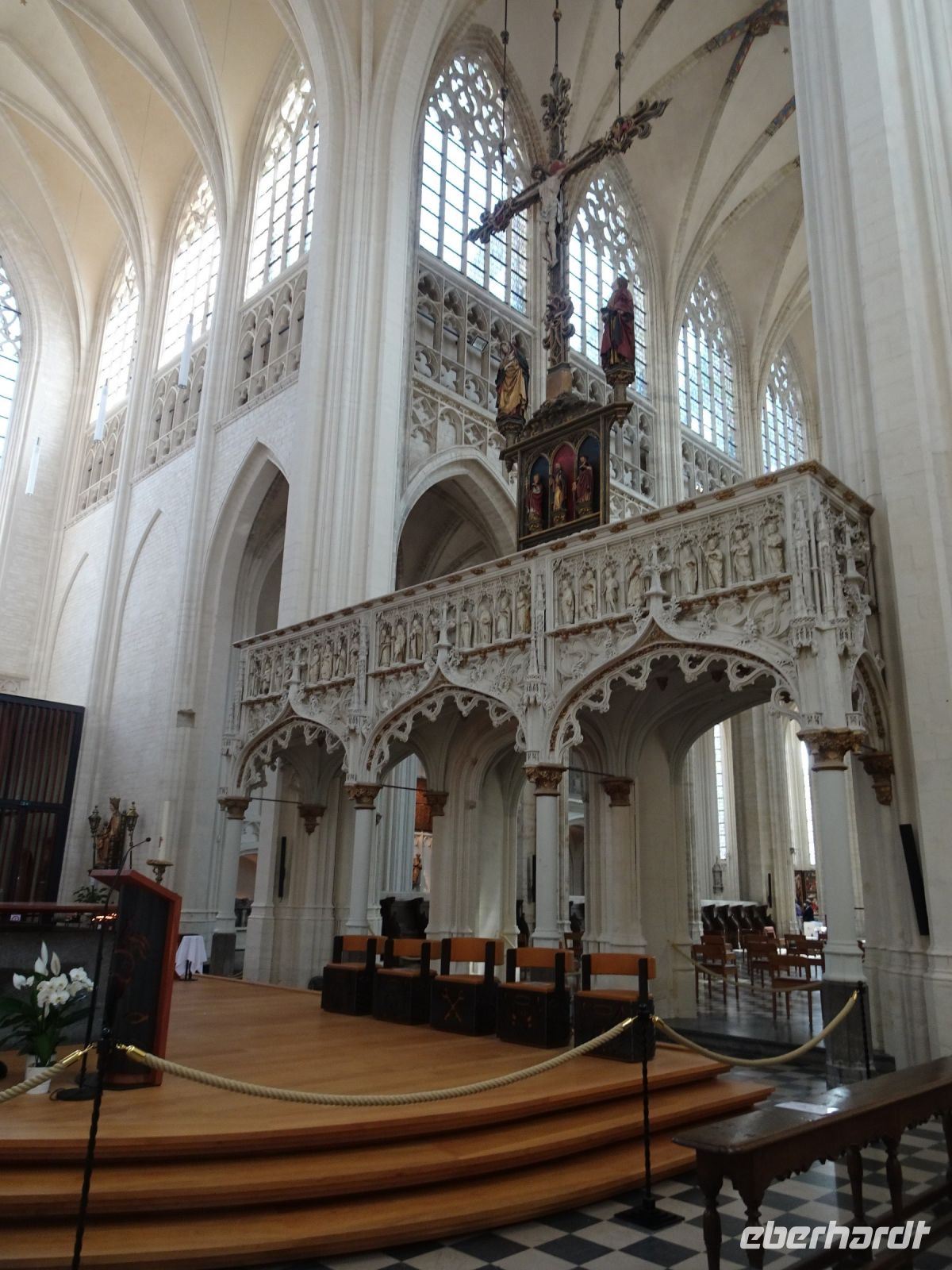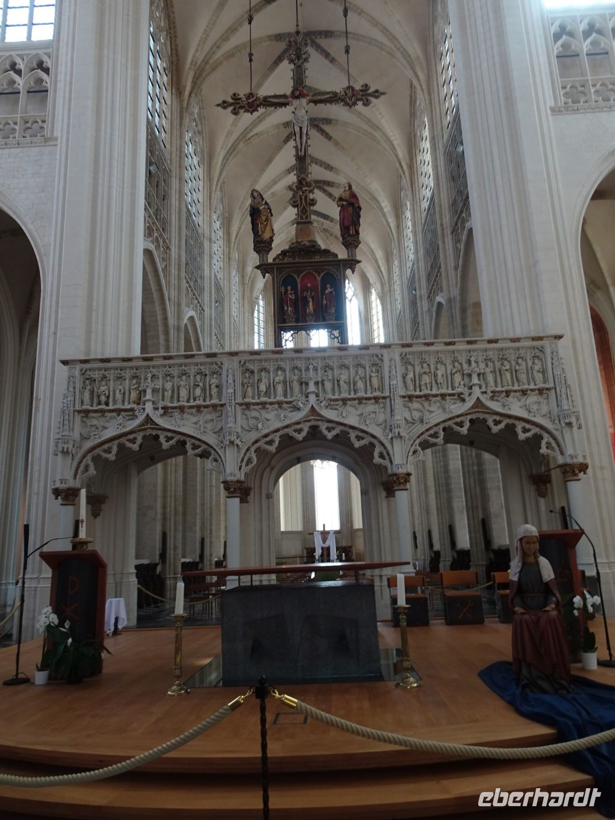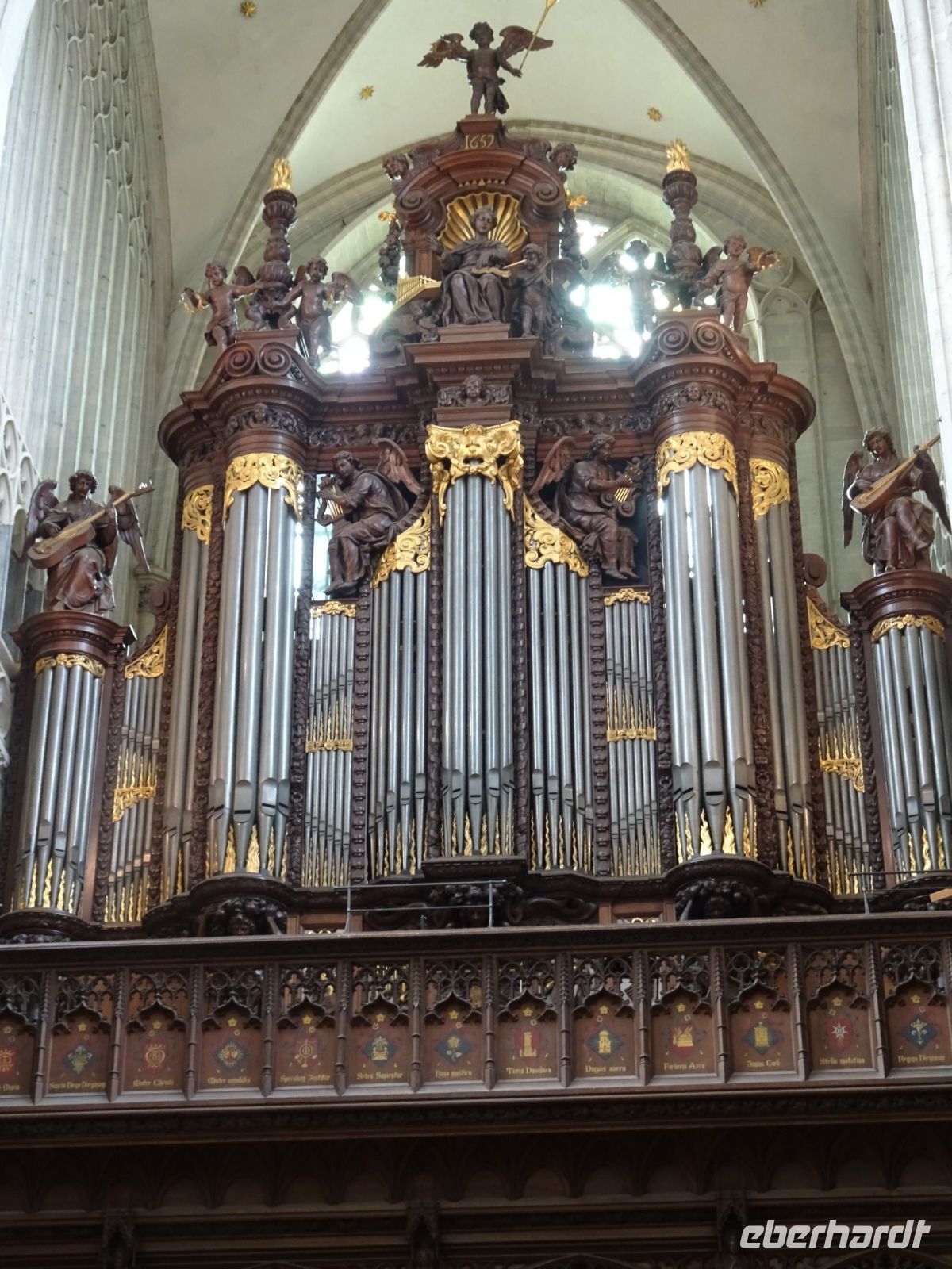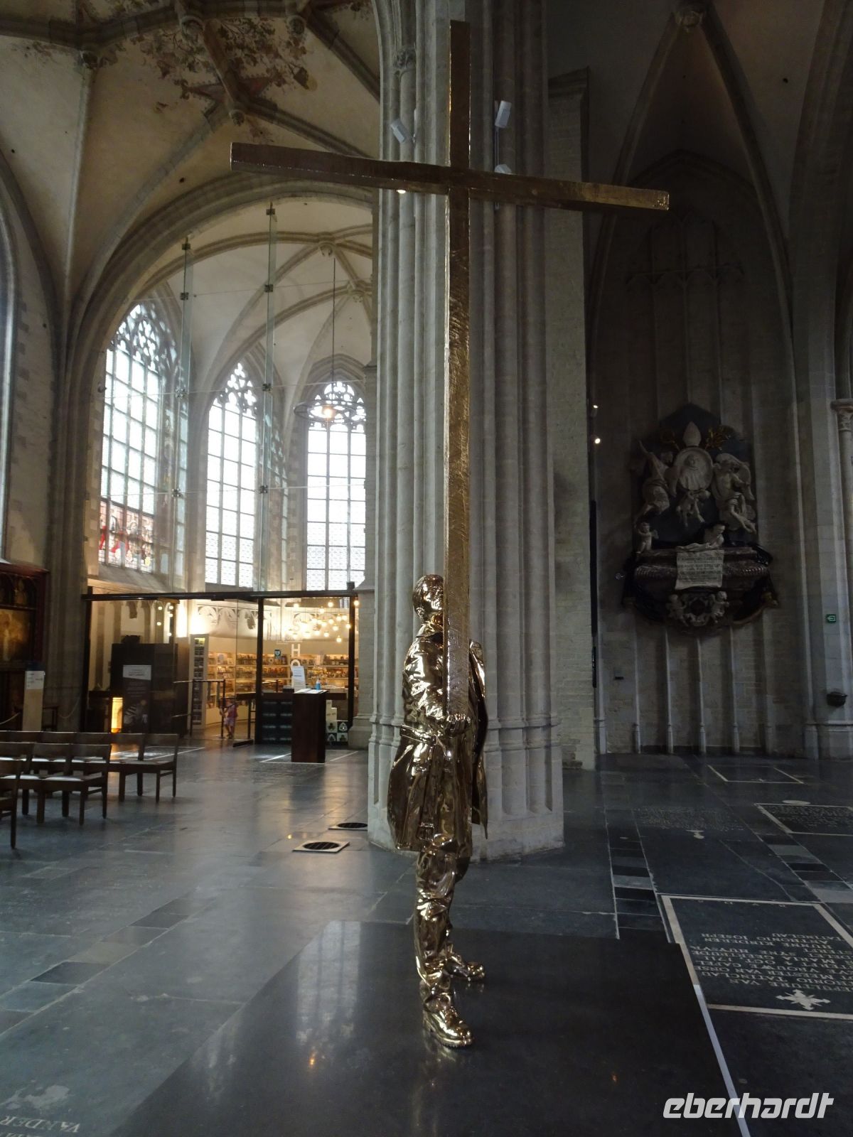 Am nächsten Tag ging es nach Antwerpen. Wir nutzten jedoch vorher die Gelegenheit, den kleinen Ort Lier zu besuchen. Mit einem der schönsten Marktplätze und einer sehr geschlossenen Gestaltung von Rathaus und Belfried hatten wir einen sehr guten Eindruck. Interessant auch der Zimmer-Turm, der durch den Autodidakt Louis Zimmer mit vielfältigen Zeitmessern versehen wurde und die langsamste Uhr der Welt besitzt. Ebenfalls in Lier besichtigten wir den sehr gut erhaltenen und noch bewohnten Begijnenhof. Bauarbeiten sorgen dafür, dass dies auch weiterhin so ist. Darin gibt es einen Kalvarienberg, eine Seltenheit. Durch den Park mit einer herrlichen Bogenbrücke über die Nete ging es zurück zu unserem Bus. In Antwerpen wurden wir schon zu unserem Stadtrundgang erwartet. Höhepunkte von Antwerpen waren neben dem Grote Markt mit dem Brabodenkmal, auf dem der Riese Brabo die dem Riesen Antigonus abgeschlagene Hand namensgebend in die Schelde wirft, vor allem die Liebfrauenkirche. In dieser, einer der größten Kathedralen der Welt, konnten vier Rubens Bilder besichtigt werden. Und hier begegnete uns mit dem Kreuzträger von Fabré wieder zeitgenössische Kunst. Besonders anschaulich war die Darstellung der Geschichte von Nello und Petrasche an der Skulptur vor der Liebfrauenkirche durch unseren Stadtführer. Weiterhin besuchten wir die ehemalige Vleeshuis (Fleischhalle), die heute als Musikinstrumentenmuseum genutzt wird, und gingen durch die schmalste Gasse. Am Groenplaats zeigte sich Rubens als Statue in beeindruckender Geste. Der an die Stadtführung anschließende Gang über die Einkaufsstraße Meir zum Rubens-Haus sowie zur Centraal Station mit dem naheliegenden Diamantenviertel unternahmen einige Reisegäste mit unseren Reiseleiter Hartwig. Leider waren für den Besuch des Rubens-Hauses keine Zeittickets mehr verfügbar. Eine Freizeit in Antwerpen konnte jeder selbst gestalten. Eine Empfehlung für den Rückweg gab es mit dem quirligen Vrijdagsmarkt und dem Museum Plantin-Moretus als Beispiel für eine frühere Druckwerkstatt.