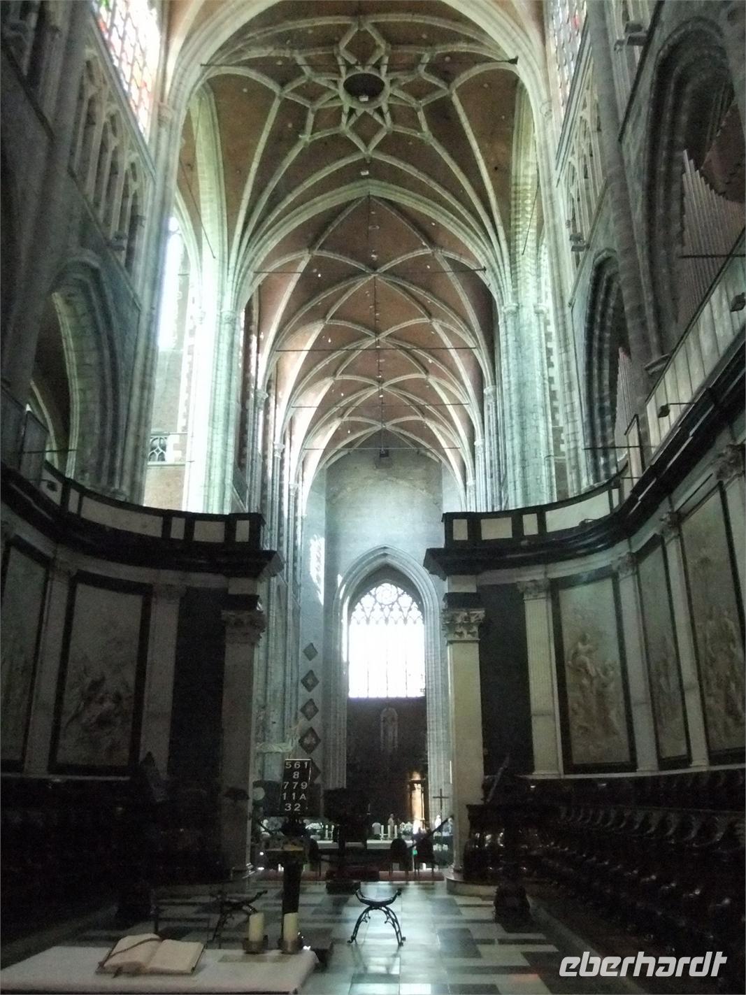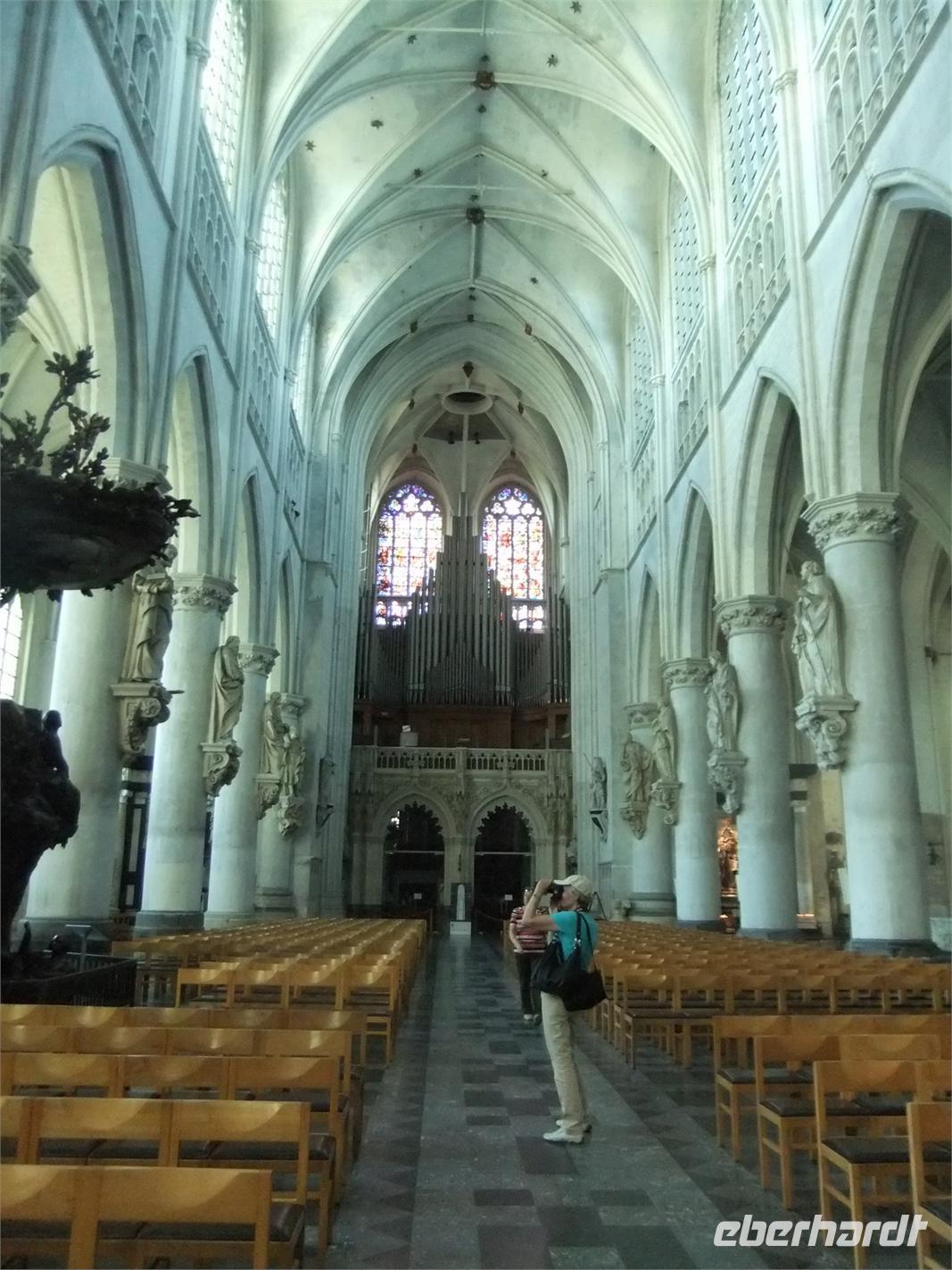 Die drei Türme, von Kathedrale St. Bavo, Belfiried und der St,-Niklaaskirche, künden von der Macht und Größe der Stadt, die einmal (je nach Autor) die größte Stadt des Abendlandes oder die zweitgrößte nach Paris war. Immer wieder prächtige, gotische Gildehäuser mit Treppengiebeln, vor allem an der Graslei, daneben die Fleischhalle vom Anfang des 15.Jhdt., Dann die Burg der der Grafen von Flandern, s’Gravensteen, eine der gewaltigsten Wasserburgen Westeuropas, mitten in der Stadt, im Kern romanisch, aus dem 9.Jhdt. Die flandrischen Grafen verstärkten sie „um den Hochmut der Genter zu brechen, die so stolz waren auf ihren Reichtum und ihre befestigten Häuser, die Burgen glichen“ (ein Zeitzeuge). Schnell vergehen die zwei Stunden der Stadtführung. Sie endet an der Kathedrale. Sie ist allein den Besuch wert aber sie birgt auch ein besonderes Kleinod: den Flügelaltar „Anbetung des Gotteslammes“ der Gebrüder van Eyck. Es ist ein absoluter Höhepunkt mittelalterliche Malkunst. Mit geradezu fotografischer Genauigkeit wurde jedes einzelne der Haare der musizierender Engel gemalt, die Blumen auf der Wiese mit allen Details, die Kirchen aus den Niederlanden und Deutschland, historische Persönlichkieten, ausdrucksstarke Gesichter. Kein Wunder, dass der Altar oder einzelne Teile oft an anderen Orten waren, verkauft, beschlagnahmt, gestohlen, ausgelagert, verschwunden: im Louvre, in Berlin, in Pau, in der Steiermark. Eine Originaltafel fehlt noch immer.