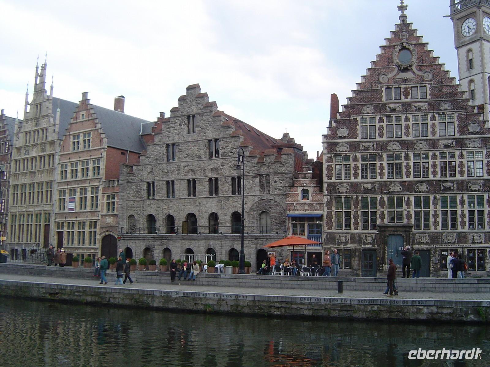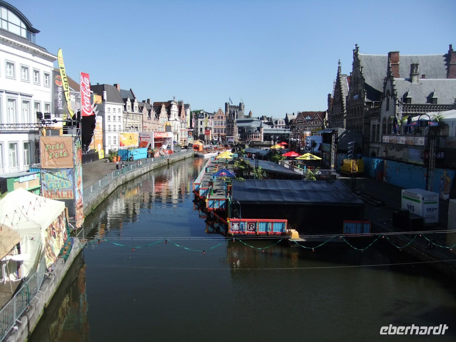 Gent weiteifert in der Schönheit mit Brügge. Wenn Brügge auf Romantik setzt, dann Gent auf Macht, kasierliche und städtische. Aber auch auf die Lebensfreude. Die Stadt hat sich in ein riesiges Festgelände verwandelt, am letzten Tag der Gentse Festen, dem Tag des leeren Portemonnaies, verdecken noch Aufbauten, Bühnen und Zelte zum Teil die historischen Bauten. Gent hat die größte Zahl der denkmalsgeschützen Bauten Belgiens