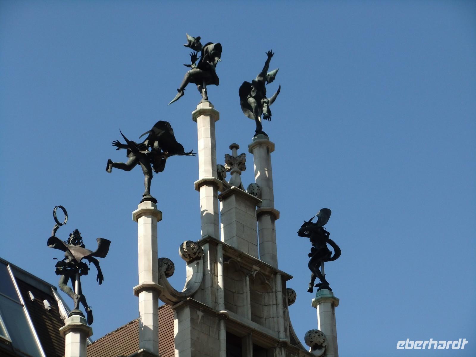 Scharbeek ist eine des 19 Gemeinden von Brüssel mit schönen Häusern des 19. und 20.Jahrhunderts. Das Europaviertel schließ sich an, am auffälligsten das Palais Berlaymont, ein dreistrahliger Stahl-Betonbau mit Glasfassade und Sonnenschutzblenden. Hier ist die Kommission der EU untergebracht. Über dem Parc von Cinquantinaire (50 Jahre Belgien) mit seinem Museumsgebäuden und dem Triumphbogen kommen wir wieder in die Innenstadt. Der weitere Weg wird zu Fuß zurückgelegt. Natürlich geht es zum Grand Place, dem schönsten Markplatz oder dem schönsten Theater Welt (Cocteau). Nach der totalen Zerstörung 1695 durch die Truppen Louis XIV wurde er von den Gilden in nur 4 Jahren im Stile der italienischen Renaissance wieder aufgebaut. Lange könnte man die architektonischen Details studieren, mehr über seine Bewohner erfahren (darunter Victor Hugo und Karl Marx), aber in der Nähe erwartet uns die berühmte Figur des kleinen Jungen, der mit seinem Strahl (70 Liter je Stunde !) eine ganze Feuersbrunst löschte. Manchmal spendet er auch Bier oder Wein, bekommt zu seinen Hunderten von Bekleidungen eine weitere geschenkt. Heute wird er millionenfach vermarktet. In der Freizeit wird schnell einer der berühmten köstlichen Waffeln probiert, dann geht es noch einmal zum Atomium. Mit dem damals schnellsten Aufzug der Welt erreicht wir die obere Aussichtskugel und durchwandern dann über Rolltreppen und Treppen einen Teil der Kugeln. Die derzeitige Ausstellung gilt dem Problem Wasser. Nach einem kurzen Besuch im Quartier Royal essen wir im „König von Spanien“, Haus Nr. 1 am Großen Markt und schauen auf den belebten schönen Platz.