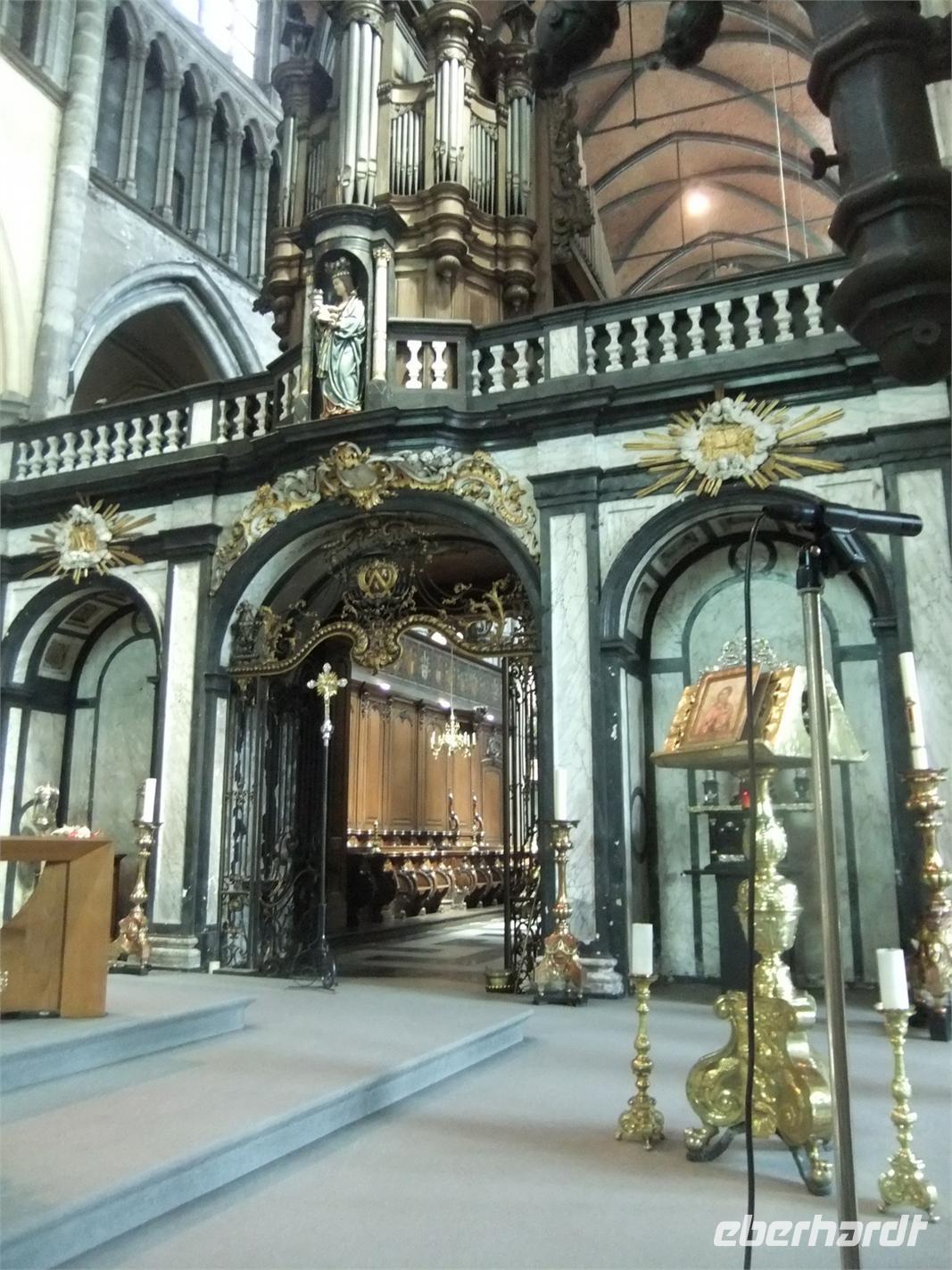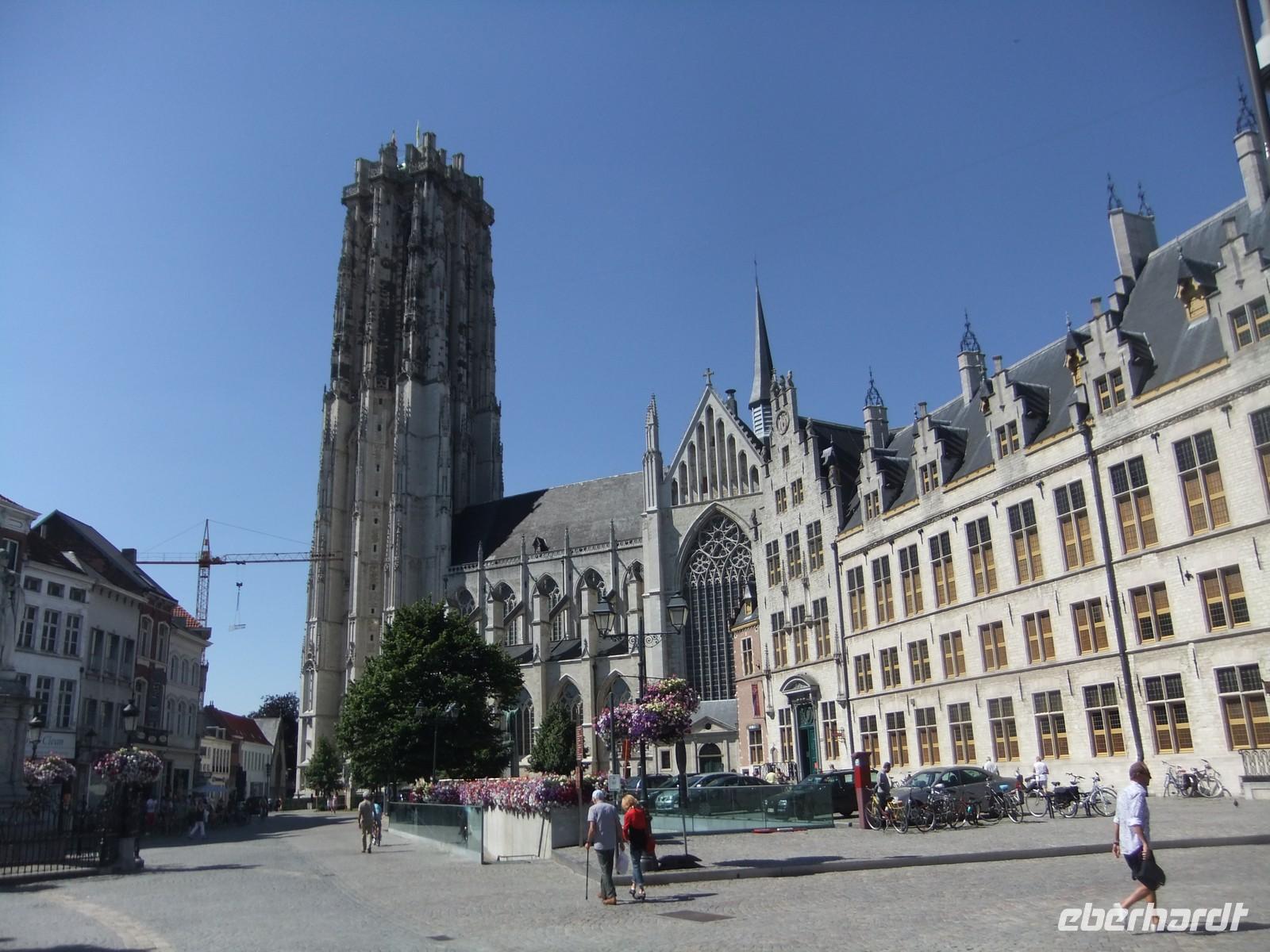 geschützte Denkmäler; denn Mecheln war Zentrum im Nordteil der Burgunderherrschaft und kaiserliche Stadt. Karl V, in Gent geboren, wuchs hier auf und wurde von seiner Tante, Margarethe von Österreich erzogen. Zeitweilig war Mechelen Hauptstadt der habsburgischen Niederlande. Die Stadtführer empfangen uns als Karl und Margarethe in historischen Kostümen und zeigen uns eine Auswahl der historischen Bauten von Mechelen. Wir besuchen das Stadthaus, als Sitz des Großen Rates der Niederlande von Karl V vorgesehen, und seine heute noch genutzten Amtsräume. Wenige Schritte weiter ragt der Turm der Kathedrale St.-Rombout auf. Sie war des Erzbischofs bis zu seinem Umzug 1961 nach Brüssel. Auf 167 m war der Turm berechnet, 6 m höher als das Ulmer Münster, aber nur drei Fünftel wurden ausgeführt. Der Turm beherbergt sogar 2 Carillons mit je 49 Glocken. Die Glockenspiele haben ein Gesamtgewicht von 80 t (Brügges Belfried hat eines mit 27 t). Und die Stadt hat die einzige Glockenspielerschule der Welt. Ungewöhnlich für eine Stadtführung ist der Besuch von 2 Gaststätten. Ein frisches Masneblaster und ein stärkeres Carolus-Bier (9 %) sind nur eine winzige Auswahl aus dem Reichtum von mehr als 1000 Biersorten in 400 Geschmacksrichtungen. Das 13,5%ige Weihnachtsbier ist leider für dieses Jahr schon längst nicht mehr zu haben.