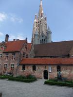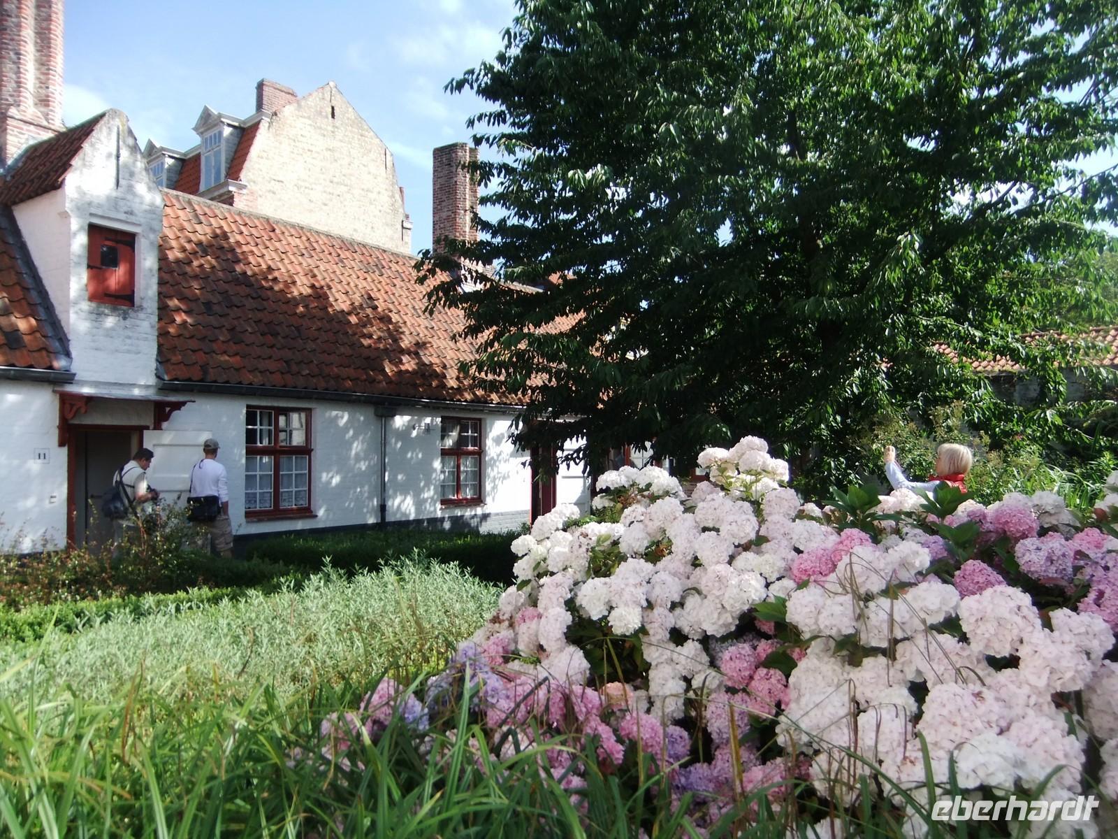 Kaum eine Stadt hat so einen Wechsel zwischen Reichtum und Armut erlebt wie Brügge. Im Mittelalter war es Hafen- und Hansestadt, Zentrum des Englandhandels und der flandrischen Tuchindustrie, Börsenplatz, Mittelpunkt der Goldschmiedekunst, die reichste Stadt Nordeuropas, in der Künstler wie van Eyck oder Hans Memling lebten. Aber mit der Versandung des Zwijn musste der Hafen Ende des 15. Jhdts. aufgegeben werden, Kriege zertörten die Handelsbeziehungen. Der Schwerpunkt verlagerte sich nach Antwerpen. Brügge veramte und schlief ein, wurde zur toten Stadt (Roman „Bruges la Morte“ von Rodenbach). Heute profitiert es von seinem Dornröschenschlaf. Es ist dieStadt in Belgien für Touristen, große Teile der alten Bausubstanz haben die Jahrhunderte überdauert. Wir beginnen am Minnewater unseren Rundgang, das spätgotische Schleusenhaus regelt den Pegel in den Grachten. Der stille Begijnenhof mit seinen kleinen Häuschen kündet vom Leben adliger Frauen in einer ordensähnlichen Gemeinschaft. Diese typischen belgischen Begijnenhöfe sind wie die belgischen Belfriede, den Symbolen städtischer Macht UNESCO-Weltkulturerbe wie auch die Stadt Brügge in ihrer Gesamtheit. Im ehrwürigen