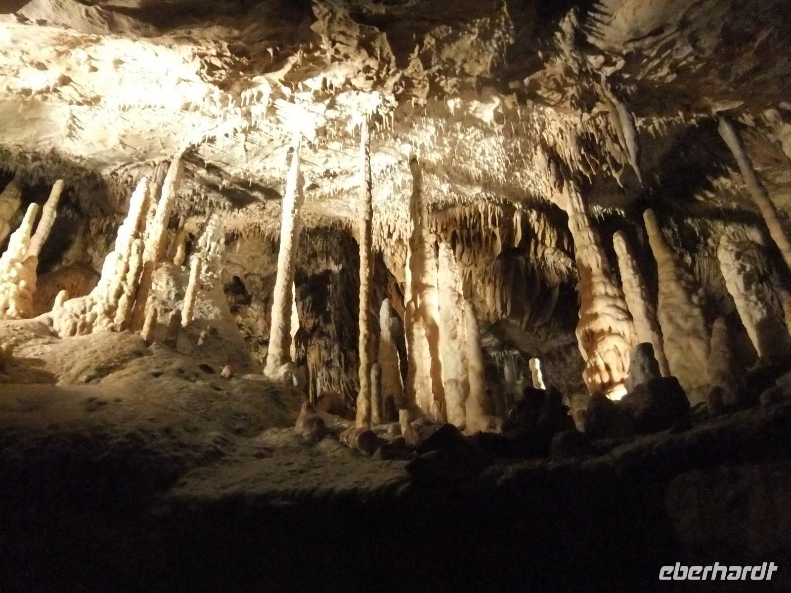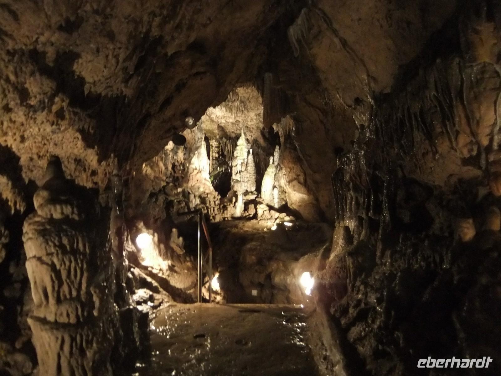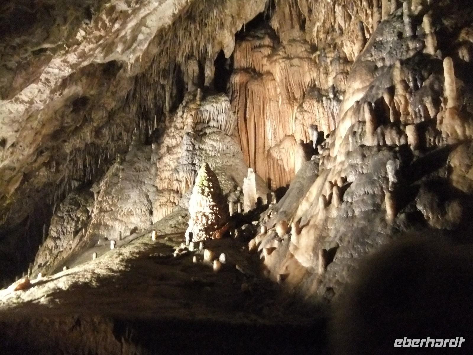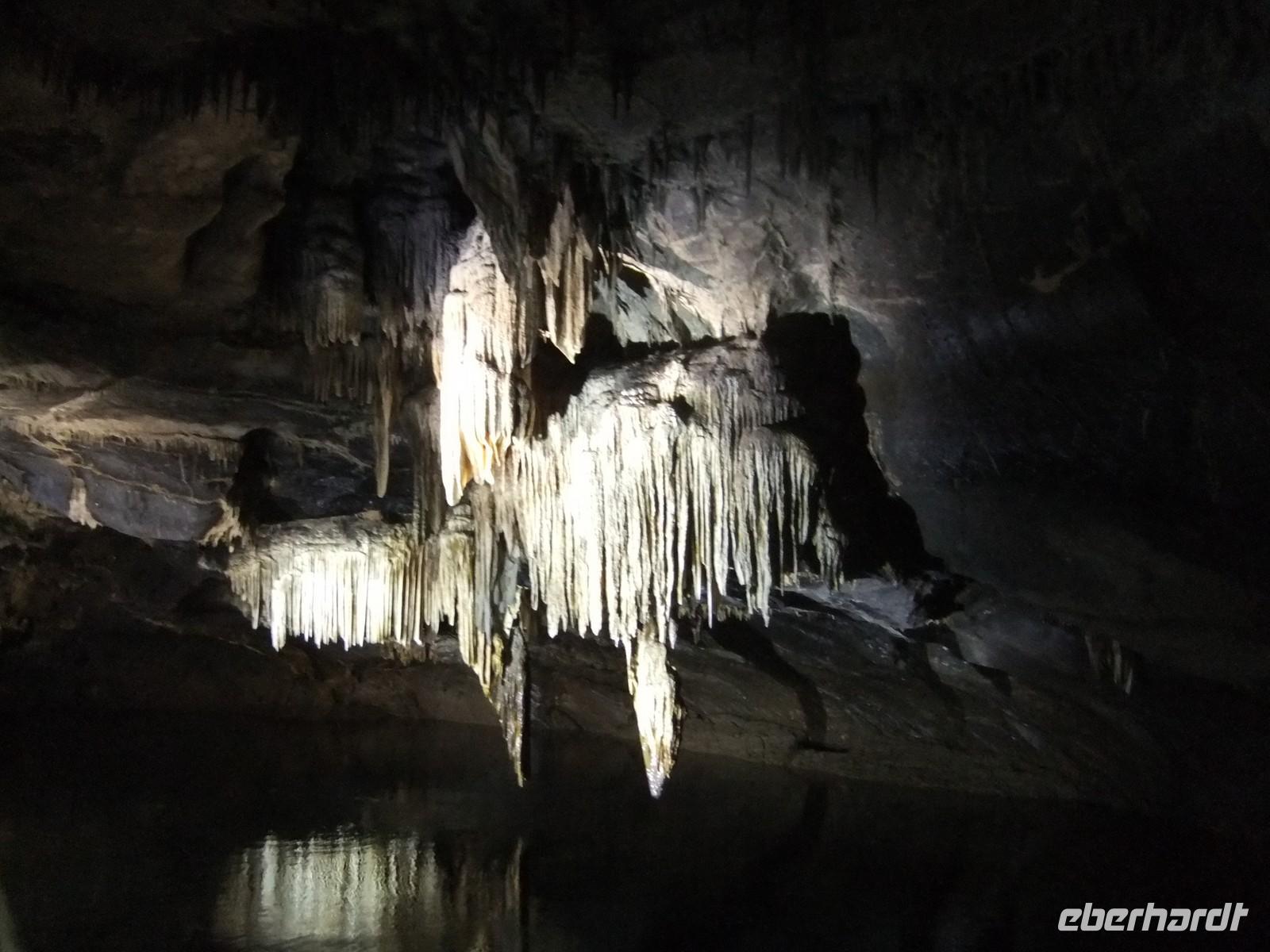 Nicht weit vom Schloss befindet sich einer der vielbesuchten Ausflugsziele von Belgien: die Grotten von Han-sur-Lesse. Die Lesse hat sich stellenweise tief in den Kalkstein durchgefressen und ein gewaltiges Höhlensstem gebildet, dessen Salle du Dome 62 m hoch ist. Nur 2 km des gesamten Weges durchlaufen und durchsteigen wir, es dauert 1 ½ Stunden. Immer wieder bietet diese unterirdische Welt neue Ausblicke. Fotografieren verboten, aber es wird fleißig fotografiert, der junge, sympathische Führer sieht das einfach nicht, eine nette Toleranz. Er ist Student, spricht ausgezeichnet Deutsch und verdient sich das Studiengeld mit den Trinkgeldern seiner Gäste. Am Schluss kommen wir wieder zur Lesse hinunter. Früher verließ man, wie auch die Schriftstellerin George Sand ganz geeindruckt berichtete, die Höhle mit dem Boot. Seit 4 Jahren geht das nicht mehr, da man mit Brücken einen Teil der Höhle für Rollstuhlfahrer erschlossen hat. Das sollte der Verzicht auf die kleine Bootsfahrt wert sein.