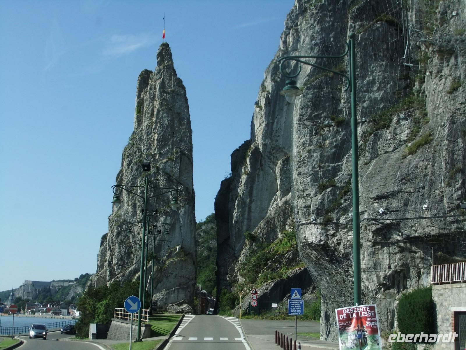 Ehe wir nach Dinant an der Maas kamen, musste sich der Bus durch den engen Spalt des Rocher Bayard schrittweise durchquälen. Der Riss in der Felsnadel entstand, als sich das Wunderpferd Bayard der vier Haimonskinder beim Sprung über die Maas hier mit den Hinterbeinen abstieß. In Dinant halten wir für einen Fotostopp des Stadtbildes mit der Stiftskirche Notre-Dame und der wehrhaften Zitadelle.