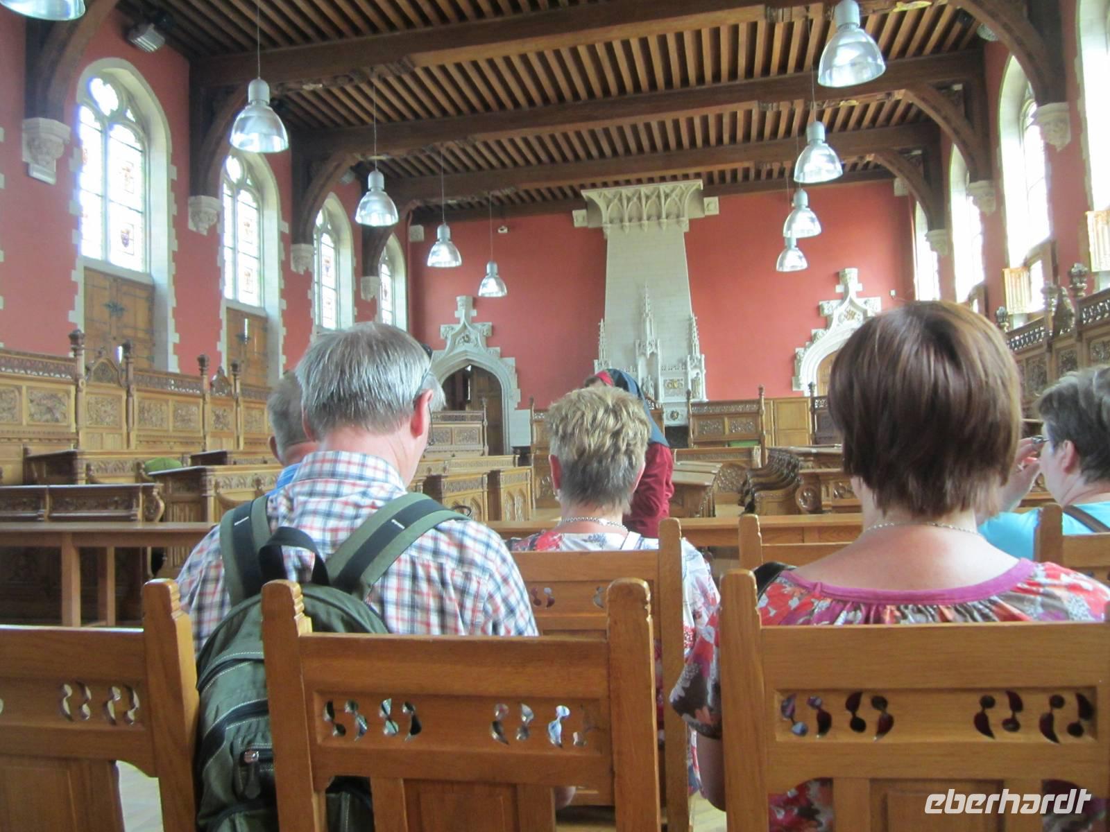 Heute geht es zu den Wallonen. Eine Überraschung haben wir geplant. Unser Zeitplan lässt es zu, dass wir Waterloo einplanen und den ca. 1h von Brüssel entfernten Ort aufsuchten. Ein Teil der Gruppe wollte schon den Hügel erklimmen und auch das Panoramabild sehen. Eine reichliche Stunde nehmen wir uns Zeit, den historischen Ort zu erkunden. Es war der 18. Juni 1815 an dem die Armeen von Napoleon von den Alliierten (Engländer, Preußen u. Holländer) geschlagen wurden. In Waterloo entschied sich nicht nur das Schicksal Frankreichs, sondern auch die Zukunft Europas. Es ist schon ein besonderer Moment am Löwenhügel zu stehen. Jetzt geht es aber weiter im Programm. Vorgesehen ist der Besuch des Wasserschlosses Lavaux -Stainte -Anne das im 14/15. Jahrhundert erbaut. Das Wasserschloss ist nicht nur schön anzusehen, sondern hat auch einen Lehrpfad auf dem Pflanzen und Tiere der Ardennen vorgestellt werden. Bei Sonnenschein lassen wir uns ausreichend Zeit und planen unsere Mittagspause ein bevor es weiter geht nach Han-suer-Lesse, dem Ardennenort mit einer der größten Tropfsteinhöhlen Europas. Unser Zeitplan ist bestens und es geht ohne großen Aufenthalt mit der Straßenbahn von 1930 zum Grotteneingang. Wir erleben eine Führung von ca 2 Stunden. Beeindruckend ist nicht nur die Größe der unterschiedlichen Stalagmiten- und Stalaktitensäle, sondern auch die Präsentation des Licht-und Tonschauspiels im Waffensaal bzw. auch der Kanonenschuss am Ende der Führung. Nach einem Fußweg von ca. 20 min treffen wir uns wieder am Bus. Unsere Weiterfahrt bietet einen schönen Blick auf die Ardennen bevor wir dann ins Maastal fahren um unser Hotel IBIS in Namur zubeziehen. Das Abendessen nehmen wir im Restaurant Lex Tanneurs ein. Hier werden wir ebenfalls mit einer hervorragenden Küche verwöhnt. Das Menü für heute Abend sieht vor: Zanderfilet mit Kerbelsahnesauce,Schweinefilet in traditioneller Senfsoße und zum Abschluss Birnenscheiben mit Mandelcreme im Teigmantel. Das richtige Essen für Genießer.