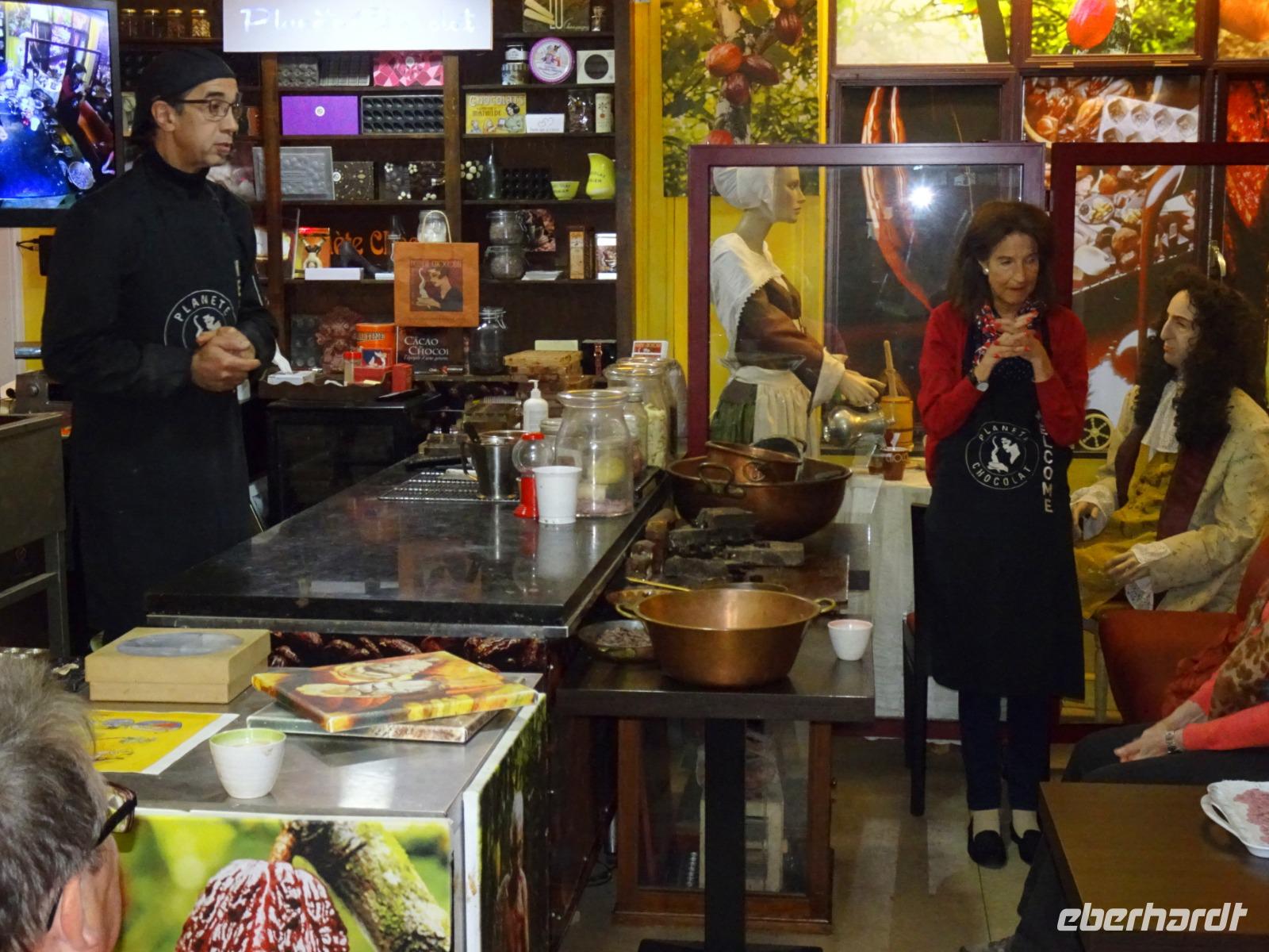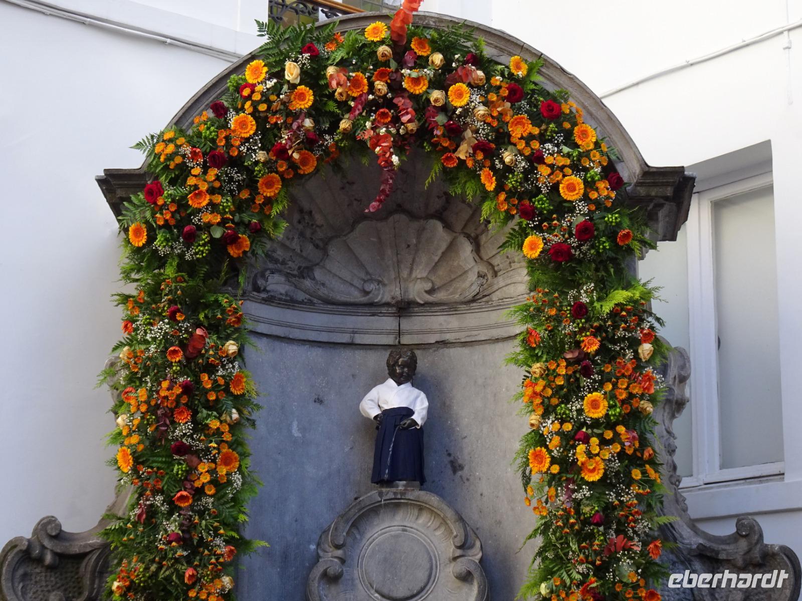 Anschließend ging es weiter zu Manneken Pis. In einem wunderbaren herbstlichen Blumenschmuck präsentierte sich der kleine Mann wie stets wohl gekleidet den Besuchern aus vielen Ländern. Weiter ging es durch die Altstadt zur Börse. Hier endete der Rundgang mit unserem Stadtführer. Für den Nachmittag gab er uns allerhand Tipps und Hinweise, z. B. zu empfehlenswerten Frittenläden, schmackhaften Waffeln und einem guten Kaffee. Attraktion des Nachmittags war ein Besuch in der Chocolaterie Planete Chocolat mit Vorführung der Pralinenherstellung. Wir folgten aufmerksam den mit französischem Charme vorgetragenen Ausführungen des Chocolatiers. Eine unserer Reiseteilnehmerinnen konnte sogar bei der Herstellung von Pralinen selbst mit Hand anlegen. Und gekostet und gekauft haben wir natürlich auch reichlich. Anschließend fuhren wir zurück nach Aalst, wo uns wieder ein schmackhaftes Drei-Gang-Menü erwartete: Brokkolicremesuppe, Kassler mit im Ofen gebackenen Rösti und anschließend ein Zitronenmousse mit Vanillebiskuit