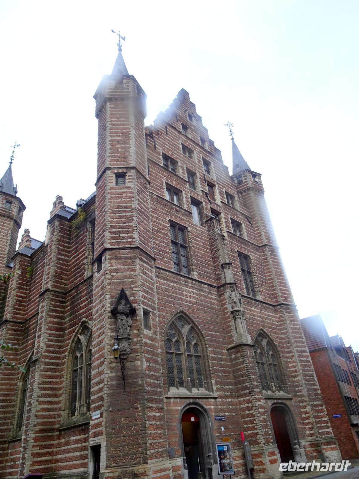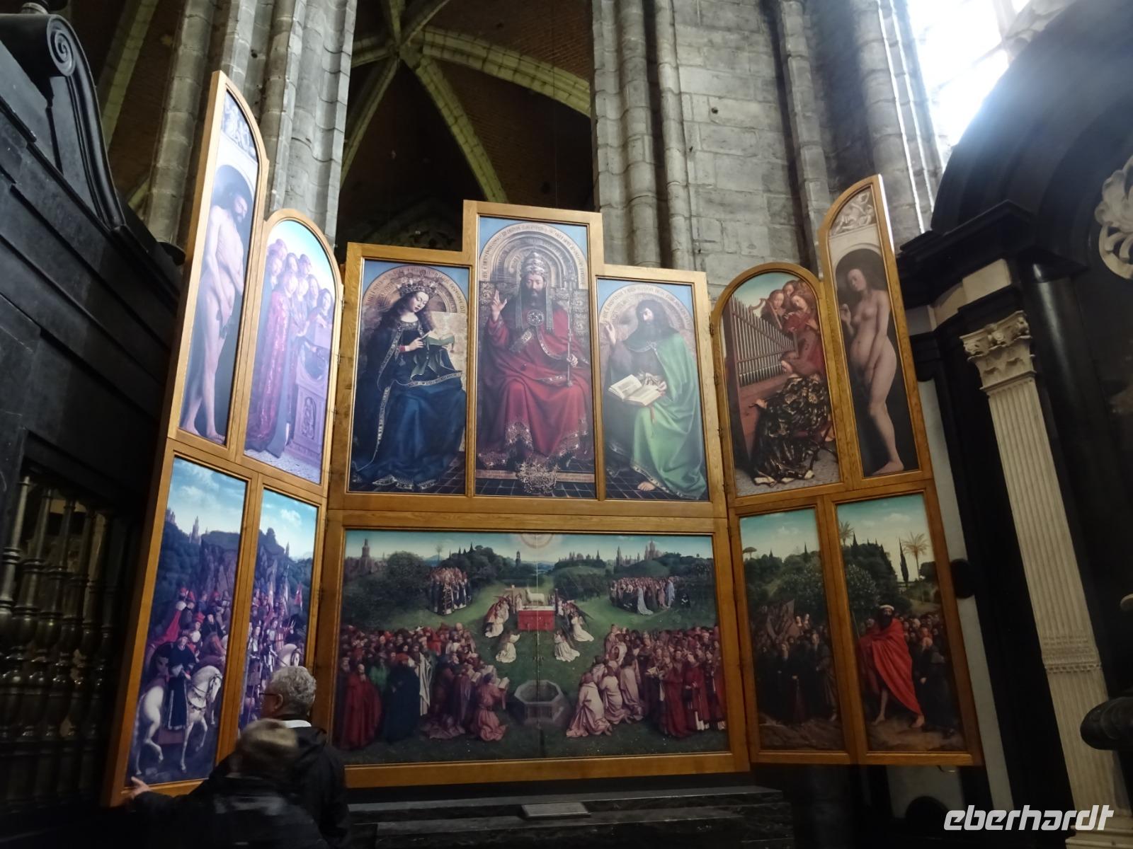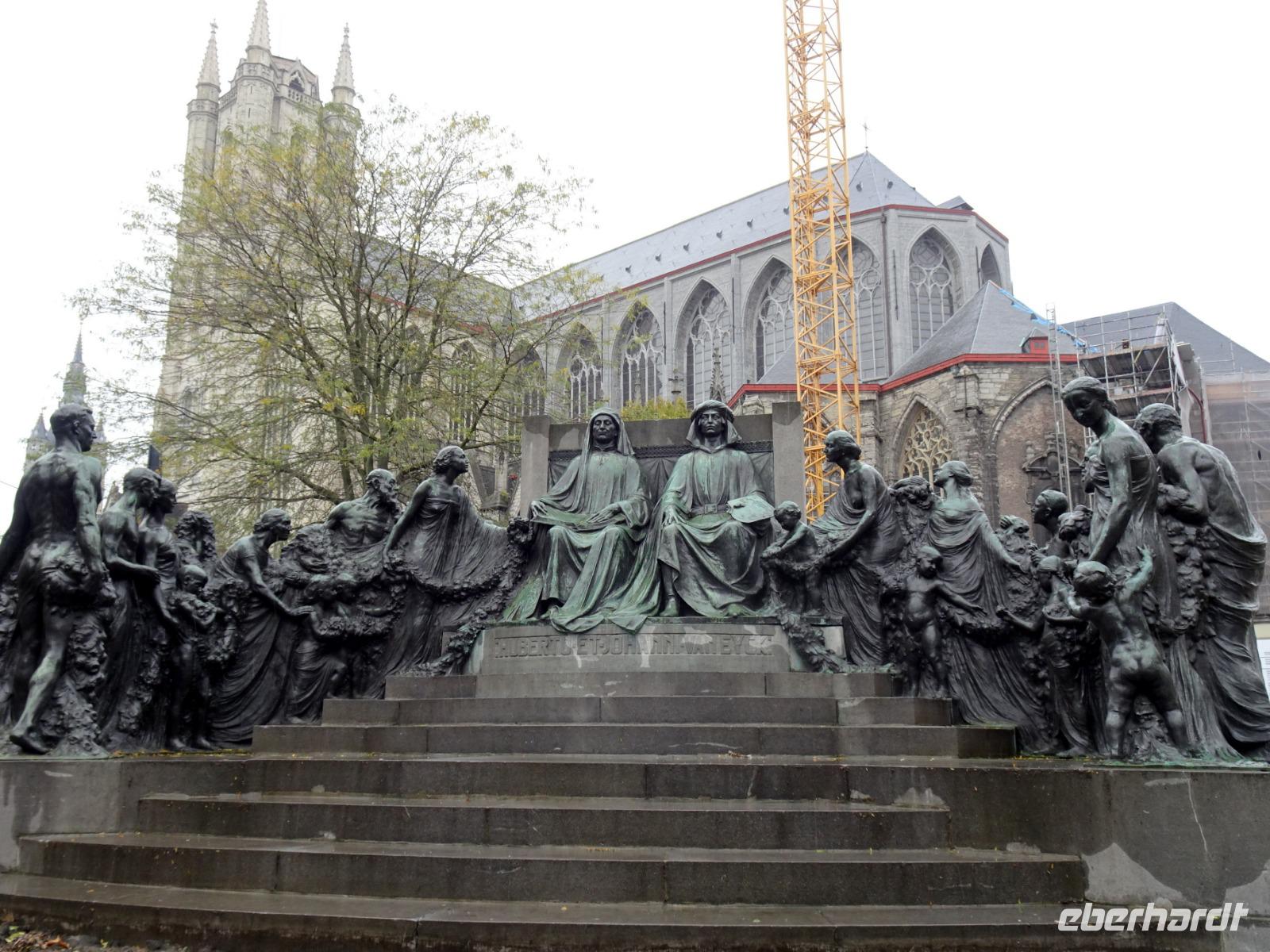 Da unser Stadtführer ein sehr guter Kenner des Genter Altars war, hat er uns ausführlich zum Aufbau und Inhalt des Genter Altars informiert. Anschließend konnten wir einen kleinen Blick auf das Originalgemälde mit den derzeit laufenden Restaurierungsarbeiten werfen. Ein kurzer Abstecher führte uns zu dem hinter der St. Bavo-Kathedrale liegenden Denkmal für die Maler des Genter Alters, die Gebrüder van Eyck.