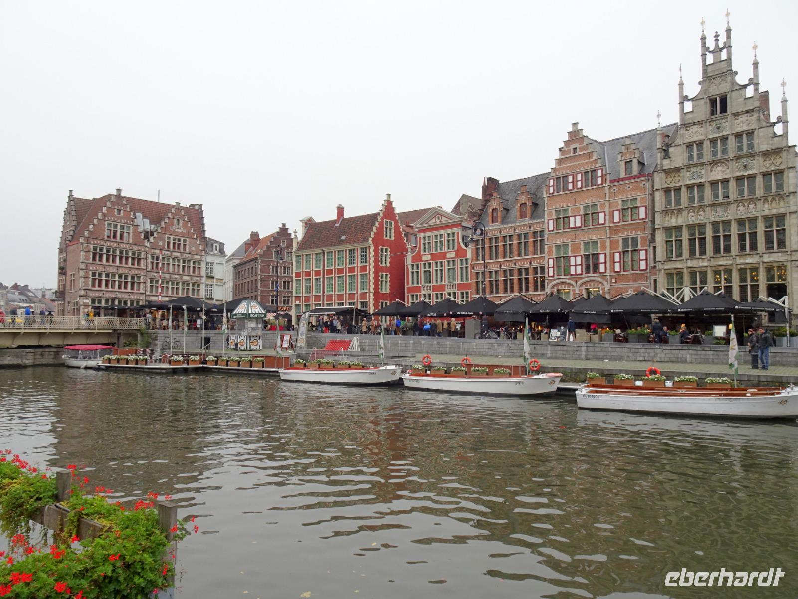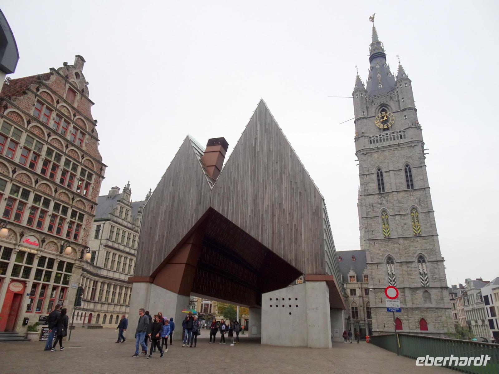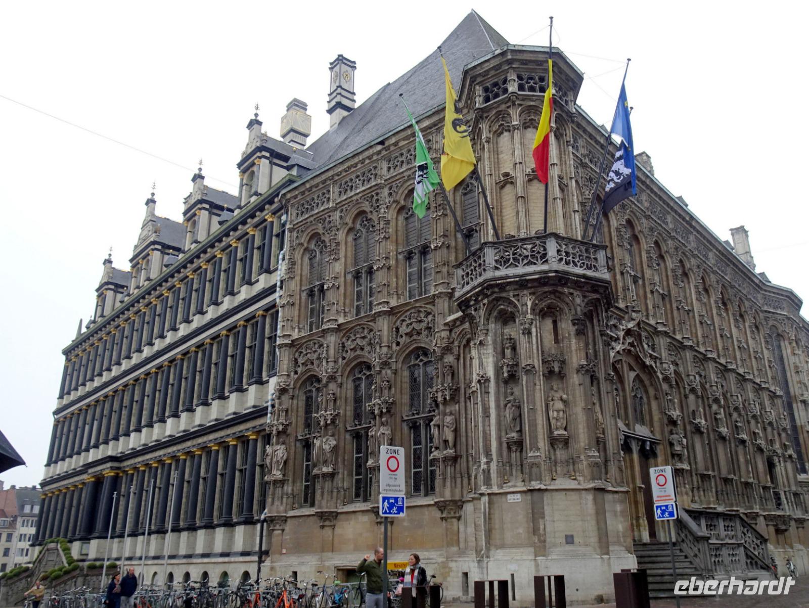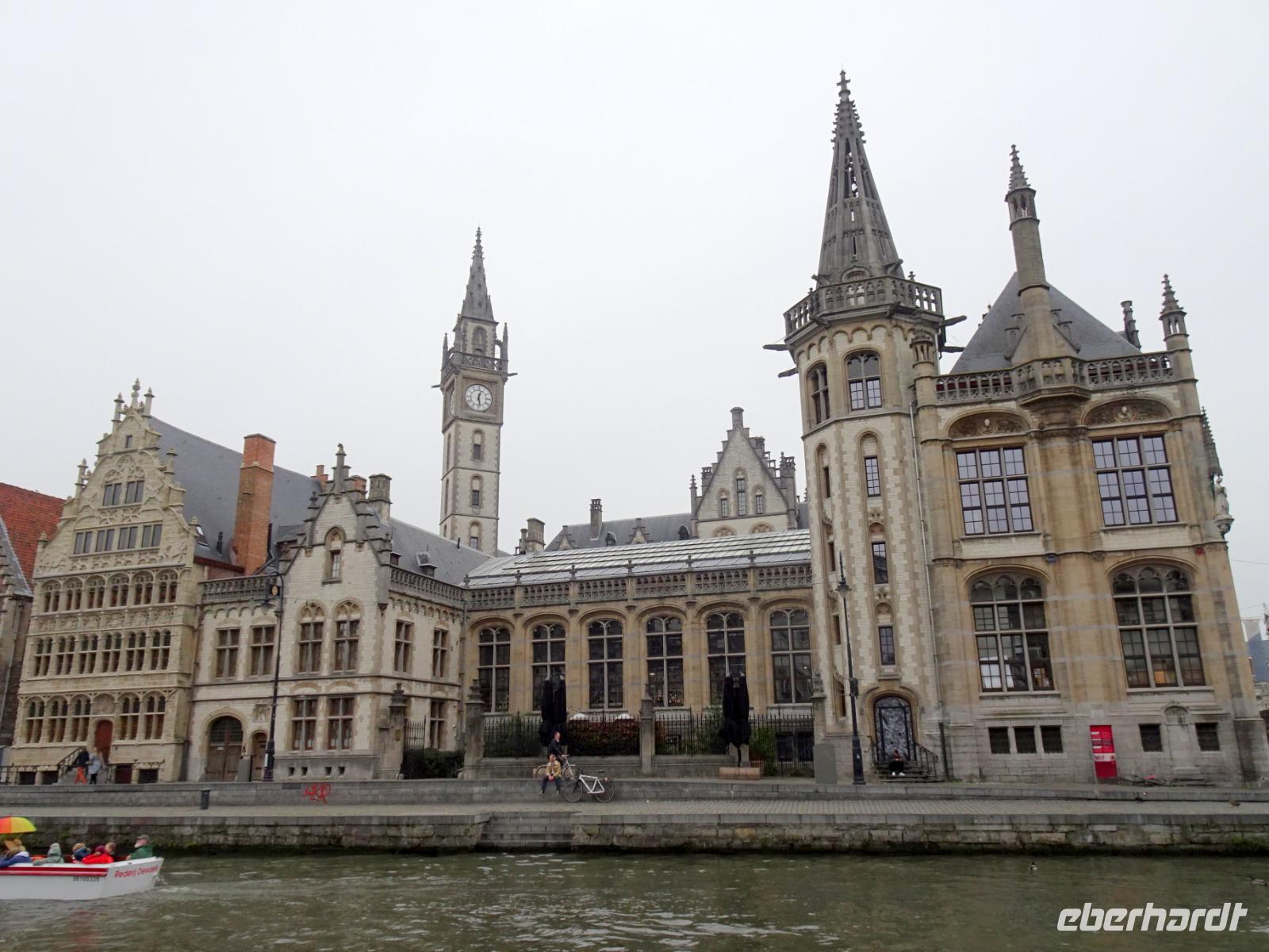 Erste Station war der Vrijdagmarkt (Freitagsmarkt) mit dem zentralen Denkmal des Anführers des Genter Aufstandes Jacob van Artevelde und den markanten Gebäuden der ersten Krankenversicherung und dem sozialdemokratischen Parteihaus. Wir querten die Grachten der Leie, sahen die Burg Grafenstein, das Gebäude des Fischmarktes, das Designmuseum und selbstverständlich die beiden Ufer der Leie - Korenlei und Graslei mit den markanten Lager- und Zunfthäusern. Anschließend ging es weiter in Richtung der St. Bavo Kathedrale mit dem Genter Altar. Auf dem Weg dahin gab es Zwischenstopps an der modernen Stadthalle, am Belfried und am Stadthuis.