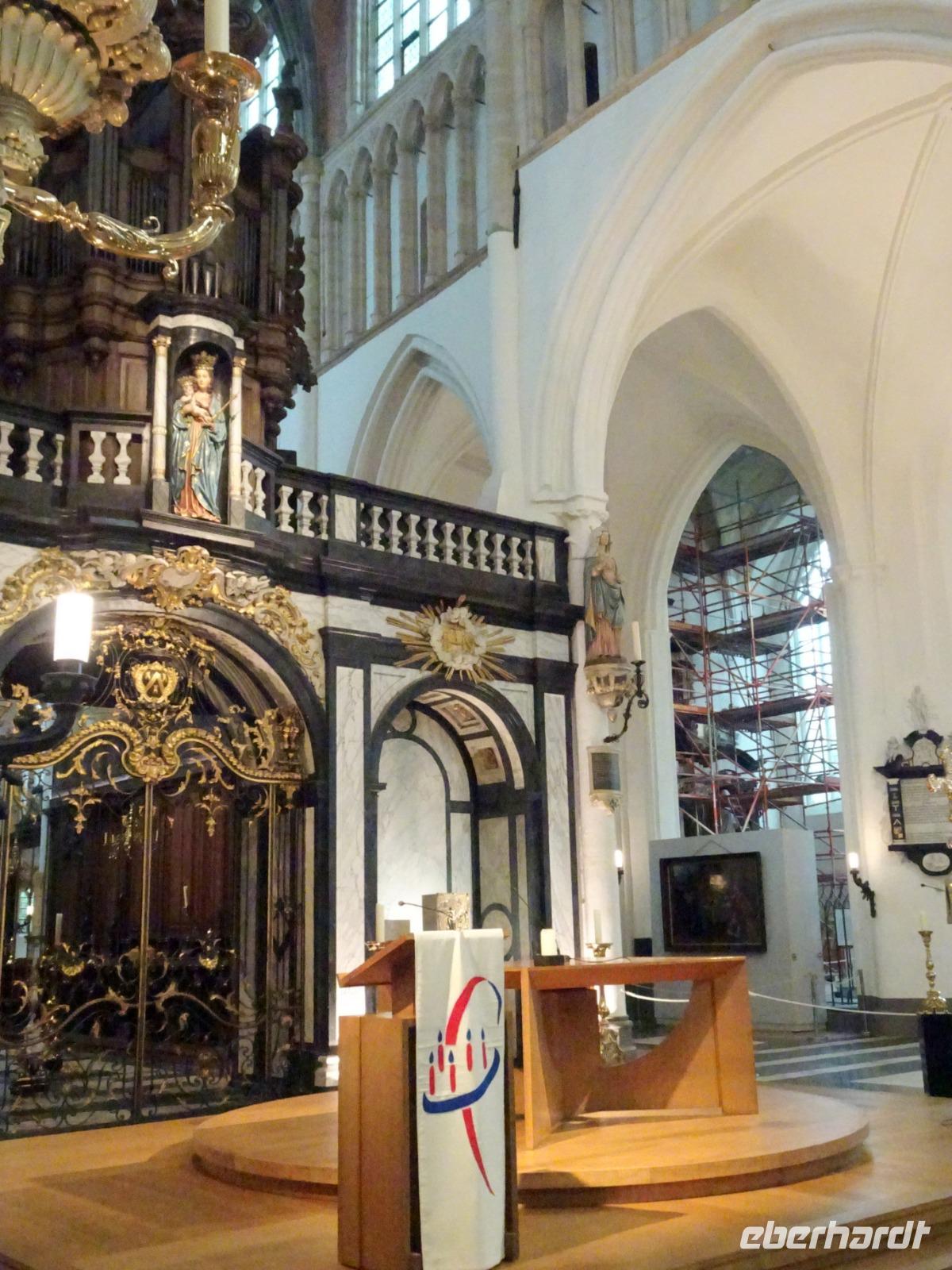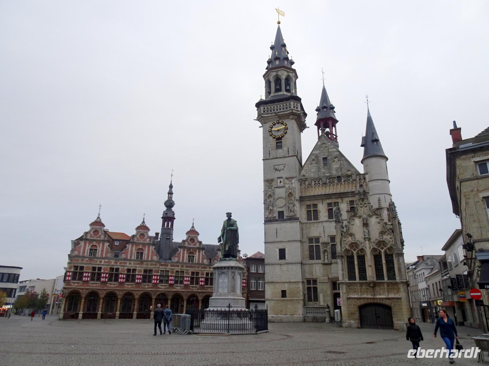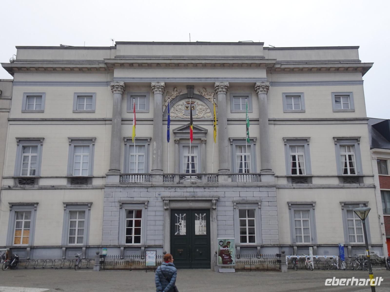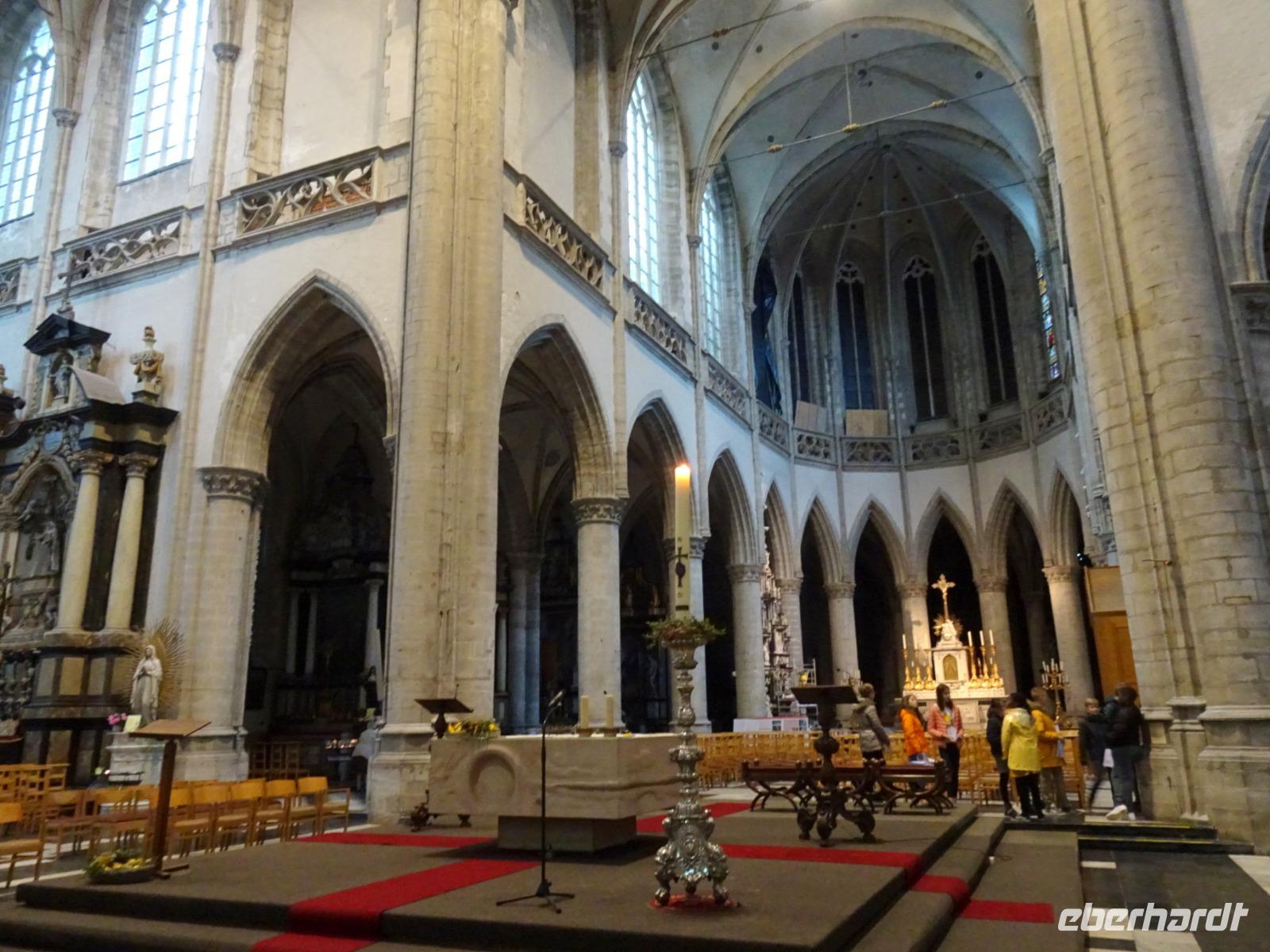 Vorher unternahmen wir jedoch mit unserem Reiseleiter Hartwig noch einen kleinen Stadtrundgang durch das Zentrum von Aalst. Aalst trägt den Spitznamen „Zwiebelstadt" wegen seiner traditionellen Zwiebelzucht. Aalst ist aber auch eine Karnevalsstadt. Wir machten deshalb zuerst an der Skulptur eines Karnevalisten Halt. Anschließend ging es weiter zum Großen Markt, wo wir uns das Gebäude der „Börse von Amsterdam", dem ältesten Rathaus Belgiens mit Belfried und das Stadthuis ansahen. Im Zentrum des Marktes ist ein Denkmal für den Buchdrucker Dirk Martens, der Thomas Morus „Utopia" druckte, nicht zu übersehen. Kurz vor dem sonntäglichen Gottesdienst statteten wir der St. Martinus-Kirche einen Besuch ab. Hier ist neben vielen attraktiven Altären insbesondere ein Bild von Rubens interessant, dass die Brauer gestiftet hatten. Es sollte gegen die Pest helfen.