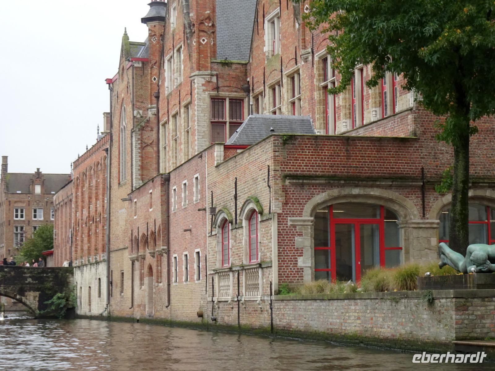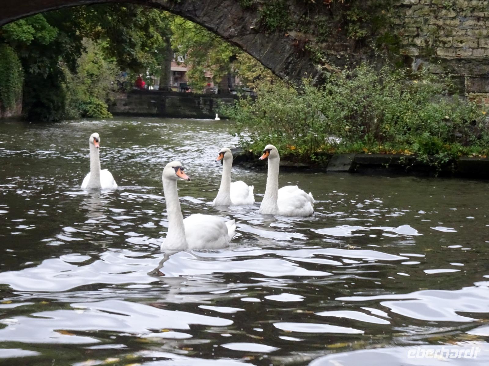 Wo wir vorher zu Fuß entlang gegangen waren, konnten wir die Stadt und die markanten Gebäude nun vom Wasser aus betrachten. Unser Boot wurde oft von den Wappentieren von Brügge, den Schwänen, begleitet. Wendepunkt war eine Gracht im ehemaligen Hanseviertel, wo auch ein Denkmal für die Gebrüder van Eyck an deren Wirken in Brügge erinnert. Danach bummelten viele noch durch die wunderbare Stadt, besuchten die Liebfrauenkirche mit dem Altar "Madonna mit Kind" von Michelangelo oder genossen Belgische Pralinen mit einem wohlschmeckenden Kaffee.