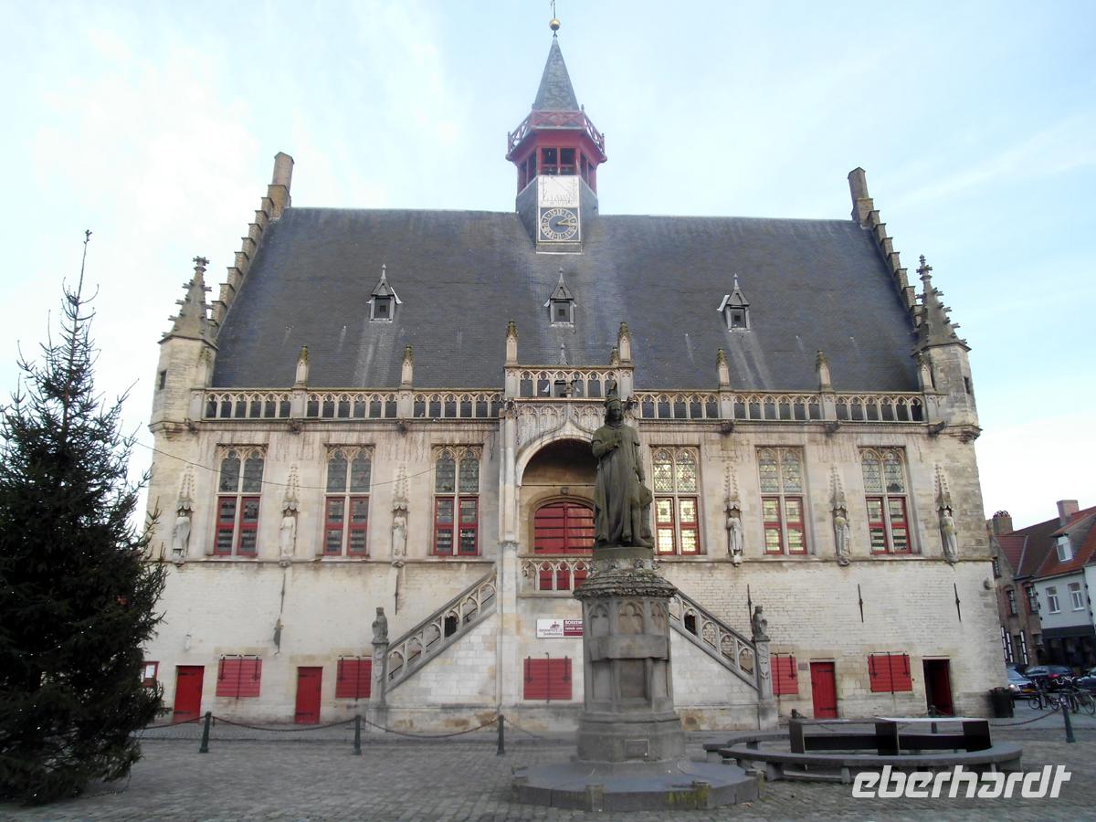 Nun begeben wir uns nach Damme. Diese kleine Stadt wurde angelegt, um Brugge den Zugang zum Meer zu sichern, denn der eigentliche Zufluss verlandete bereits im Mittelalter. Schön anzuschauen sind hier vor allem das gotische Rathaus und die riesige Kirche. Auch der erste Dichter, der in niederländischer Sprache schrieb, nämlich Jakob van Maerland stammt aus dieser Gegend. Vor dem Rathaus hat man ihm ein Denkmal gesetzt.
