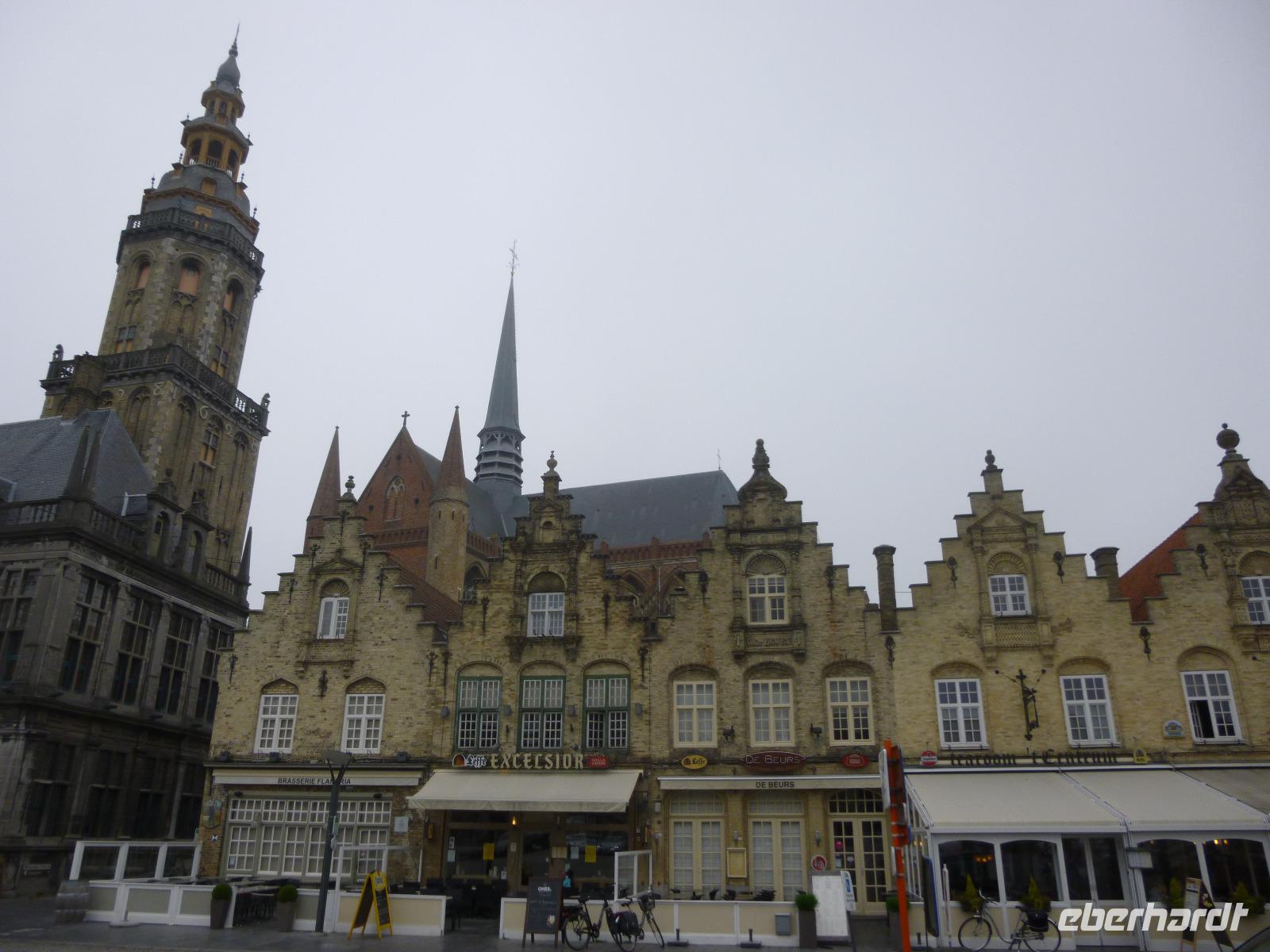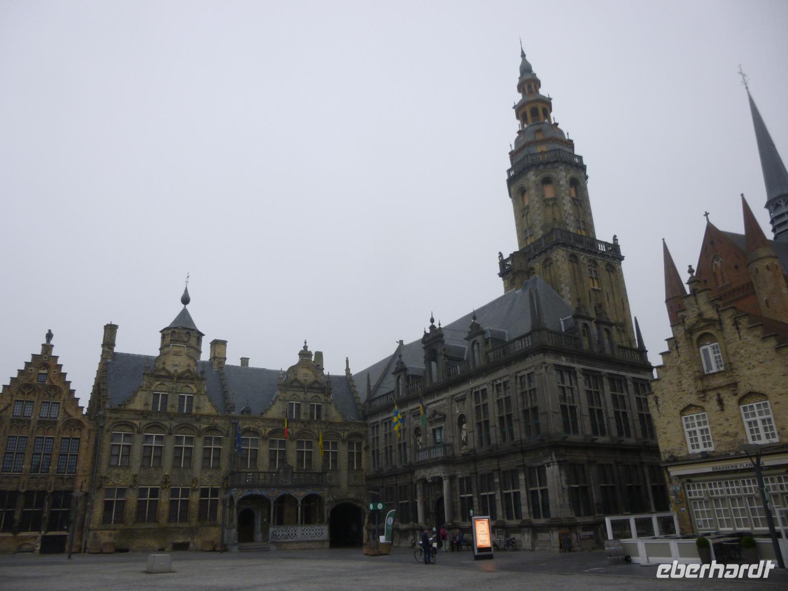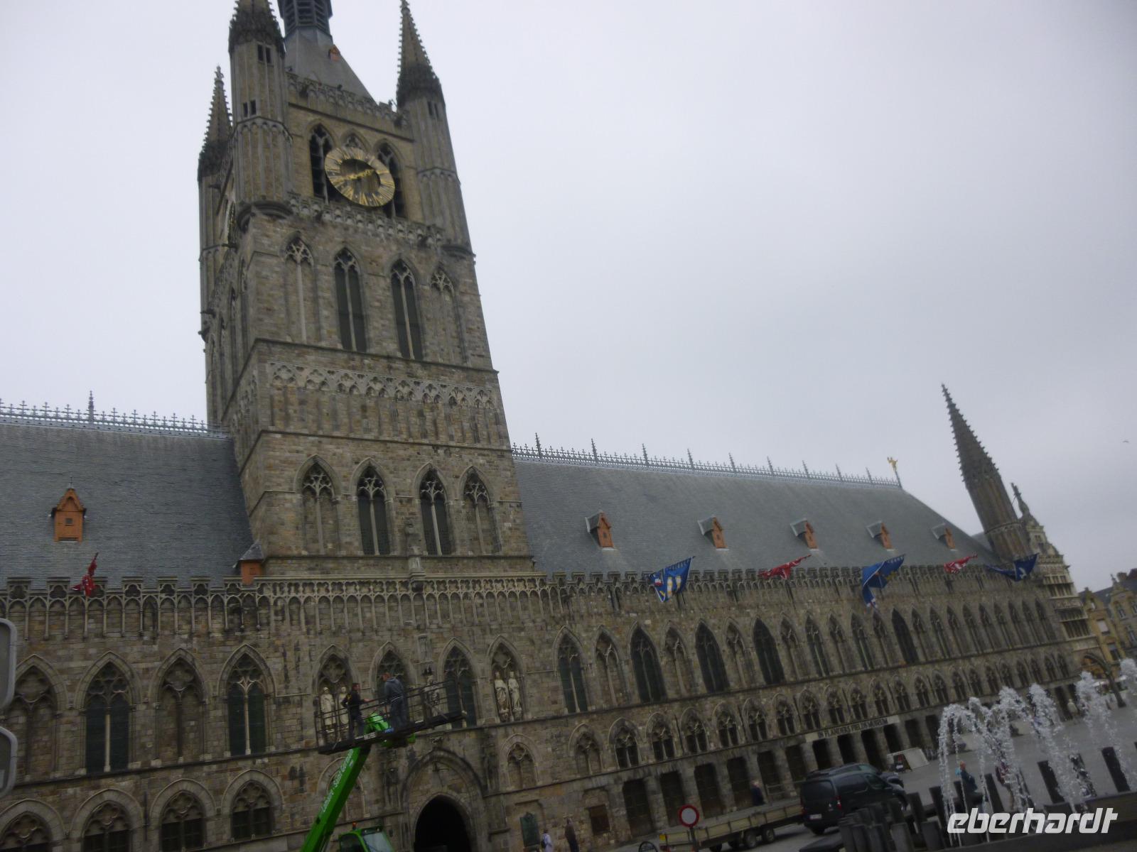 Ypern, einst die dritte im Bunde flandrischer Tuchstädte mit Brügge und Gent, errichtete zweimal eine gewaltige Tuchhalle mit Belfort: im Mittelalter und nach dem Ersten Weltkrieg, als die Stadt in Schutt und Asche lag. Auch dahinter die Martinskirche im Stil französischer Kathedralgotik einst in Schutt und Asche.