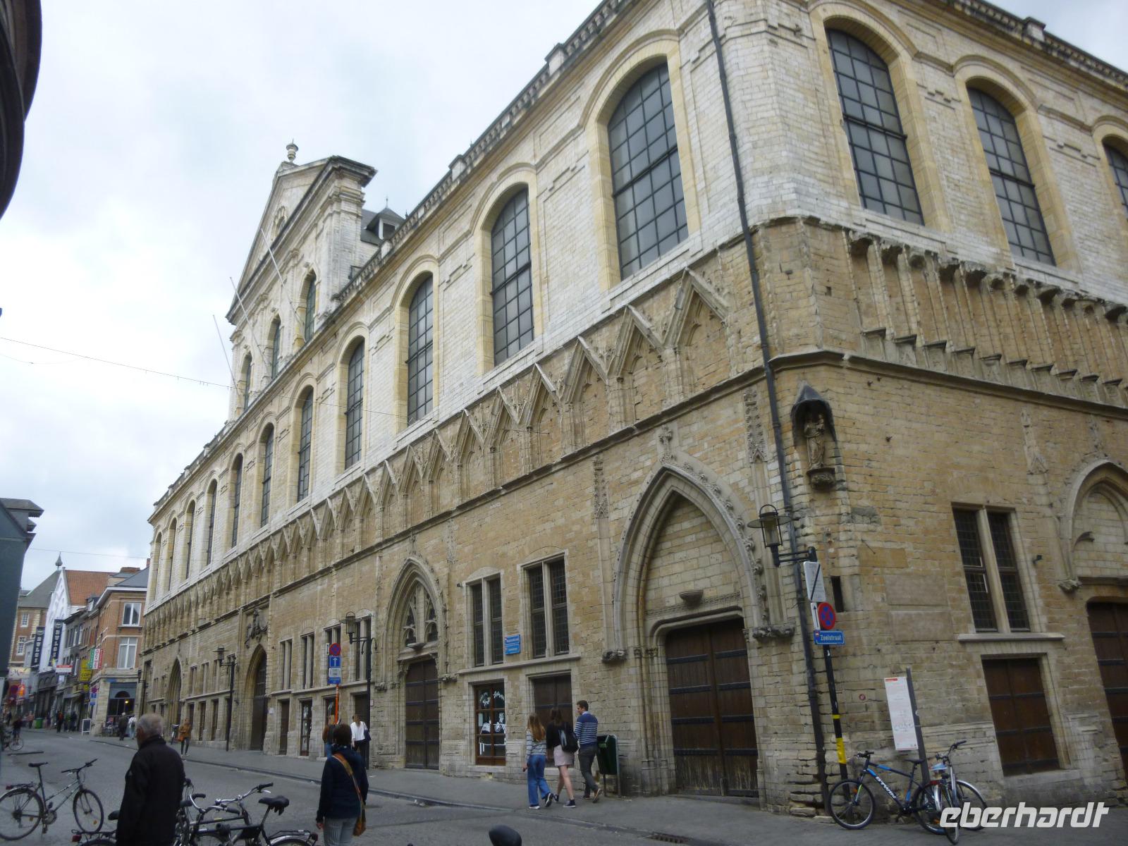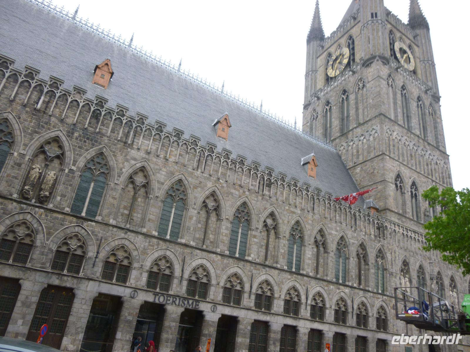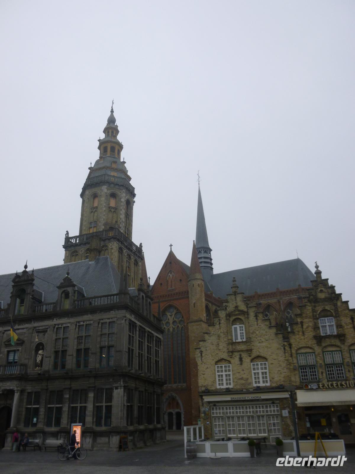 Ypern, einst die dritte im Bunde flandrischer Tuchstädte mit Brügge und Gent, errichtete zweimal eine gewaltige Tuchhalle mit Belfort: im Mittelalter und nach dem Ersten Weltkrieg, als die Stadt in Schutt und Asche lag. Auch dahinter die Martinskirche im Stil französischer Kathedralgotik einst in Schutt und Asche.