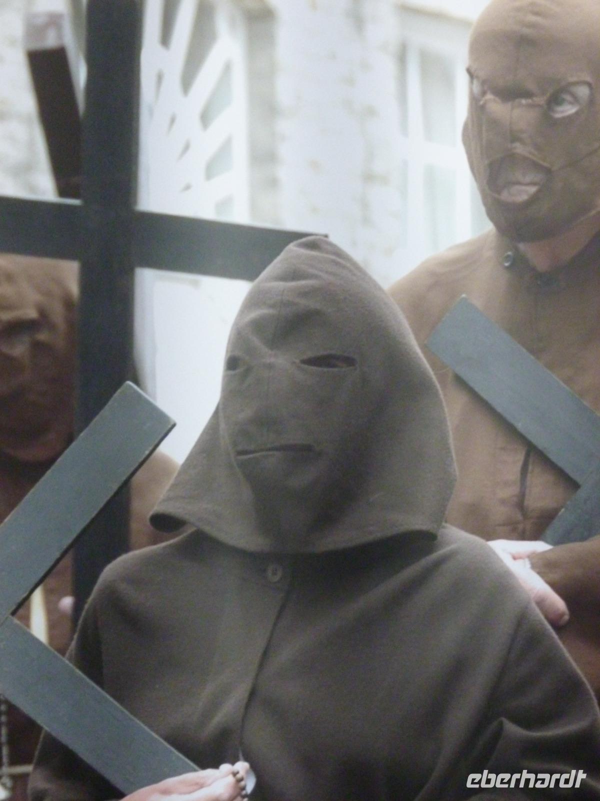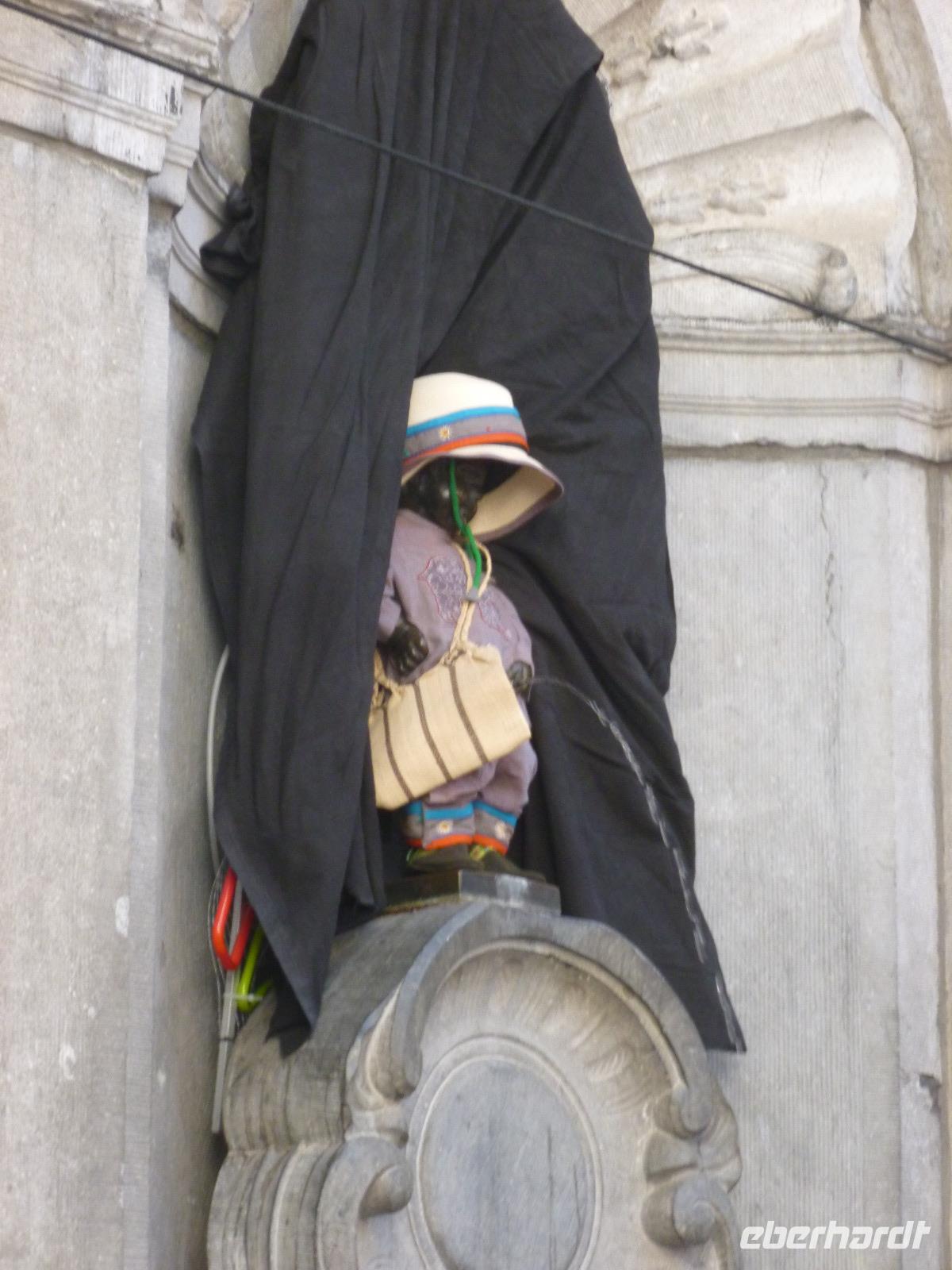 Danach lernten wir während unserer Verkostung die Welt der Schokolade kennen: etwas über die Geschichte, Herstellung und wie Pralinen entstehen. Wer mochte, konnte danach Männeken Pis in Schokolade kaufen. Dann hatten wir Freizeit und konnten die Kathedrale, den Kunstberg mit den Museen besuchen oder bummeln. Es entschieden sich viele von uns für das Bummeln, denn: Es war wieder einmal ein Volks-Fest angesagt wie in fast jeder Stadt, die wir besuchten: der Zinneken (Zinnodes)-Umzug aller zwei Jahre zog bald um den Großen Markt und zeigte 21 Gruppen aller Bevölkerungsschichten mit aktuellen kritischen Themen wie "Schwarz ist eine Farbe", "Illegal aber legitimiert", "Ich habe Dich, Du hast mich", "Wo ein Wille ist, kannst Du Berge bewegen"... Phantastische Kostüme aus einfachen Materialien zusammengestellt und mit viel Getöse vorgeführt.
