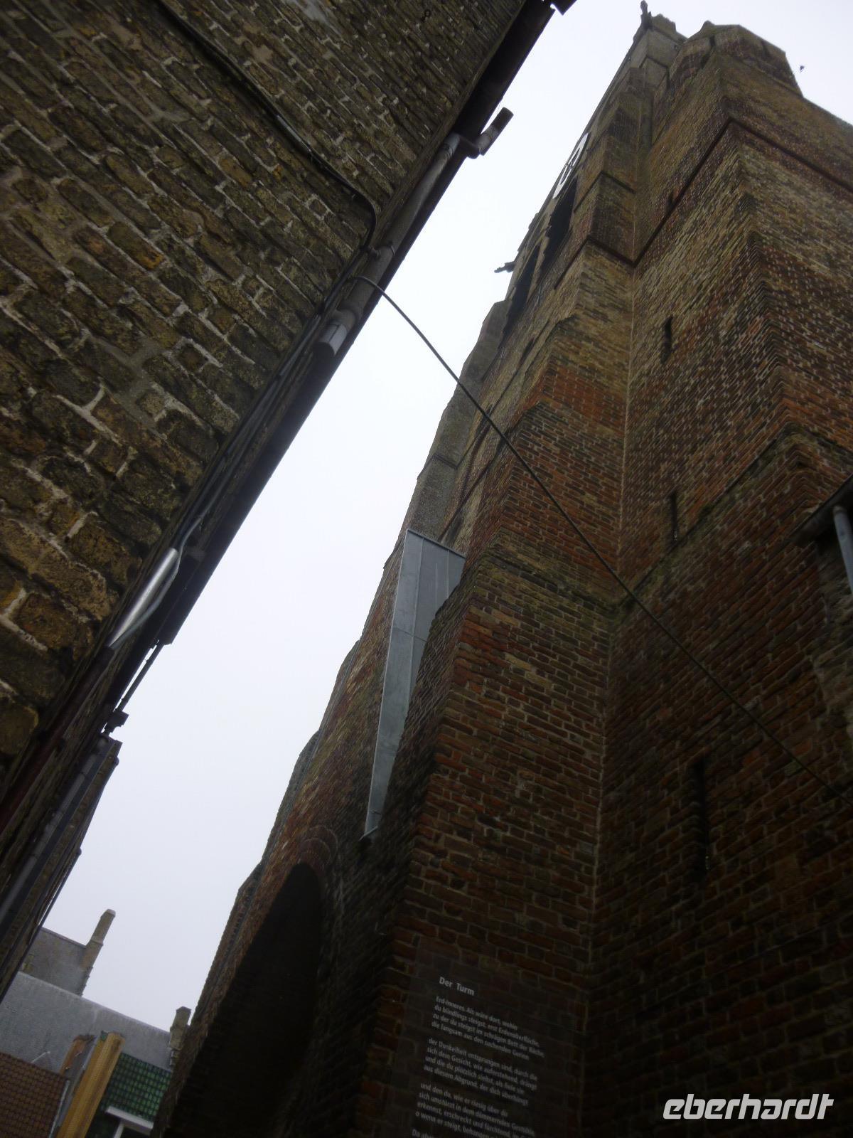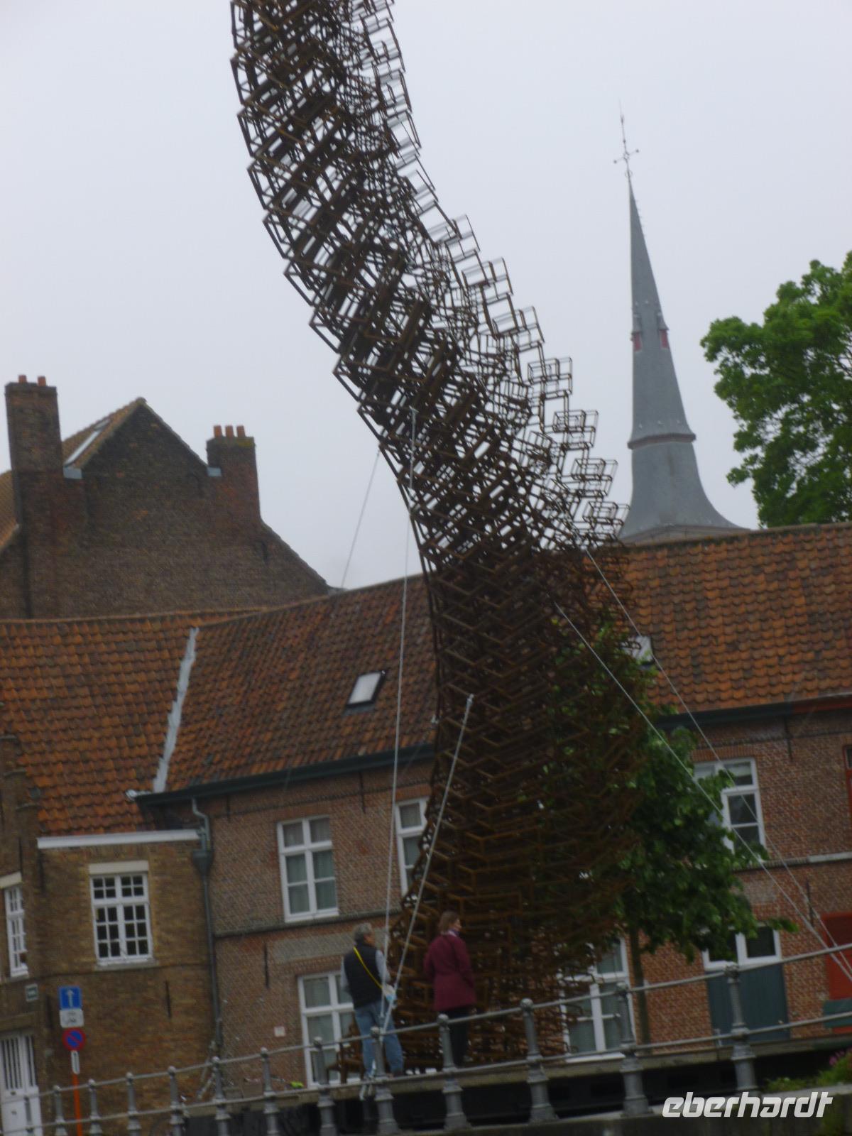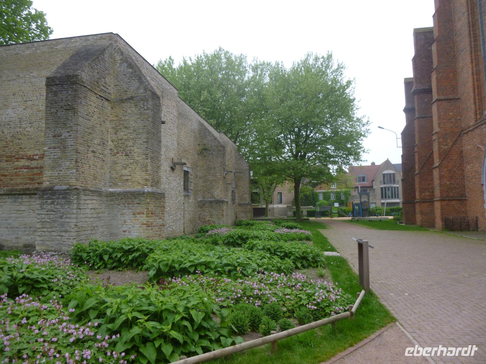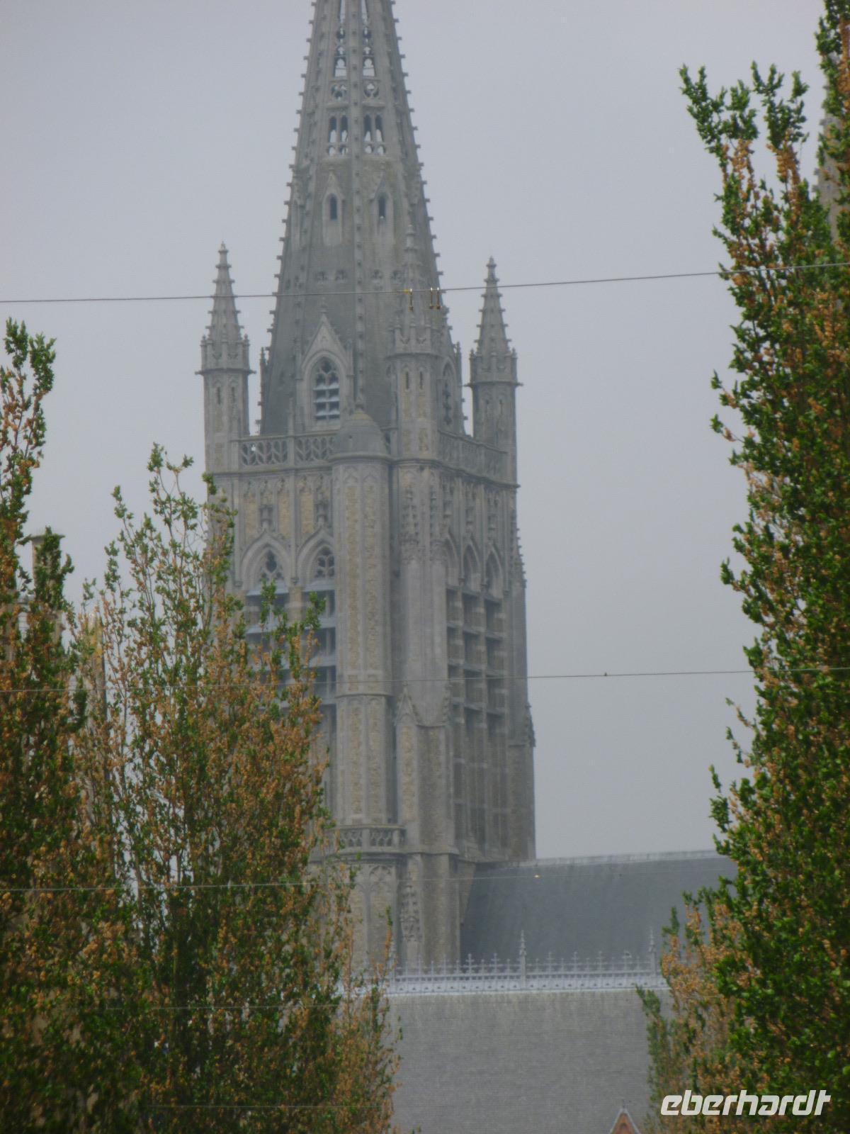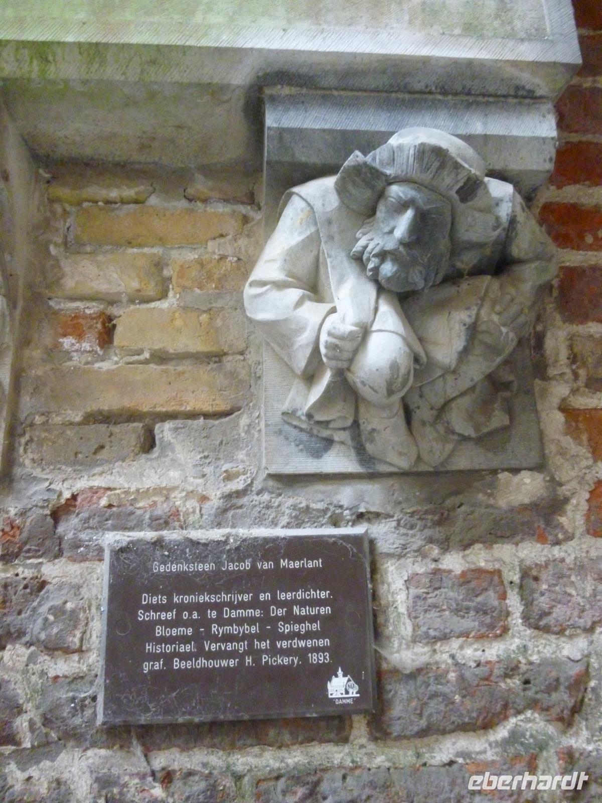 Unseren Kaffee tranken wir bereits in Damme, Buch-, einstige Garnisons- und Tyl Ulenspiegelstadt: Dammes Schicksal hing im Mittelalter am Zwin mit seiner großen Zeit im 13. Jahrhundert als Vorhafen von Brügge und Gent mit Burgunderwein- und Herings-Stapelrecht. Etwas später führte hier der legendäre Burgunderherzog Karl der Kühne seine dritte Braut zum Altar mit burgundischem Pomp: das Rathaus in Brabanter Gotik präsentiert noch heute sichtbar die Hoheitszeichen des Hauses Burgund. Mit Grit spazierten wir weiter entlang des Sint Janshospital: einst wurde dort "Pater von Damme", ein rotbraunes Bier, gebraut. Jetzt sollen dort Eigentumswohnungen entstehen. Der 43m hohe Turm der Liebfrauenkirche von früher Scheldegotik ist von weitem zu sehen: jetzt ist er reduziert auf den Chor, einer dreischiffigen Halle aus dem 14. Jahrhundert. Wir betrachteten die mittelalterlichen Konsol-Apostelfiguren und das zeitgenössische Abendmahl aus Plastikgeschirr und wer wollte, konnte zu Fuß des Maerlandtgrabsteins (der niederländische Dante) den Turm besteigen und die Aussicht von Kirchturm zu Kirchturm im flachen Polderland genießen.