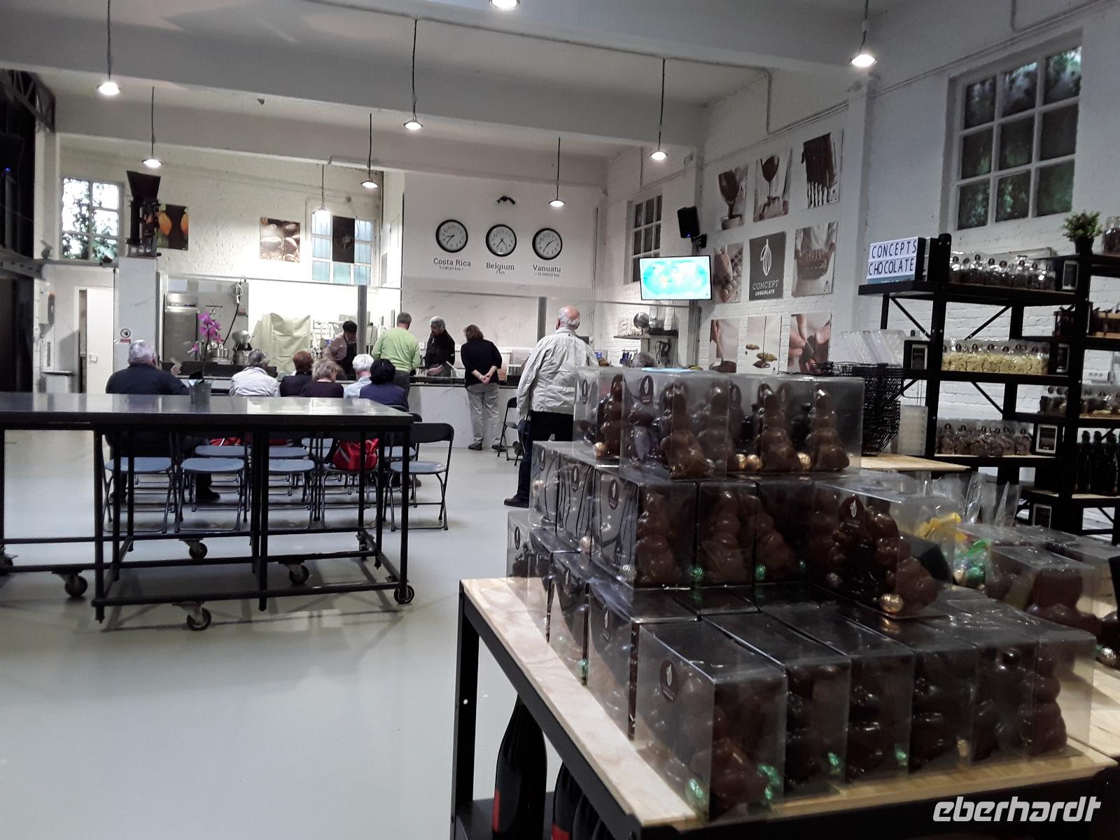 Am Nachmittag ging es in eine kleine Chocolaterie Duval. Als echte „Garagenfirma" gab es eine Präsentation der Herstellung, der Qualitäten und der Erzeugnisse aus Schokolade. Auch eine unserer Reiseteilnehmerinnen konnte sich in der Kunst der Pralinenfertigung üben. Und kosten durften selbstverständlich alle. Wir nutzten die Gelegenheit, uns mit den qualitativ hochwertigen Erzeugnissen diese Chocolaterie zu versorgen.
