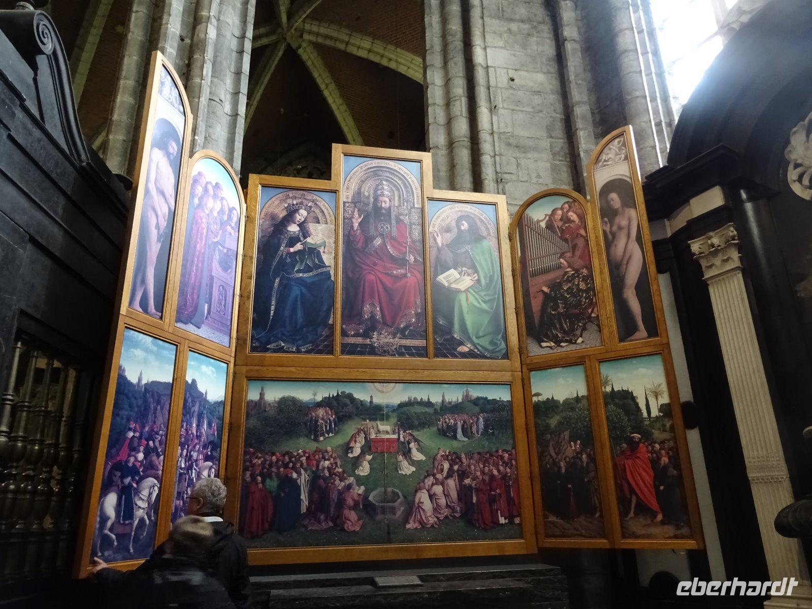Heute galt es schon wieder, die Koffer zu packen. Fahrtziel war Brügge. Wir nutzten die Fahrt, um uns in einem Stopp die wunderbare Stadt Gent anzusehen. Es nieselte. Auf einem sonntäglichen Trödelmarkt deckten sich einige mit Regenschirmen ein, sehr zur Freude der Verkäufer. Unser Reiseleiter Hartwig zeigte uns die markantesten Gebäude und Stadtansichten, u. a. die Burg Gravenstein sowie an der Leie Graslei und Korenlei als Gilde- und Zunfthäuser des Mittelalters. Eine mit Grafitti verzierte Straße war für viele der Reiseteilnehmer sehr interessant. Auch in Gent begegnete uns wieder ein wunderbarer Belfort mit Glockenspiel, ein Stadthaus und eine moderne Stadthalle. Höhepunkt war der Besuch der St. Bavo Kathedrale. Weltberühmtes Kunstwerk ist in dieser Kathedrale der Genter Altar der Gebrüder van Eyck. Da er gegenwärtig restauriert wird, konnten wir uns im Kirchenraum nur Kopieren ansehen. Einige von uns nutzten jedoch die Gelegenheit, sich in der Restaurierungswerkstatt das Original anzuschauen.