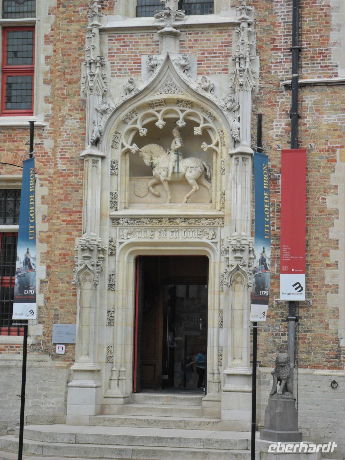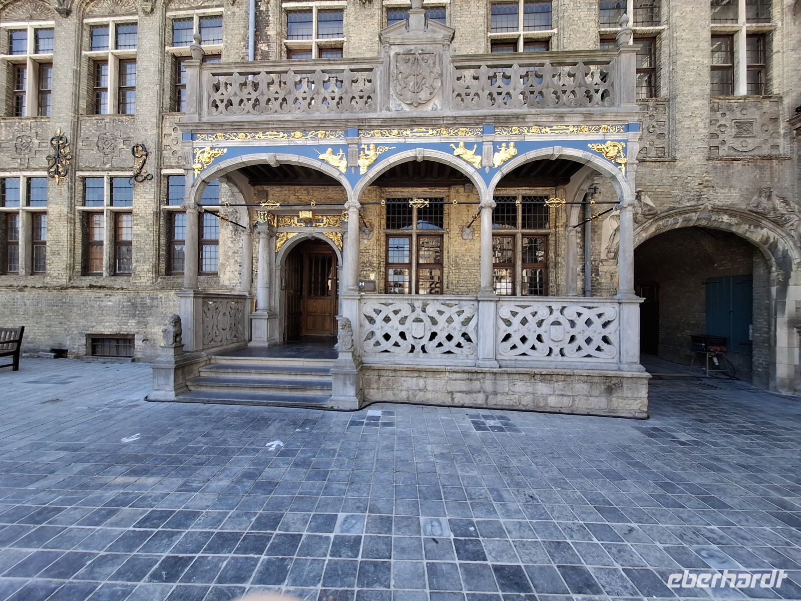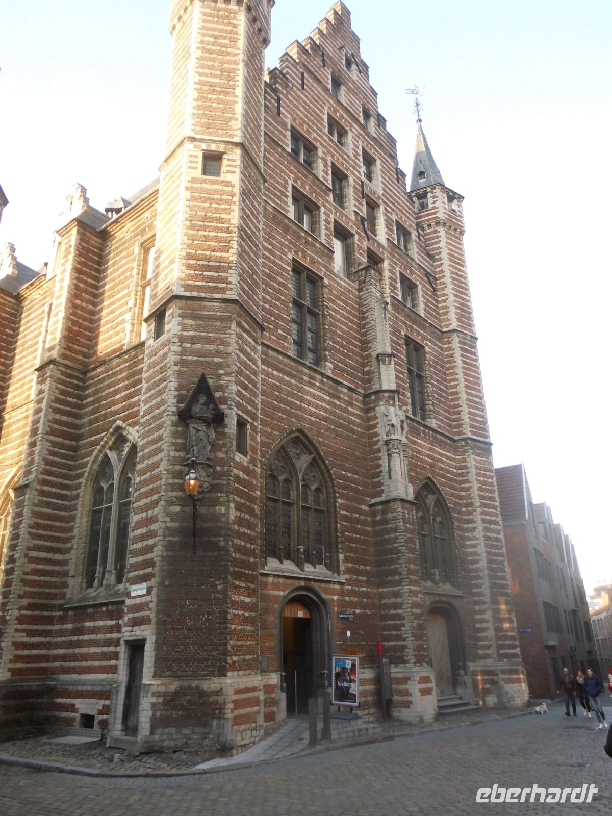 Als nächstes sahen wir das „Vleeshuis“, einst Gildehaus der bedeutenden Fleischerzunft. Das herrliche Gebäude ähnelt trotz seiner höchst profanen Bestimmung eher einer Kirche und entstand als spätgotisches Bauwerk der Baumeisterfamilie de Waghemakere. Seine Steineschichtung – rote Backsteine und weiße Kalksteine – sollte an den Speck und das Fleisch erinnern, mit denen die Fleischer täglich hantierten.