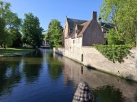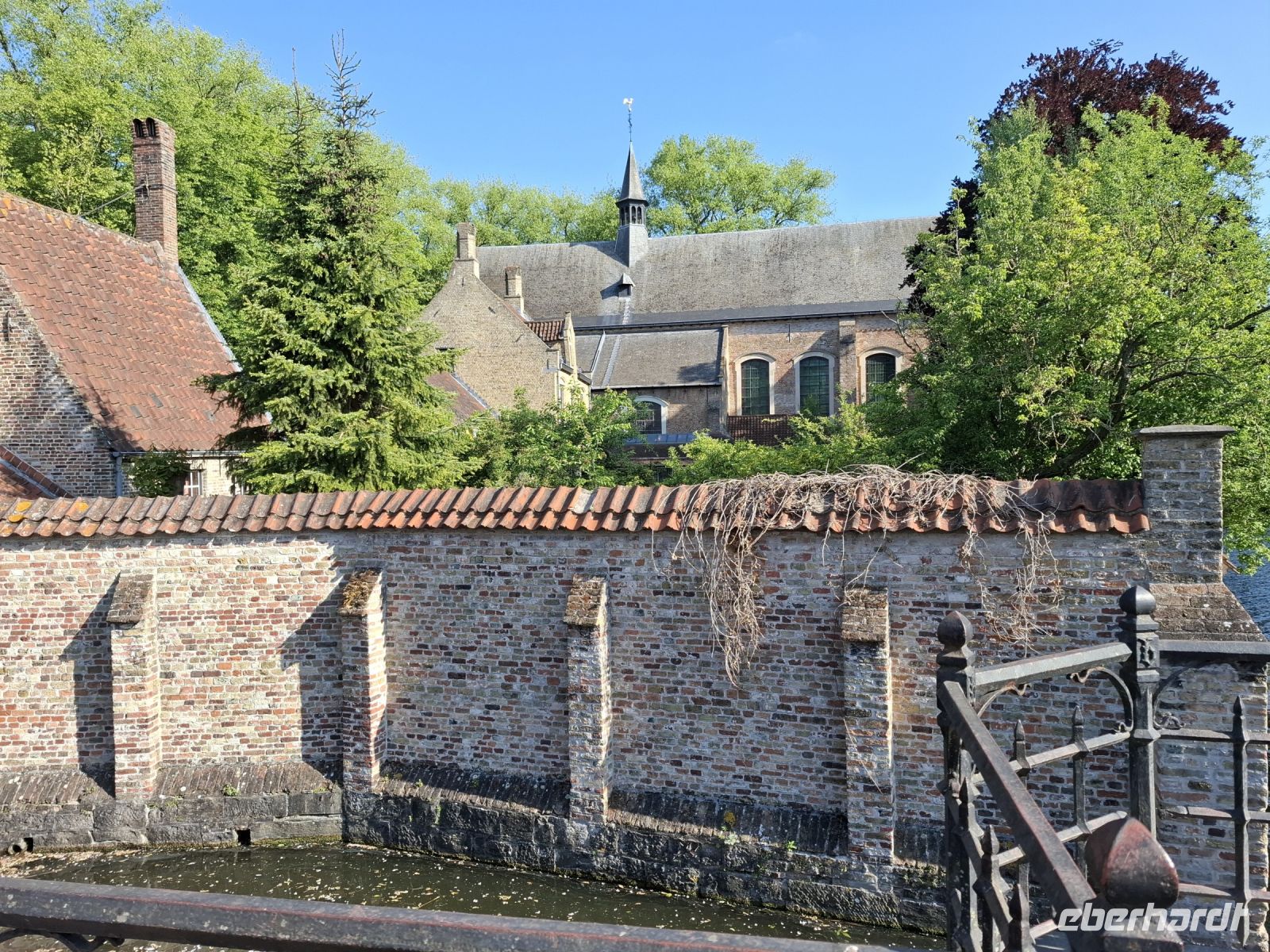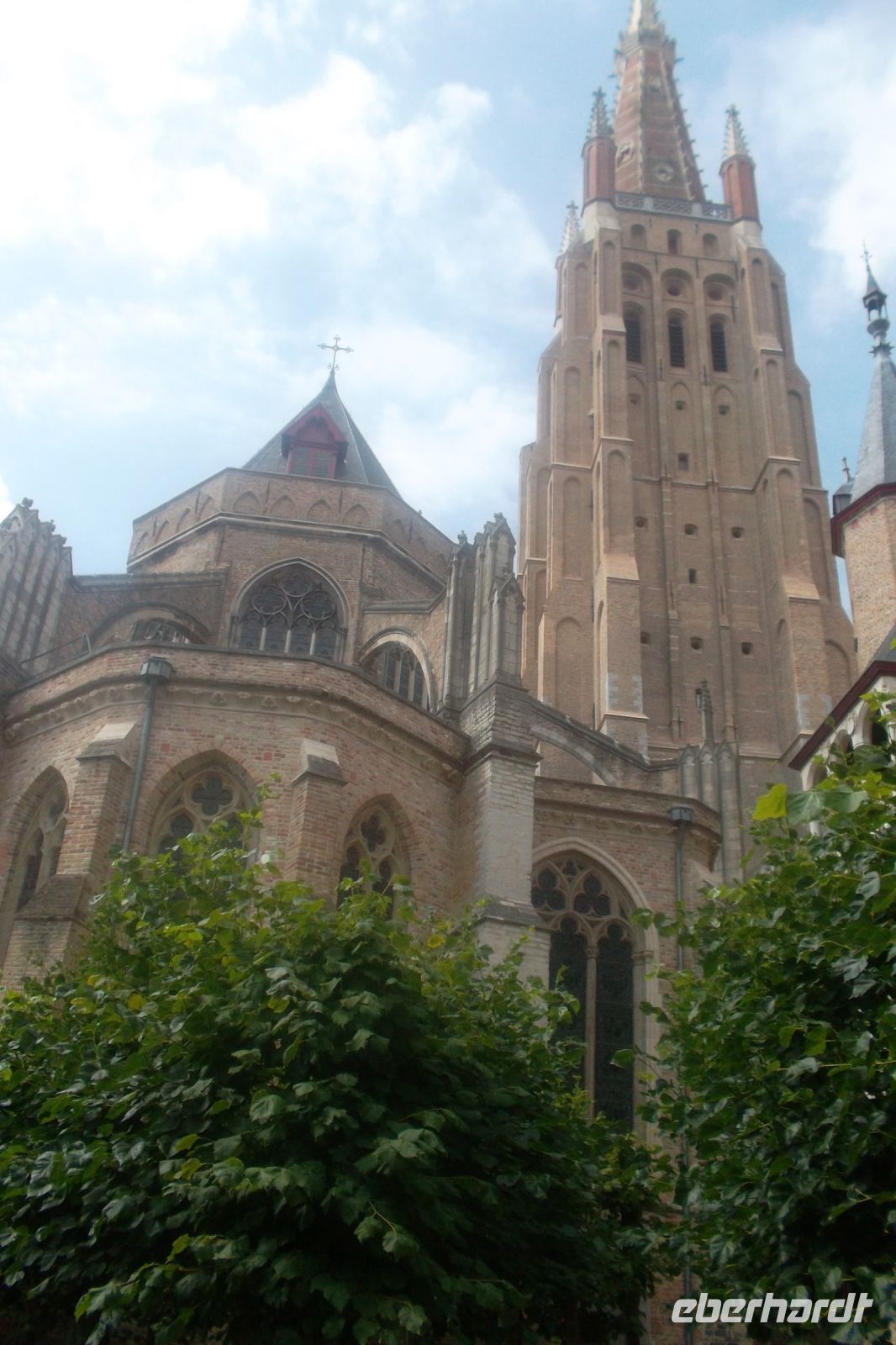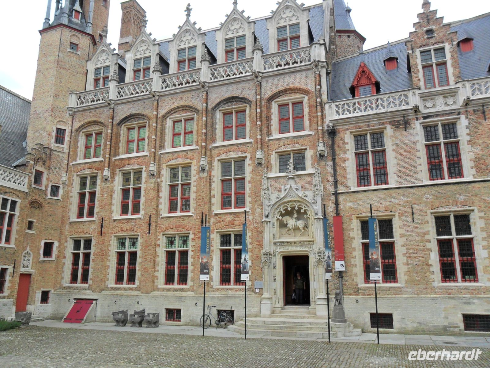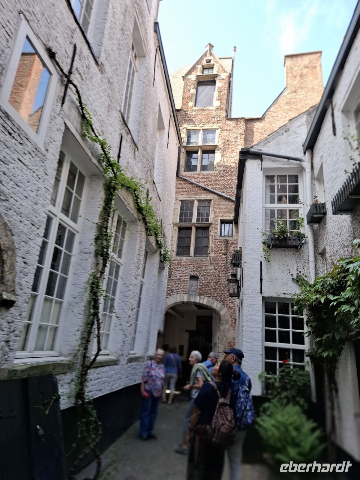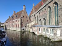 Bei herrlichem Sonnenschein gingen wir nach einem guten Frühstück vom Hotel aus los und begannen unseren heutigen Stadtrundgang durch die einstige bedeutende Hafenstadt am „Minnewater“. Dieser heute „Liebeswasser“ genannte Teich war früher der äußere Handelshafen des reichen Brügge. Zwischen ihm und dem „Binnenhafen“ befindet sich eine alte Schleusen- und Wehranlage. Da die Grachten der Brügger Innenstadt – hier übrigens als „Reie“ bezeichnet - in ihrem Wasserspiegel einen knappen Meter tieferliegen als die äußeren Kanal- und Hafenanlagen, mussten einst alle Waren hier ausgeladen – verzollt – und dann auf Fuhrwerken und Kleinbooten durch Brügge transportiert werden. Gleich am alten Zollhaus liegt auch der große historische Beginenhof. Hier lebten ähnlich viele Beginen - Schwestern einer christlichen klosterähnlichen Gemeinschaft ohne bindendes Gelübde – wie in Leuven. Vom Beginenhof gingen wir dann über den „Walplein“, auf dem früher Bier und Zutaten dafür verkauft wurden, in Richtung Innenstadt. Auf der Brücke über die „Rei“ am Sint-Jans-Hospital muss man unbedingt halten – hier sieht man eines der ältesten Krankenhäuser Europas (übrigens noch bis in die 70er Jahre des vorigen Jahrhunderts in Betrieb), das seinen eigenen kleinen Hafen hatte. Heute befindet sich hier ein Kunstzentrum, in das auch das Memling-Museum und eine alte Apotheke integriert sind. Gleich daneben liegt die Liebrauenkirche mit ihrem markanten Turm, der genauso hoch ist wie der der Kathedrale von Antwerpen. Interessant ist auch der ehemalige Kirchhof der Liebfrauenkirche, denn hier gibt es nicht nur das kleinste gotische Fenster der Welt zu bestaunen, sondern hier kann man auch eines der malerischsten Grachtenbilder von Brügge machen, da eine winzige Fußgängerbrücke den Ausblick auf „Klein Venedig“ bietet..