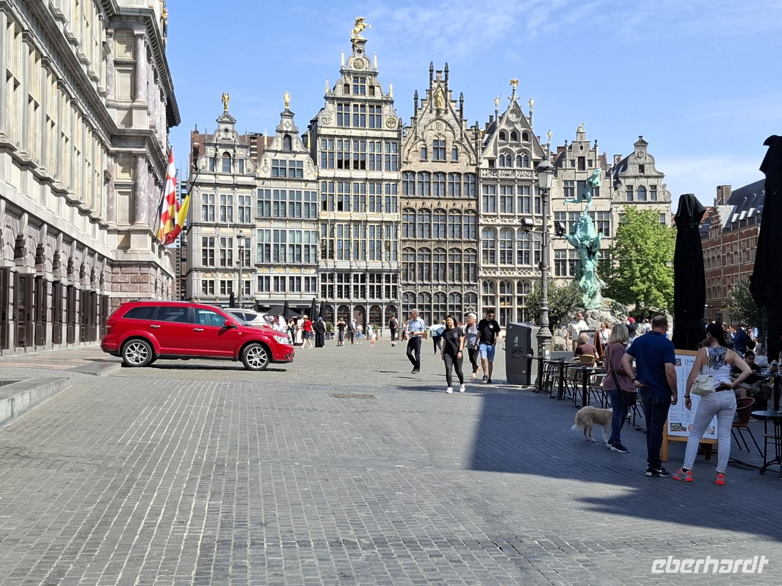 Nicht weit entfernt ist von hier der „Groote Markt“ – ähnlich wie die meisten der flämischen Hauptplätze umstanden von historischen Zunfthäusern. Bemerkenswert ist das hier platzierte gewaltige Rathaus abgeschlossen - von Cornelis de Vriendt als erster geschlossen im Renaissancestil erbaute Profanbau nördlich der Alpen. In der Marktmitte konnte man den großen Brabo-Brunnen bestaunen. Dieses Kunstwerk, 1887 von dem Antwerpener Bildhauer Jef Lambeaux geschaffen, soll die Legende der Namensgebung Antwerpens wiedergeben: ein Riese tyrannisierte einst die Schelde-Schifffahrt und kassierte die Schiffergilde ab. Der mutige Hauptmann Silvius Brabo besiegte ihn, hieb dem Getöteten symbolisch die rechte Hand ab und warf sie in die Schelde. Aus „Hand te werpen“ bezog Antwerpen angeblich seinen Namen und zu Ehren des Befreiers Brabo nannte man sogar die ganze Gegend nach ihm - „Brabant“.