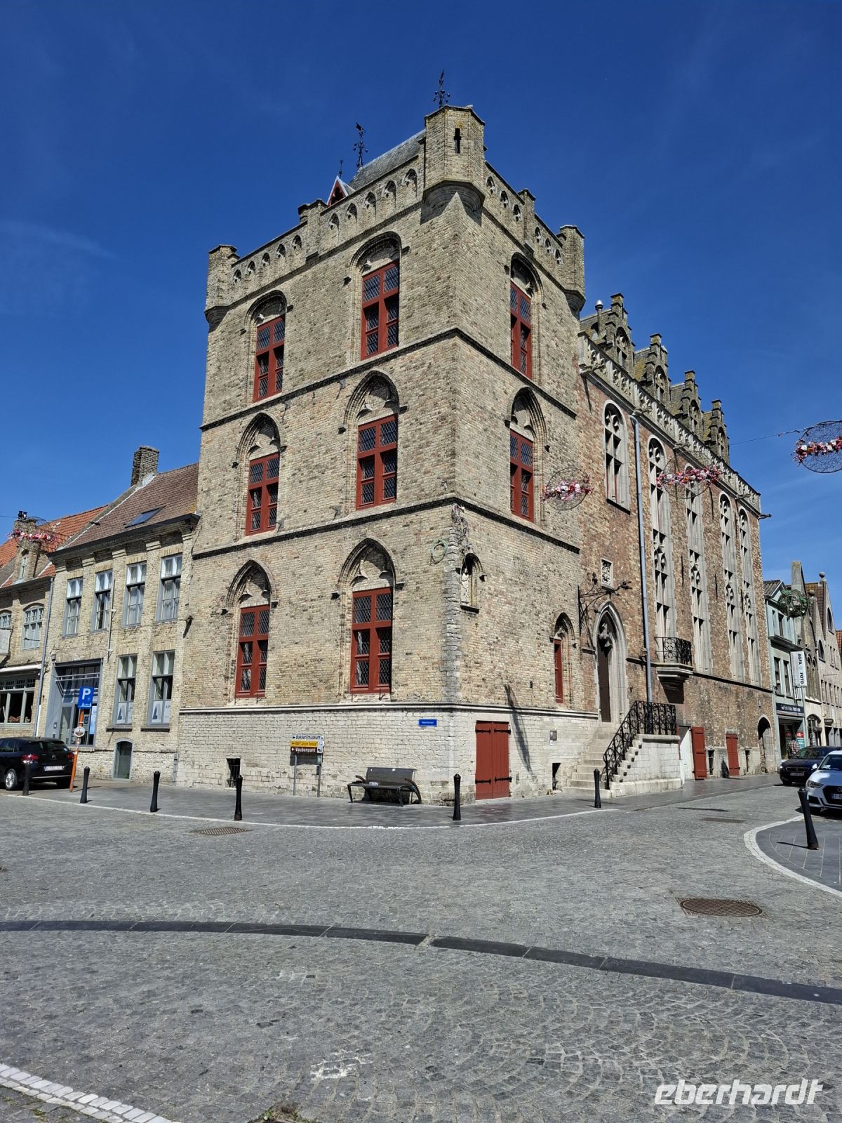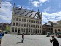 Als letztes heutiges Ziel erreichten wir nachmittags mit dem Bus das hübsche flämische Städtchen Veurne. Einst eine ziemlich große spanische Festung im sogenannten „achtzigjährigen Krieg“, in dem sich sieben niederländische Provinzen von der spanischen Herrschaft befreiten, hat das Städtchen bis heute viele schöne historische Gebäude zu bieten und wartet mit einem gut erhaltenen großen rechteckigen Markt auf sowie mit reizvoller Historie. Das alte Rathaus – „Stadhuis“ - und daran anschließend der Justizpalast mit dahinterliegendem Belfried, der wie schon alle anderen Gesehenen auch zum UNESCO-Welterbe gehört stammen alle aus dem frühen 17. Jahrhundert. Auf der anderen Marktseite gibt es noch einen spätgotischen Wohnturm: Heute als der „Spanische Pavillon“ bekannt, wurde das im 15. Jahrhundert erbaute Gebäude ursprünglich als Rathaus genutzt. Nach etwas Freizeit hier im idyllischen Veurne kehrten wir zum letzten Abendessen nach Brügge zurück, denn am nächsten Tag hieß es, Abschied zu nehmen von Belgien…
