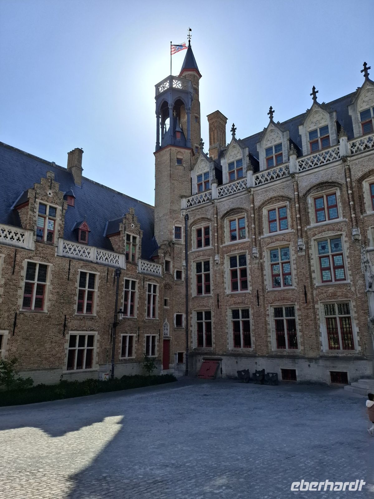 Mit Stopp im „Gruuthuse“, Brügges schönstem Adelspalast, setzten wir den Rundgang fort. Nach dem Passieren des Ausblickes auf die „Rozengracht“ – einen der meist fotografierten Plätze in Brügge – überquerten wir den alten Marktplatz „Huidenvettersplein“ und erreichten, am alten Fischmarkt und dem ehemaligen Haus des Spanischen Vizekönigs vorbei, der sogenannte „Burg“. Hier liegt der sagenhafte Gründungsort Brügges, an dem sich heute das berühmte und reich verzierte hochgotische Rathaus sowie die nicht minder bekannte Heiligblutkappelle befinden. Diese romanisch/gotische Doppelkapelle hat ihren Namen von der hier bewahrten Heiligblut-Reliquie.