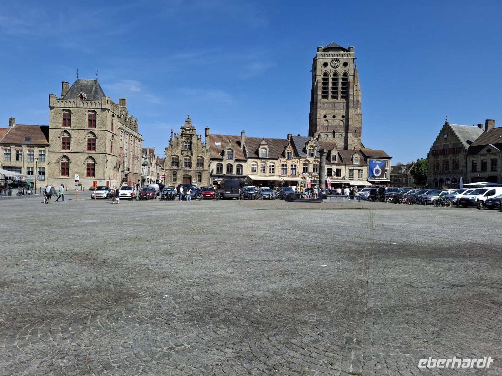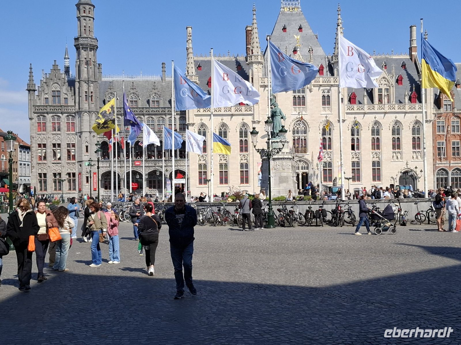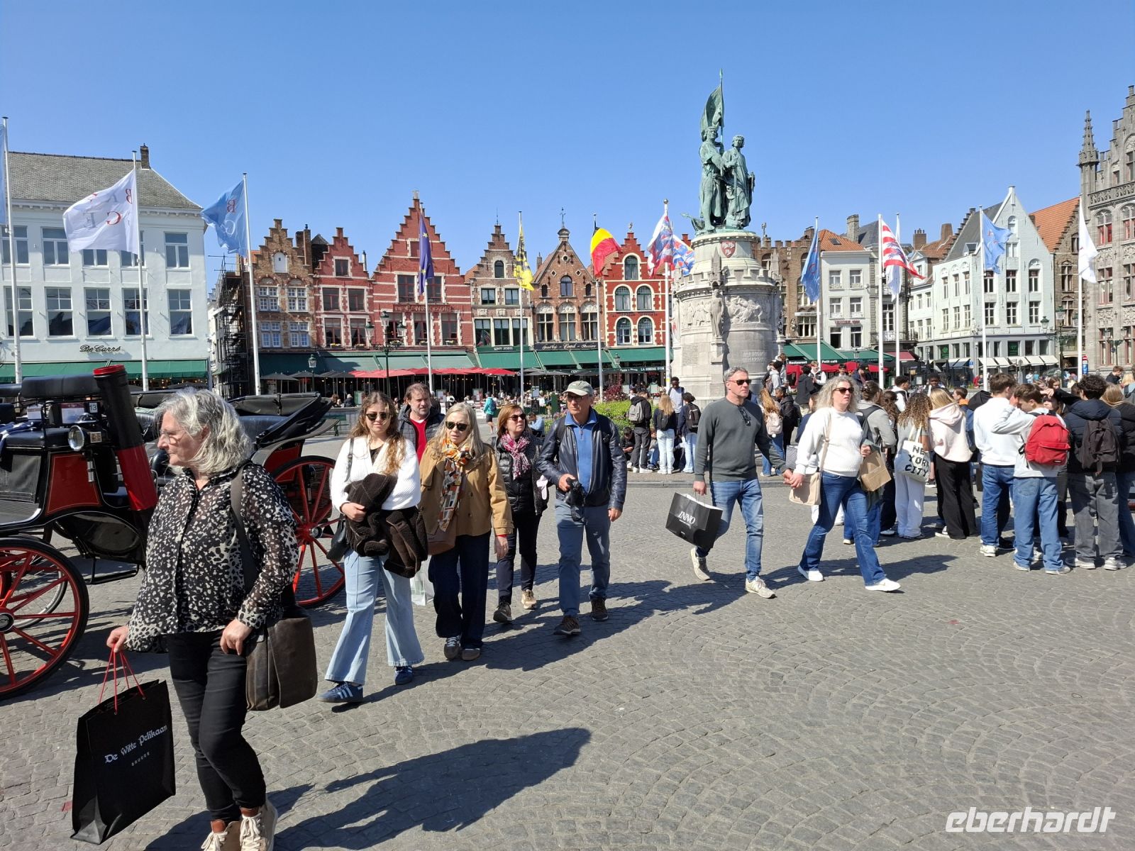Der Rundgang endete dann am „Groote Markt“. Gesäumt von alten Patrizierhäusern im gotischen Renaissancestil, dem Nachbau einer alten Tuchhalle und der früheren Post mit heutigem „Biermuseum“, wird der Markt beherrscht von der imposanten Präsenz des wuchtigen Belfried. Der ist ebenfalls UNESCO-Weltkulturerbe und befindet sich in einer Art Stadtburg mit 83 m hohem Turm. In der Mitte des Marktplatzes steht die Statue der flämischen Nationalhelden Pieter de Koninck und Jan Breydel, die im Jahre 1302 die Feindschaft ihrer Städte überwanden und in gemeinsamem Kampf die Unabhängigkeit Flanderns gegen ein französisches Ritterheer bewahrten.