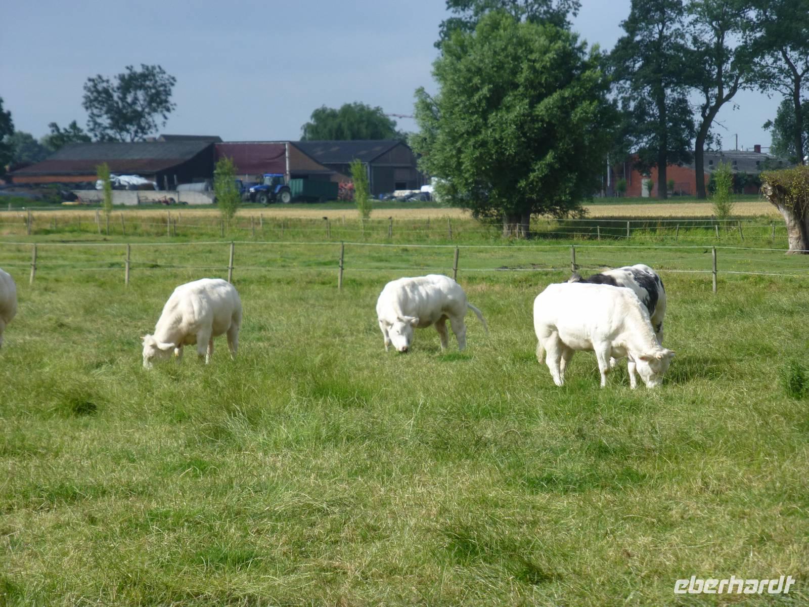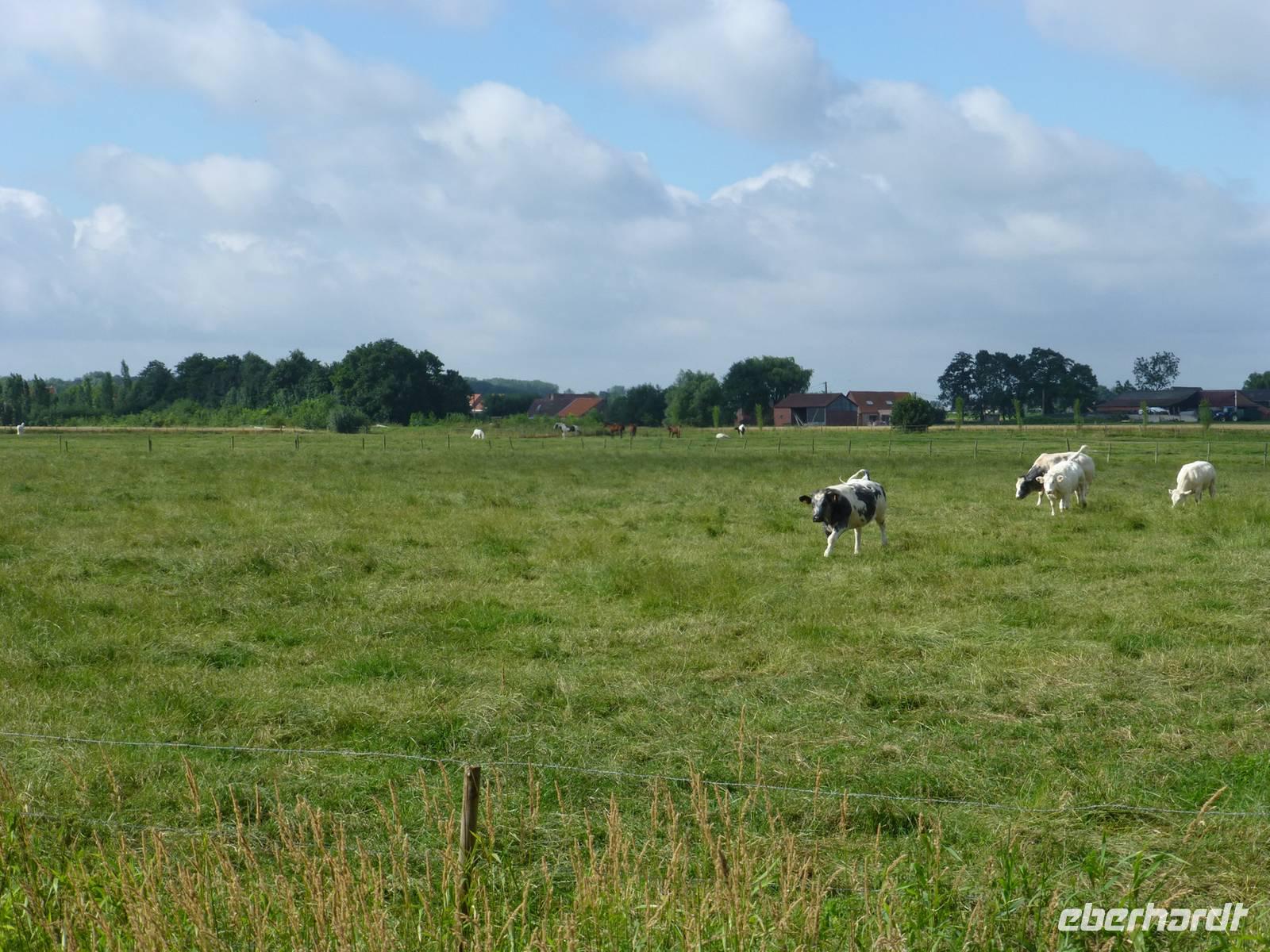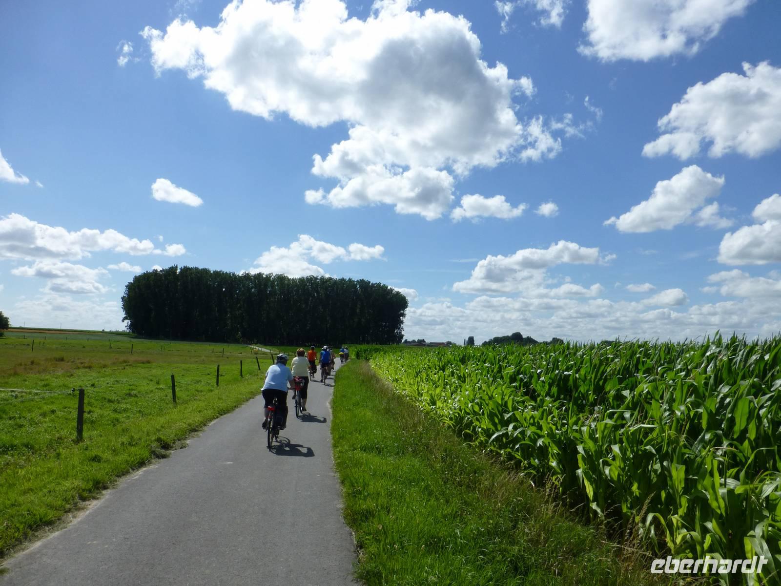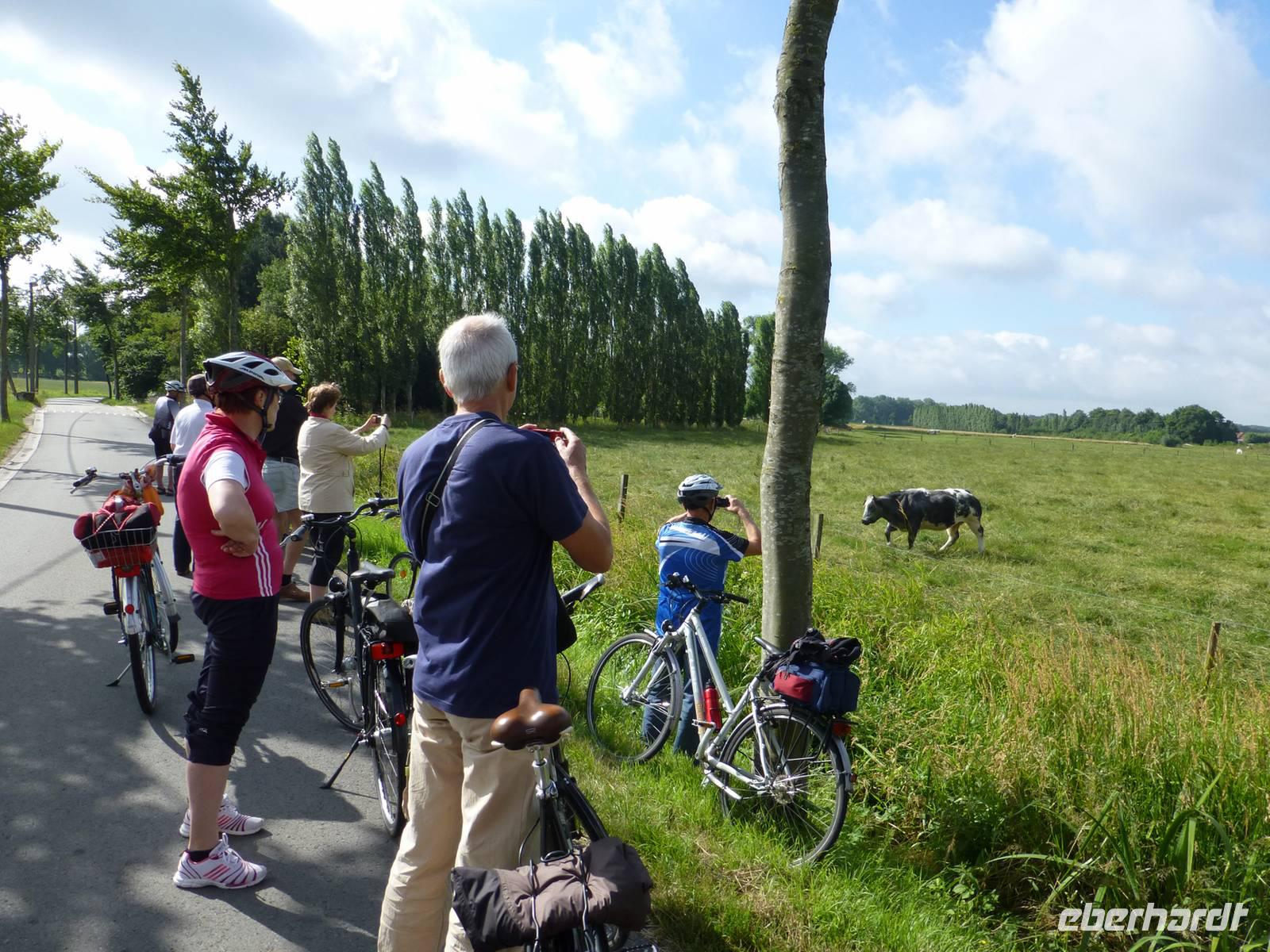 Die letzte Radtour der Reise führte uns nach Ypern, wo vorallem im ersten Weltkrieg erbitterte Schlachten getobt haben. Im „In Flandern Fields - Museum" war diesem Thema eindrucksvoll und interaktiv dargestellt. In Gedenken an die Gefallenen führt rund um Ypern und vorbei an zahlreichen Soldatenfriedhöfen eine 45 Kilometer lange Friedensroute. Einen Teil dieser Strecke, also von Ypern nach Langemark, fuhren wir mit dem Fahrrad über die damaligen Schlachtfelder. Es war eine sehr angenehme Fahrt durch die hügelige Idylle. Die Sonne strahlte vom Himmel, auf den Feldern wuchs Getreide, Möhren und anderes Gemüse und die „Blauen Belgier" (eine besondere Kuhrasse) grasten friedlich auf den Weiden. Kaum vorstellbar, dass hier vor fast hundert Jahren so viele Menschen grausam ums Leben kamen.