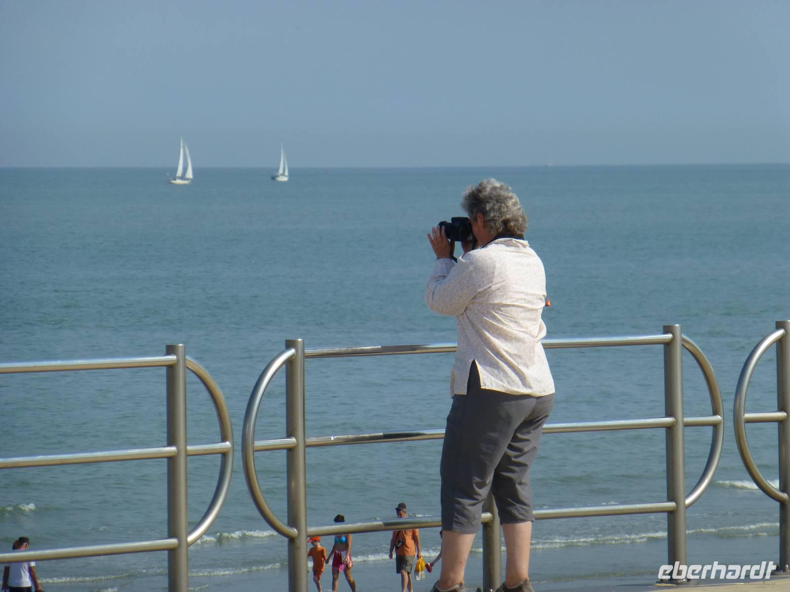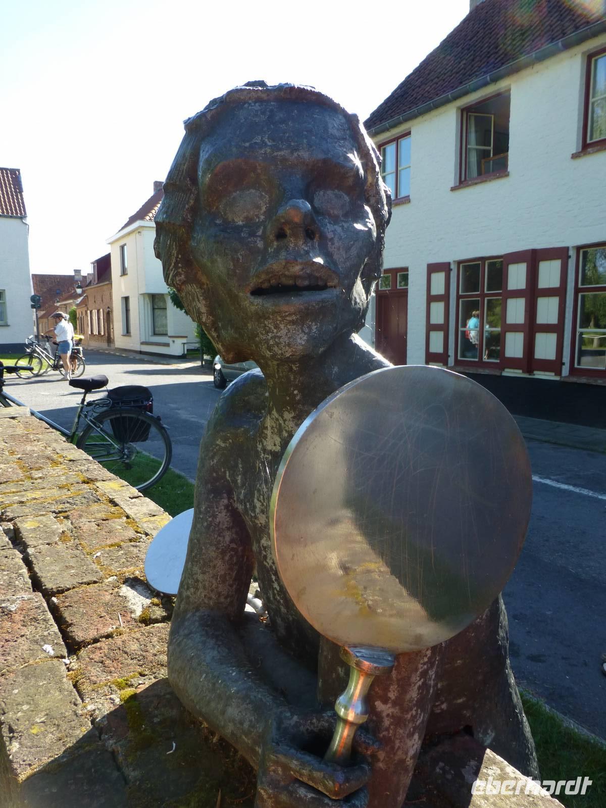 Bei strahlendem Sonnenschein und 34 Grad fuhren wir heute mit dem Rad von Brügge an die Nordseeküste. An den Kanälen führte uns der gut ausgebaute Fahrradweg bis nach Damme. Hier soll angeblich, nach belgischer Überlieferung, der Schalk Till Eulenspiegel begraben liegen. Reiseleiterin Sandra erzählte uns von der Entstehung dieses Gerüchts. Über die Felder und weiter entlang der Kanals radelten wir weiter bis in den belebten Badeort Knokke Heist. Die vom warmen Wetter der letzten Wochen erwärmte Nordsee bot nicht ganz die erhoffte Abkühlung, trotzdem war der Aufenthalt am Sandstrand eine tolle Möglichkeit zu entspannen. Durch die Dünen und das Vogelnaturschutzgebiet fuhren wir weiter über die Felder bis über die niederländische Grenze nach Sluis, wo wir eine Pause in einem der zahlreichen niedlichen Cafés einlegten. Die letzten 20 Km zurück bis nach Brügge ging es wieder am Kanal entlang.