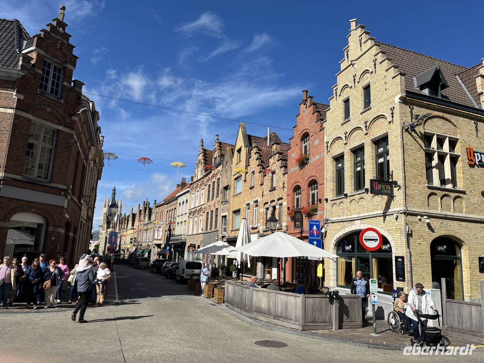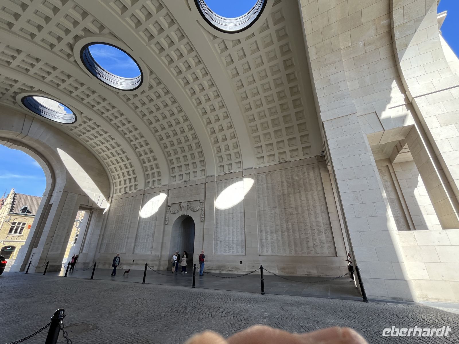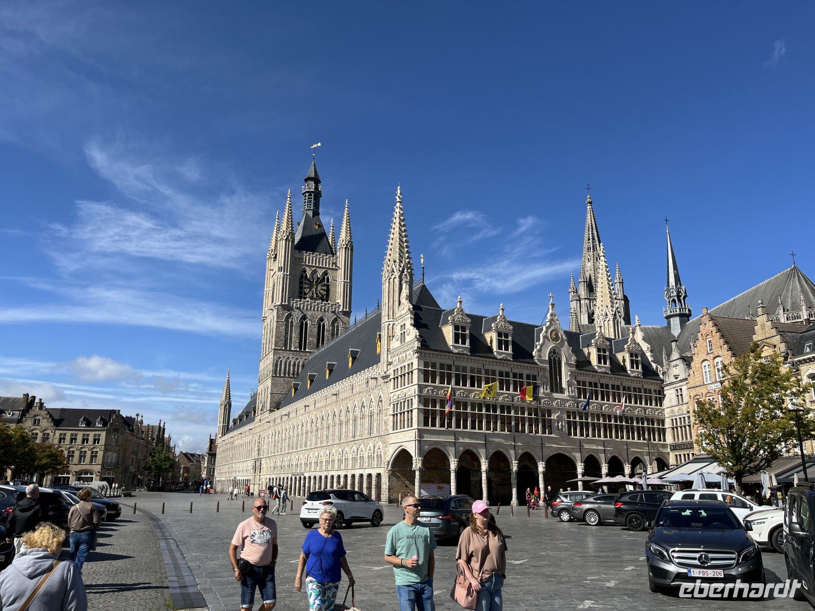 Wir fuhren mit dem Bus nach Ypern und stiegen dort am Markt aus. Sofort beeindruckten uns die Tuchhalle und der Belfried. Auch die schönen alten Häuser am Markt gefielen unbs sofort. Der Stadtführer erzählte uns von der Geschichte der Stadt im Mittelalter. Reich geworden durch den Tuchhandel investierten die Bürger ihr vieles Geld in die schönen Gebäude. Ypern lag im ersten Weltkrieg direkt an der Frontlinie und wurde komplett zerstört. Die vielen mittelalterlichen Gebäude sind alle nach dem Krieg neu erbaut wurden. In der Stadt gibt es viele Erinnerungsstätten an den Krieg. Wir besuchten die Meenenport, ein Erinnerungstor und die St. Georgskirche.