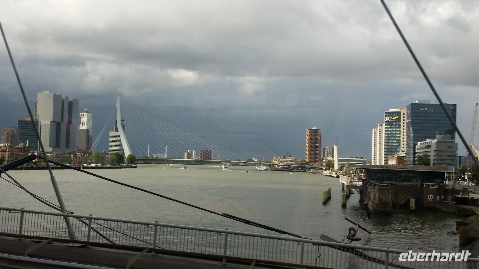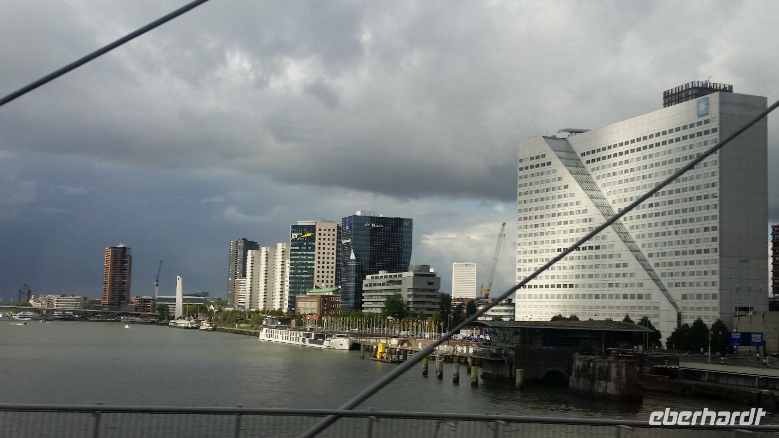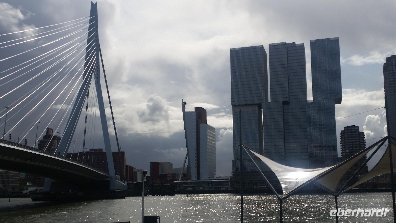 Geprägt durch den größten Hafen Europas und somit auch größten Arbeitgeber am Ort. Die große Erasmusmusbrücke überspannt die Maas. Also „Klein Manhattan" an der Maas Ei