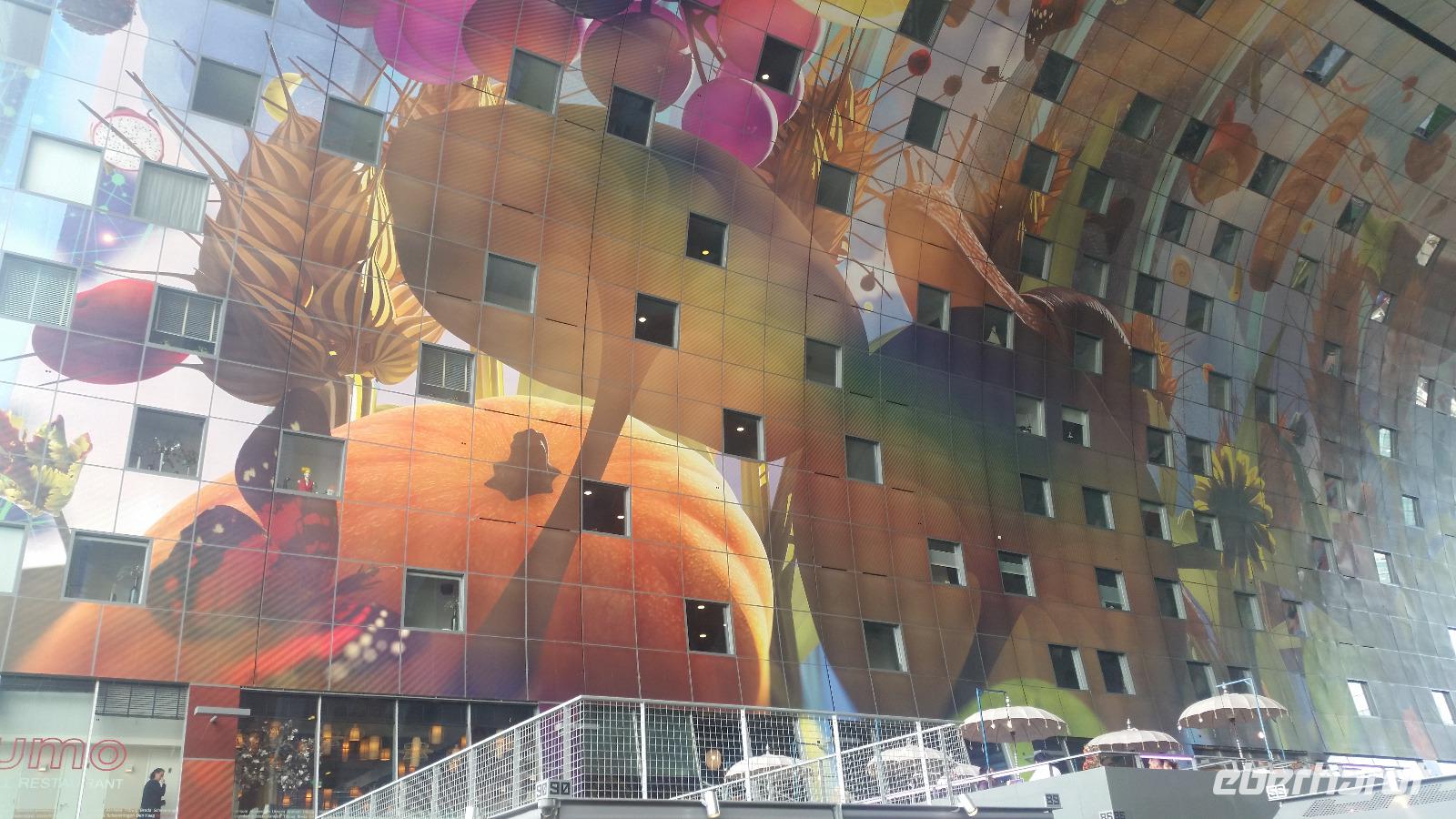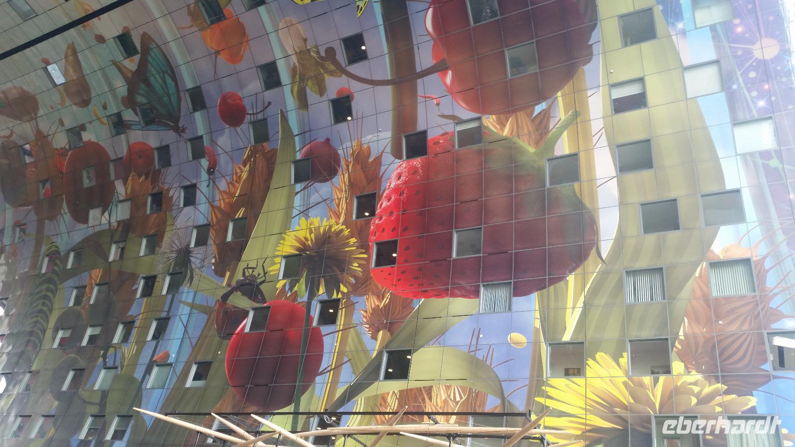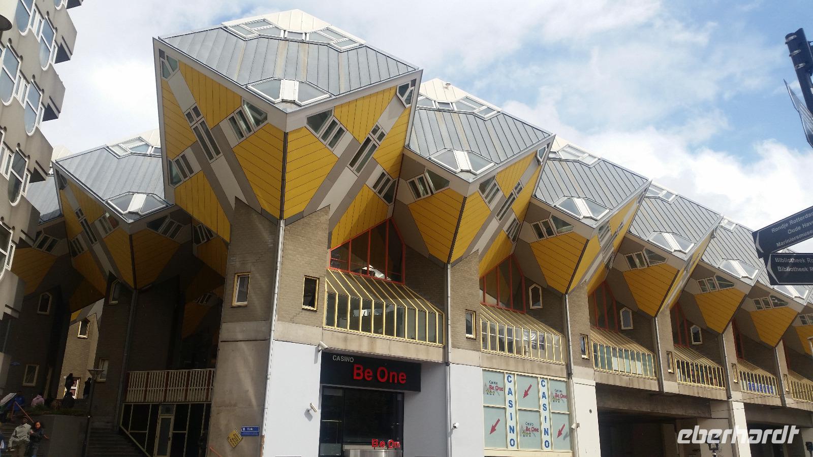 Eine Hafenrundfahrt darf hier nicht fehlen. Wir erahnen die Größe des Euroports. Leider beginnt es zu Regnen. So machen wir noch einen Abstecher zur Markthalle. Sie ist wie ein Flugzeughanger gebaut. An Ihrer über 11.000 Quadratmeter großen Decke sind Obst- und Gemüse Malereien zu sehen. Auch lebt man in dieser Halle Nach außen zeigen die Fenster der Wohnungen. Nebenan stehen gleich die Kubushäuser. Schade, dass keine Zeit bleibt, eines als Museum eingerichtetes von innen zu betrachten.
