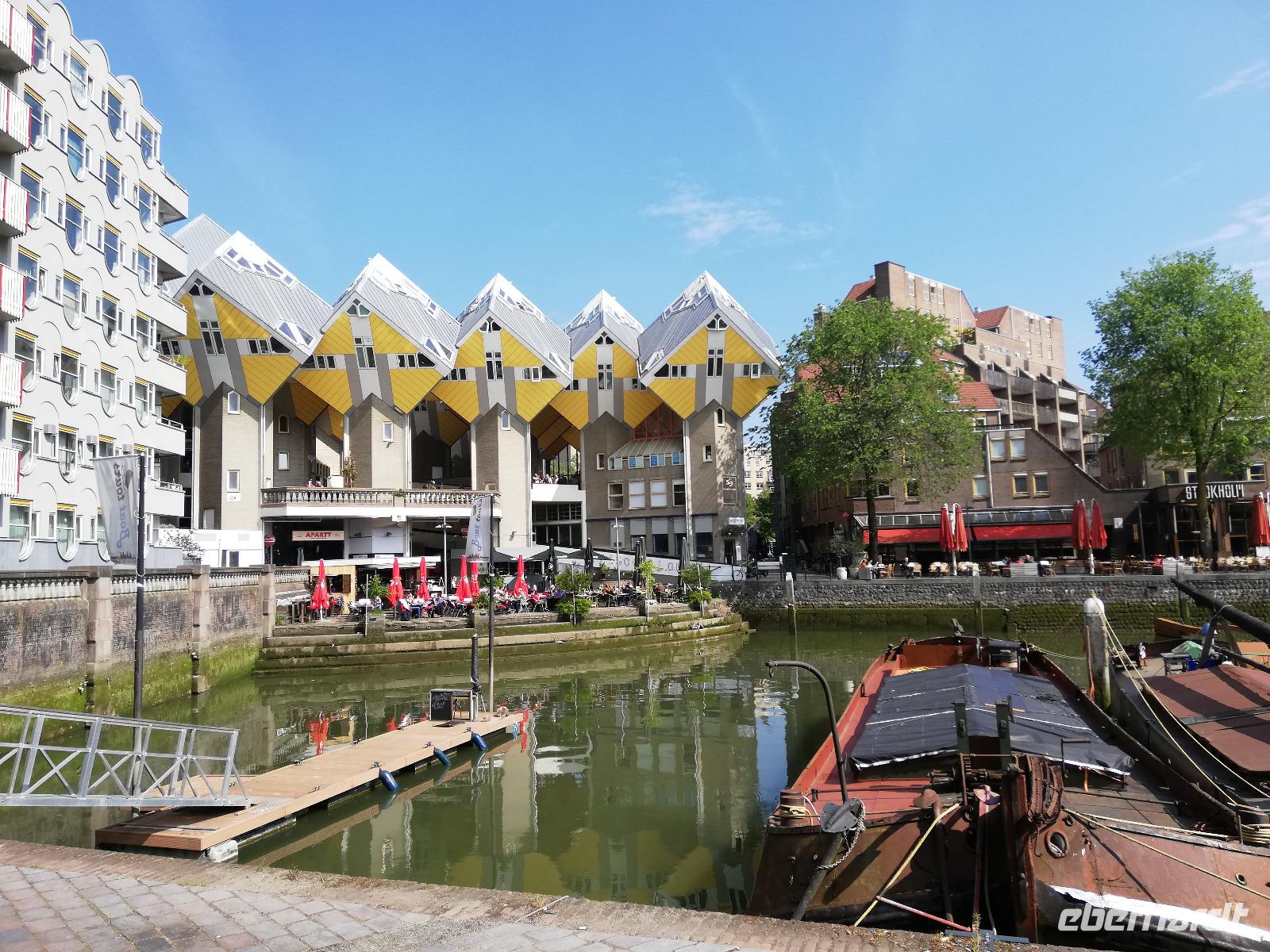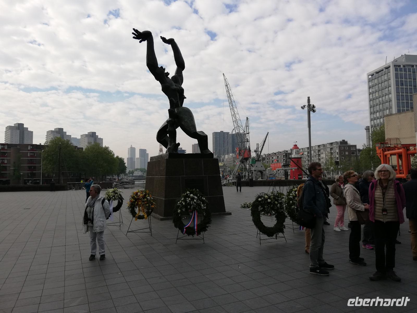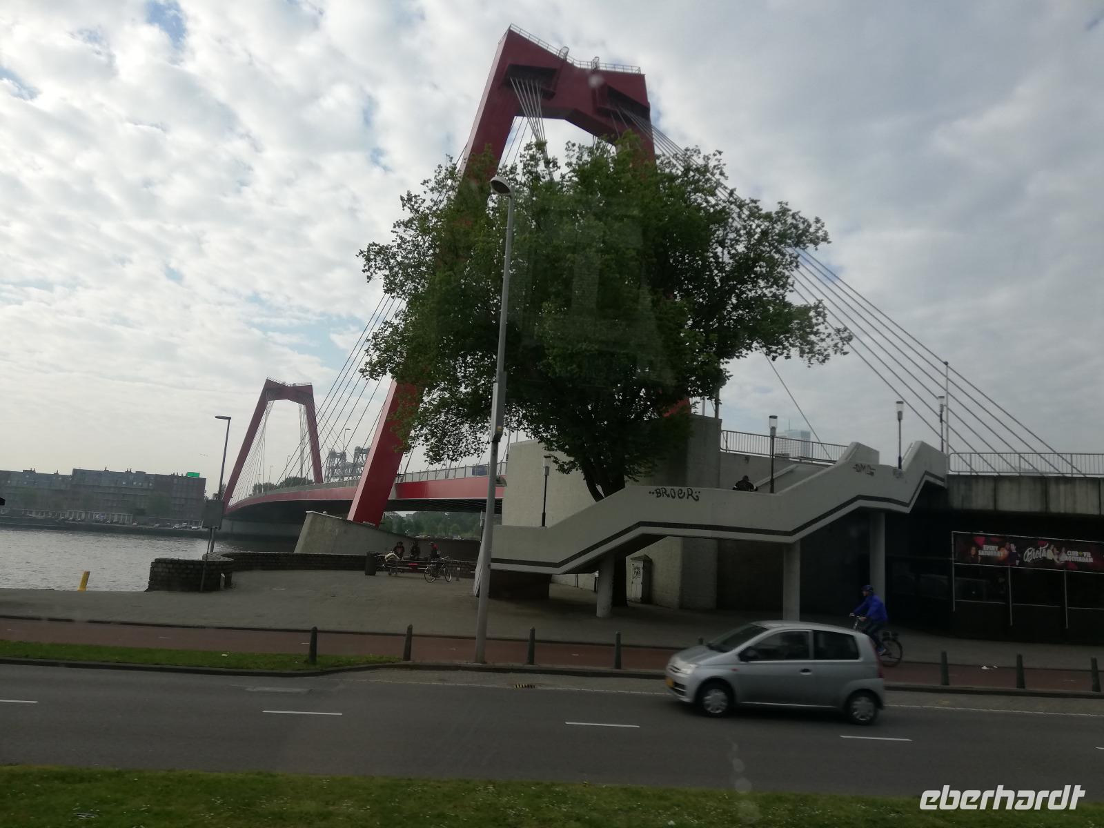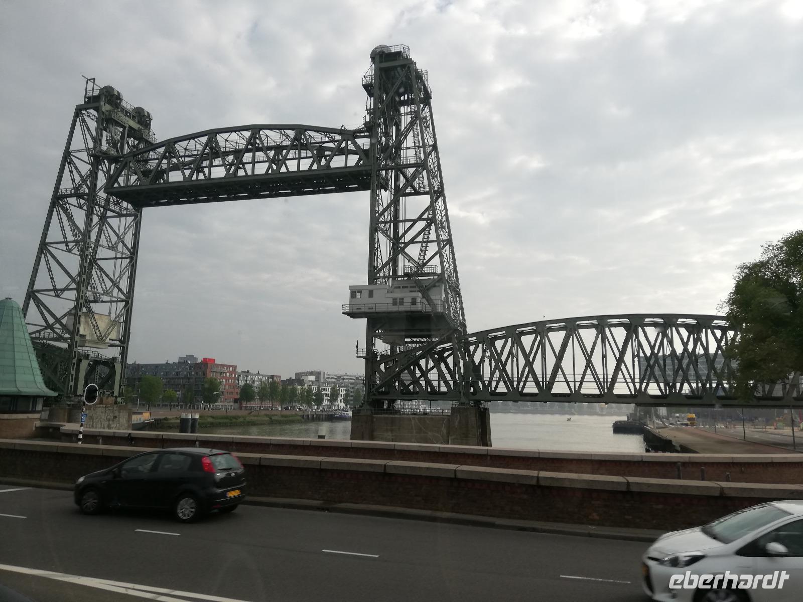 Erasmusbrücke,die über der neuen Maas das Stadtzentrum mit dem Kop van Zuid verbindet.Wir fahren aber zuerst über die Willemsbrug, die an die Golden Gate Bridge in San Francisco erinnert, um in den Süden der Stadt zu gelangen. Zurück fahren wir über die Erasmusbrücke. um in die Stadtmitte zu gelangen. Am Denkmal die „ Die zerstörte Stadt" steigen wir aus dem Bus und spazieren durch die Stadt. Das Denkmal erinnert an die Bombardierung der Stadt durch die deutsche Luftwaffe im 2. Weltkrieg. Dabei wurde das Zentrum der Stadt nahezu vollständig zerstört. Weiter führt uns der Rundgang an die St. Laurenz Kerk,danach sehen wir die Markhalle, die sehr beeindruckend ist und 2014 eröffnet wurde.Auch die Kubushäuser faszinieren uns. Hans spaziert mit uns durch die interessante Wohnanlage. Nicht weit entfernt sehen wir das