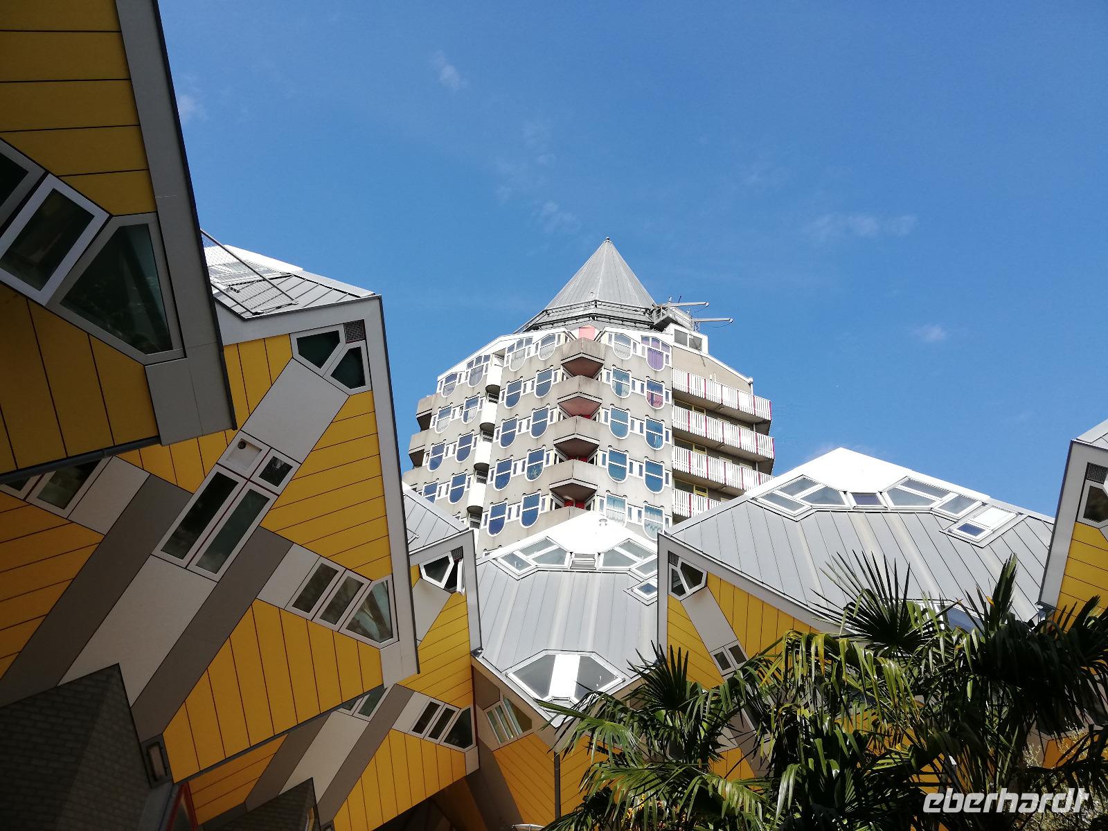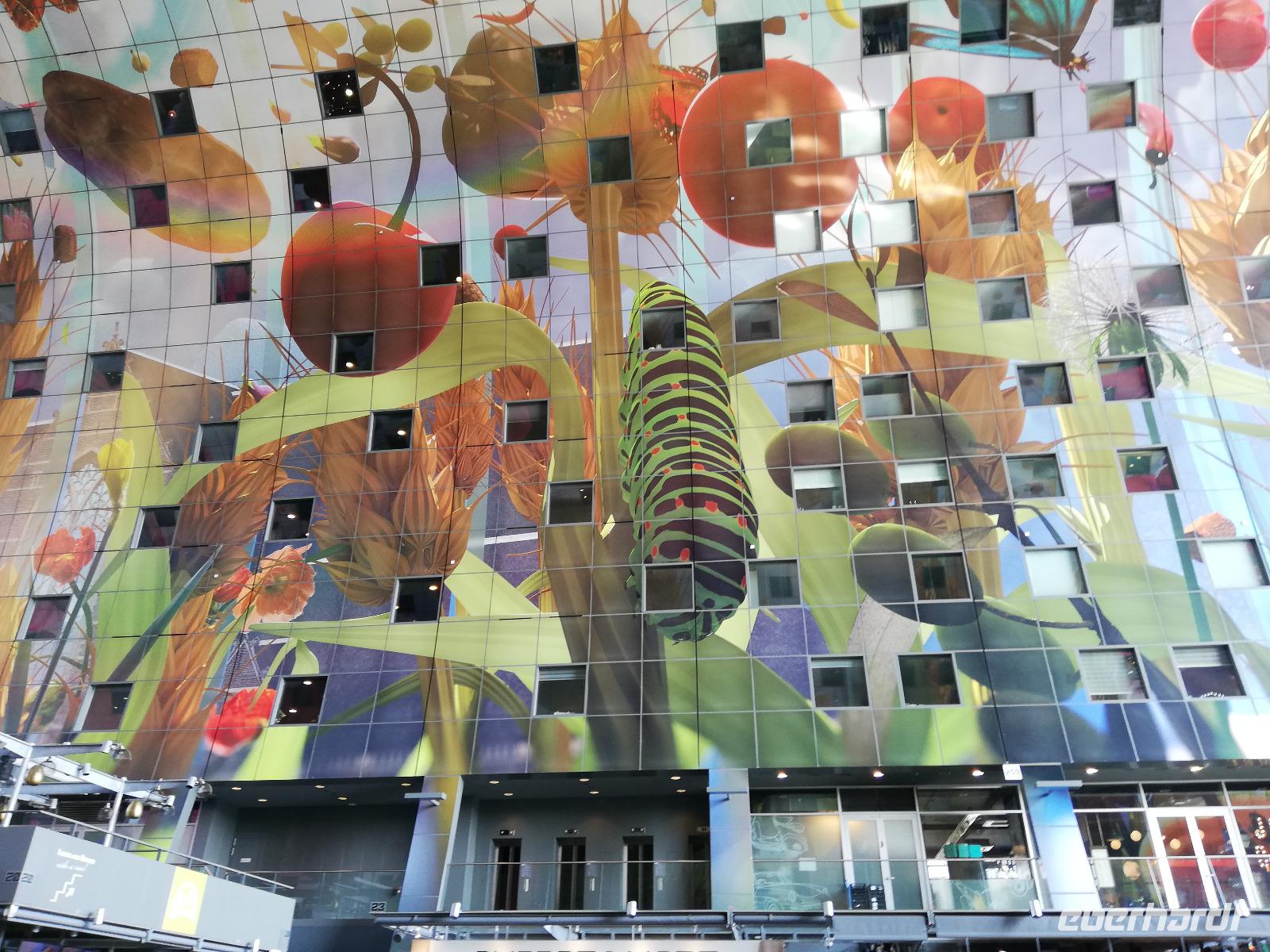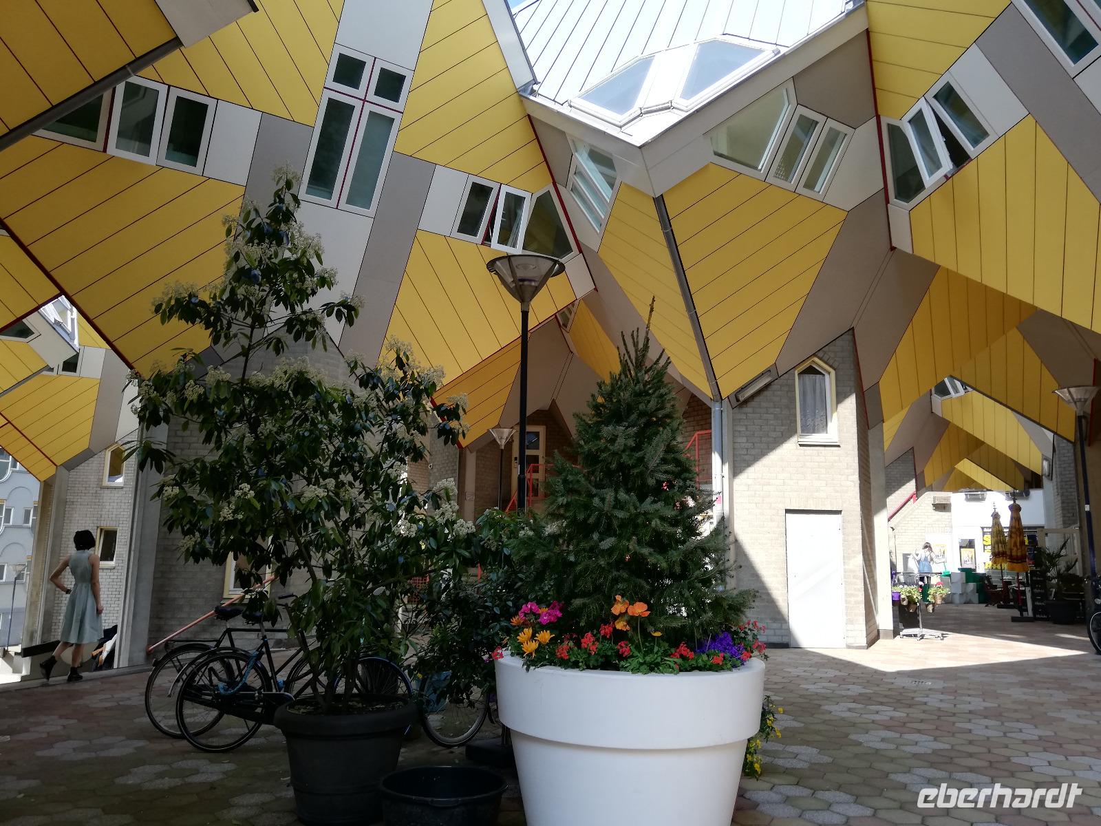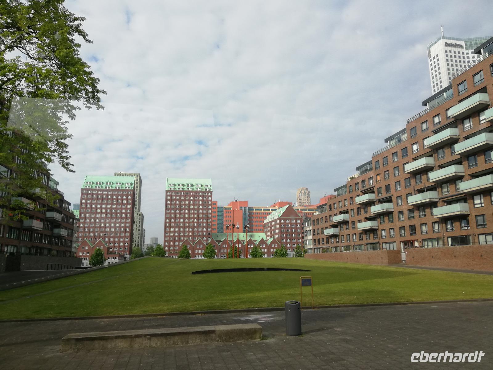 Erasmusbrücke,die über der neuen Maas das Stadtzentrum mit dem Kop van Zuid verbindet.Wir fahren aber zuerst über die Willemsbrug, die an die Golden Gate Bridge in San Francisco erinnert, um in den Süden der Stadt zu gelangen. Zurück fahren wir über die Erasmusbrücke. um in die Stadtmitte zu gelangen. Am Denkmal die „ Die zerstörte Stadt" steigen wir aus dem Bus und spazieren durch die Stadt. Das Denkmal erinnert an die Bombardierung der Stadt durch die deutsche Luftwaffe im 2. Weltkrieg. Dabei wurde das Zentrum der Stadt nahezu vollständig zerstört. Weiter führt uns der Rundgang an die St. Laurenz Kerk,danach sehen wir die Markhalle, die sehr beeindruckend ist und 2014 eröffnet wurde.Auch die Kubushäuser faszinieren uns. Hans spaziert mit uns durch die interessante Wohnanlage. Nicht weit entfernt sehen wir das