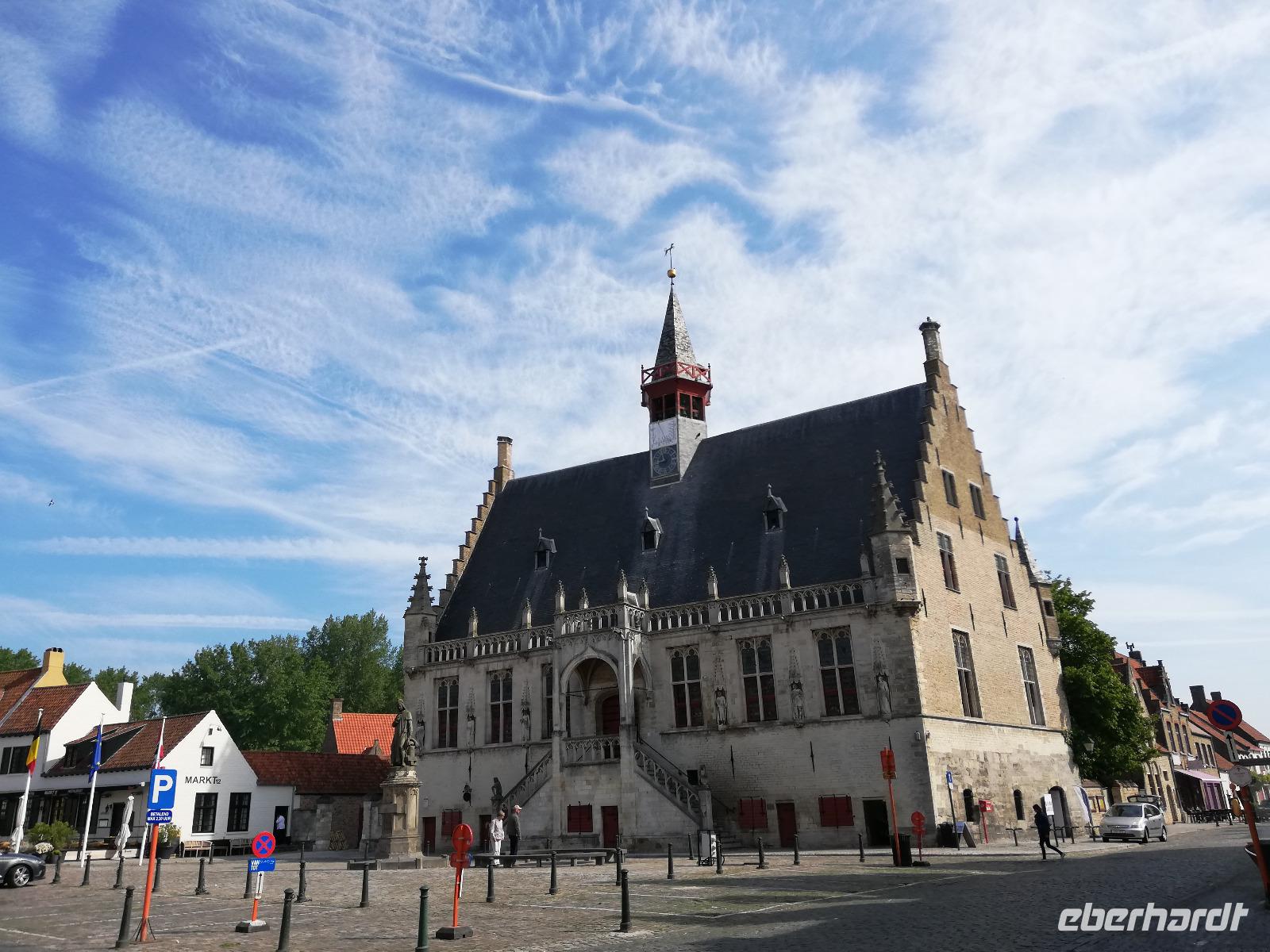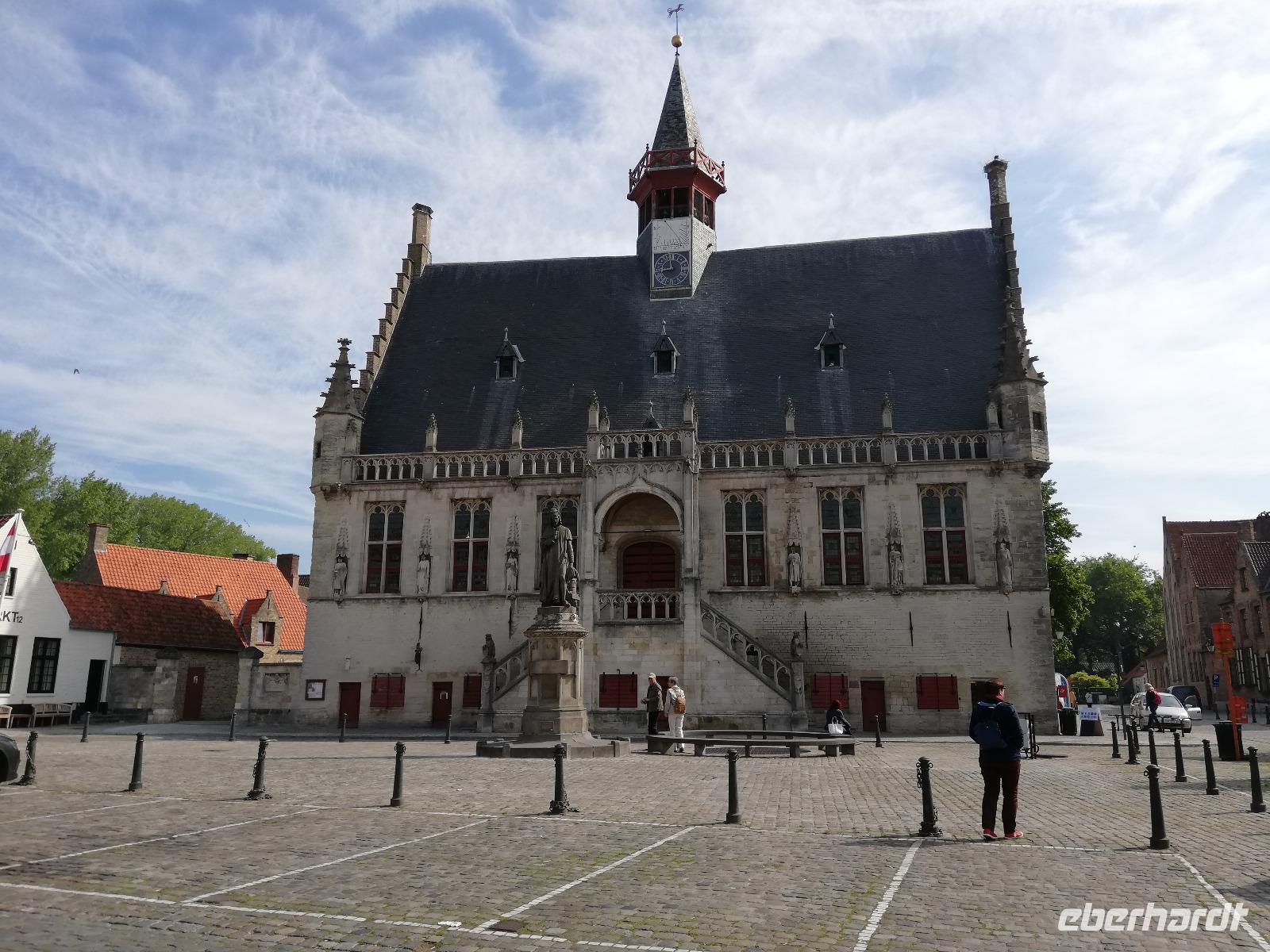 Damme der ehemalige Vorhafen von Brügge rühmt sich als die Buchstadt Nr.1. und literarisch verewigt ist die Stadt als Heimat von Thyl Ulenspiegel. und Lamme Goedzack, den Hauptpersonen aus dem Roman von Charles de Coster. Wir kommen zeitig auf dem Grote Mark mit seinem gotischen Stadthuis an. Es scheint als hätten wir Damme für uns allein.Nur langsam beginnt ein beschäftigtes Treiben. Die Touristen-Info hat geöffnet und hier finden wir allerlei Bücher, die gern von uns gekauft werden. Einen Besuch der Onze -Lieve-Vrouwkerk sollte man nicht verpassen, wenn sie auch noch geschlossen ist. Der Backsteinbau im Stil der Scheldegotik und die Größe der Kirche mit ihren 45 m hohen Turm zeigt welche Bedeutung Damm hatte ,als diese Kirche im 13. Jd. gebaut wurde.
